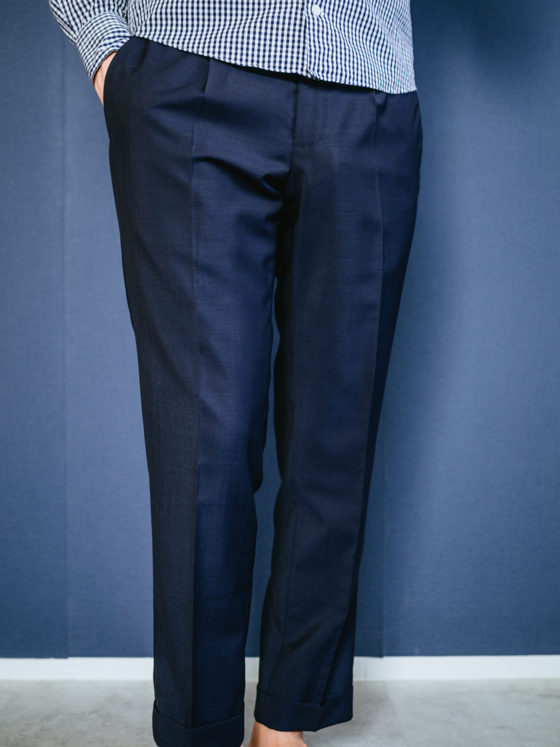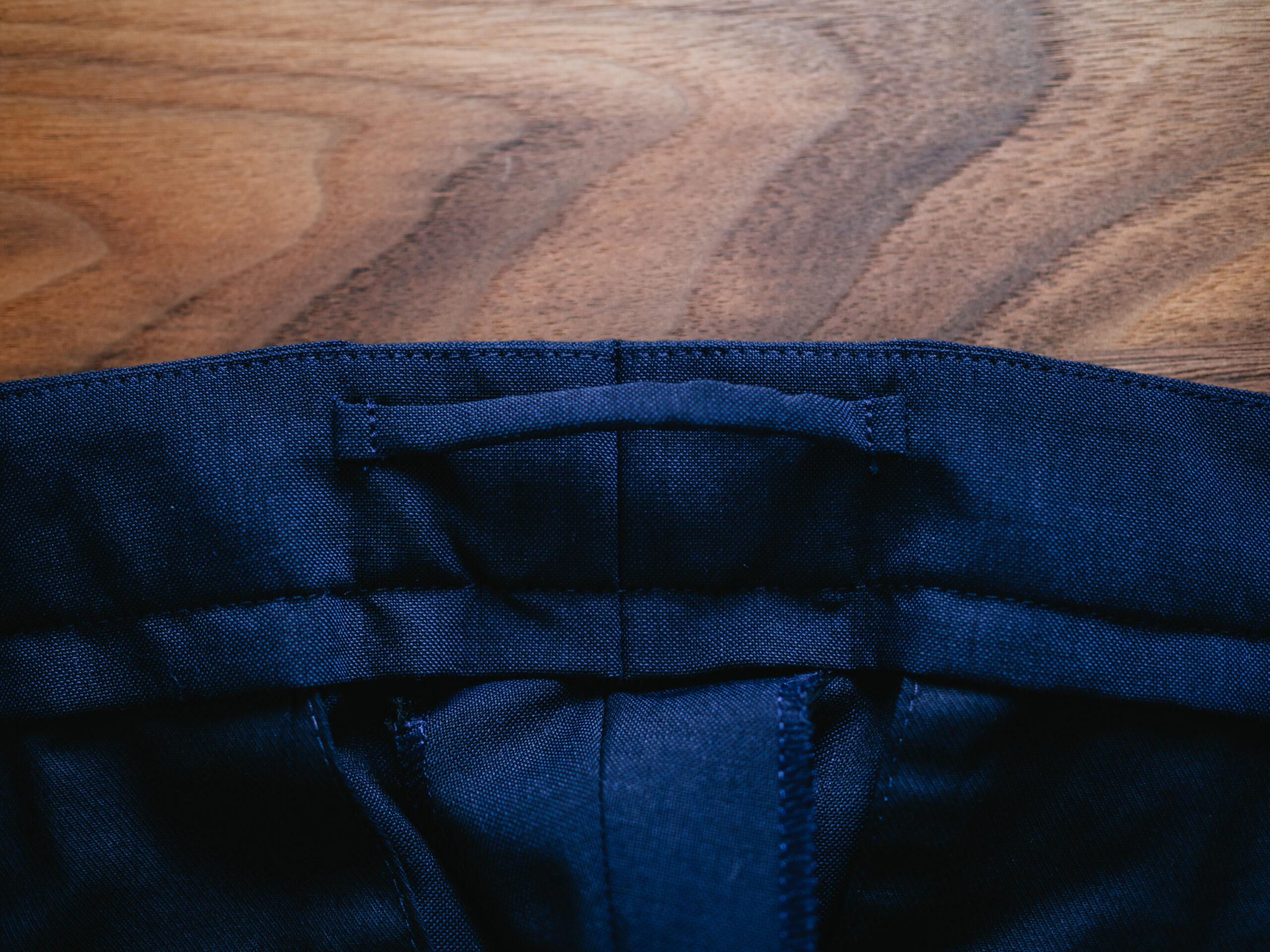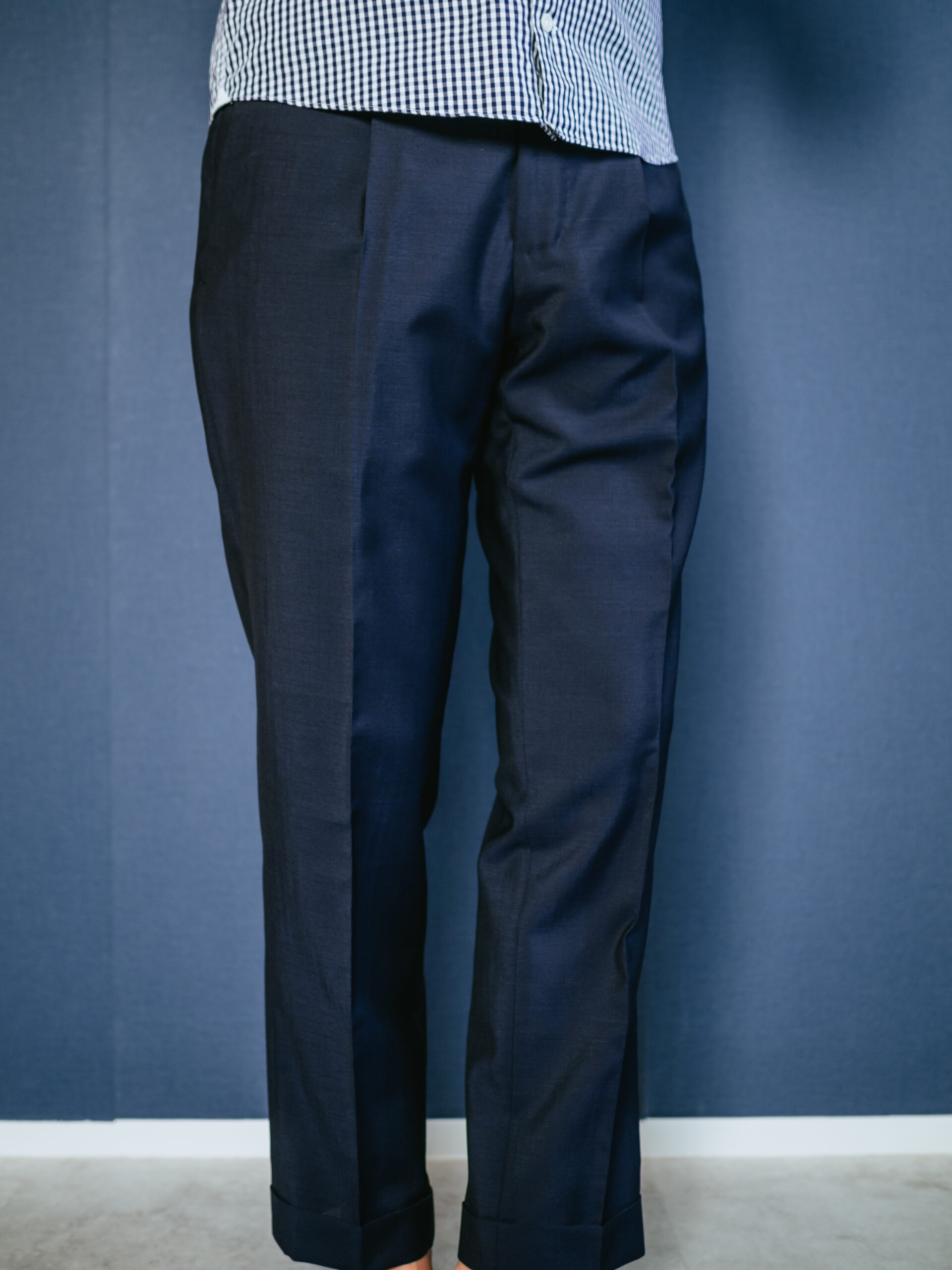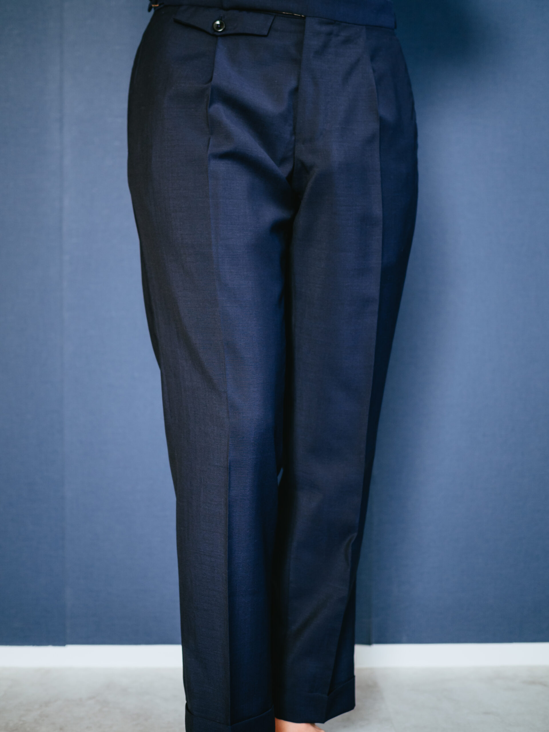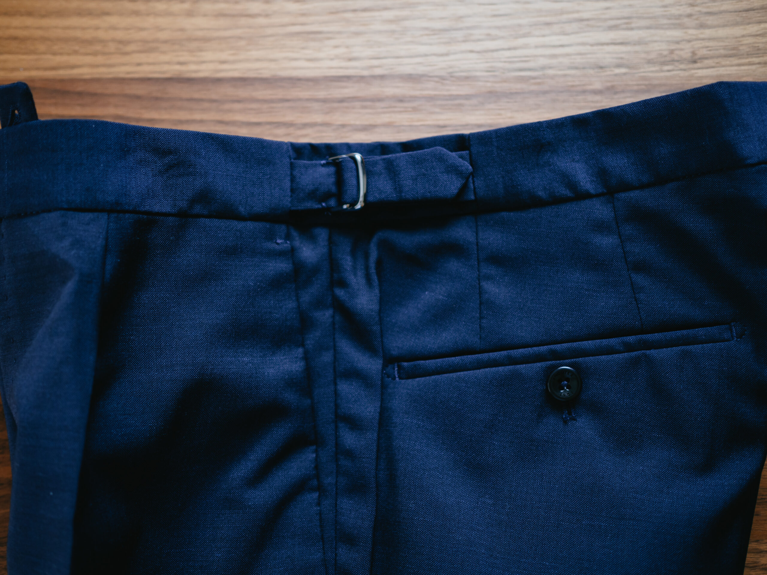 色は少し明るめのネイビー。両サイドにスラントポケット(スラッシュポケット)、補強のかんぬき止め。1プリーツ。サイドアジャスター付き