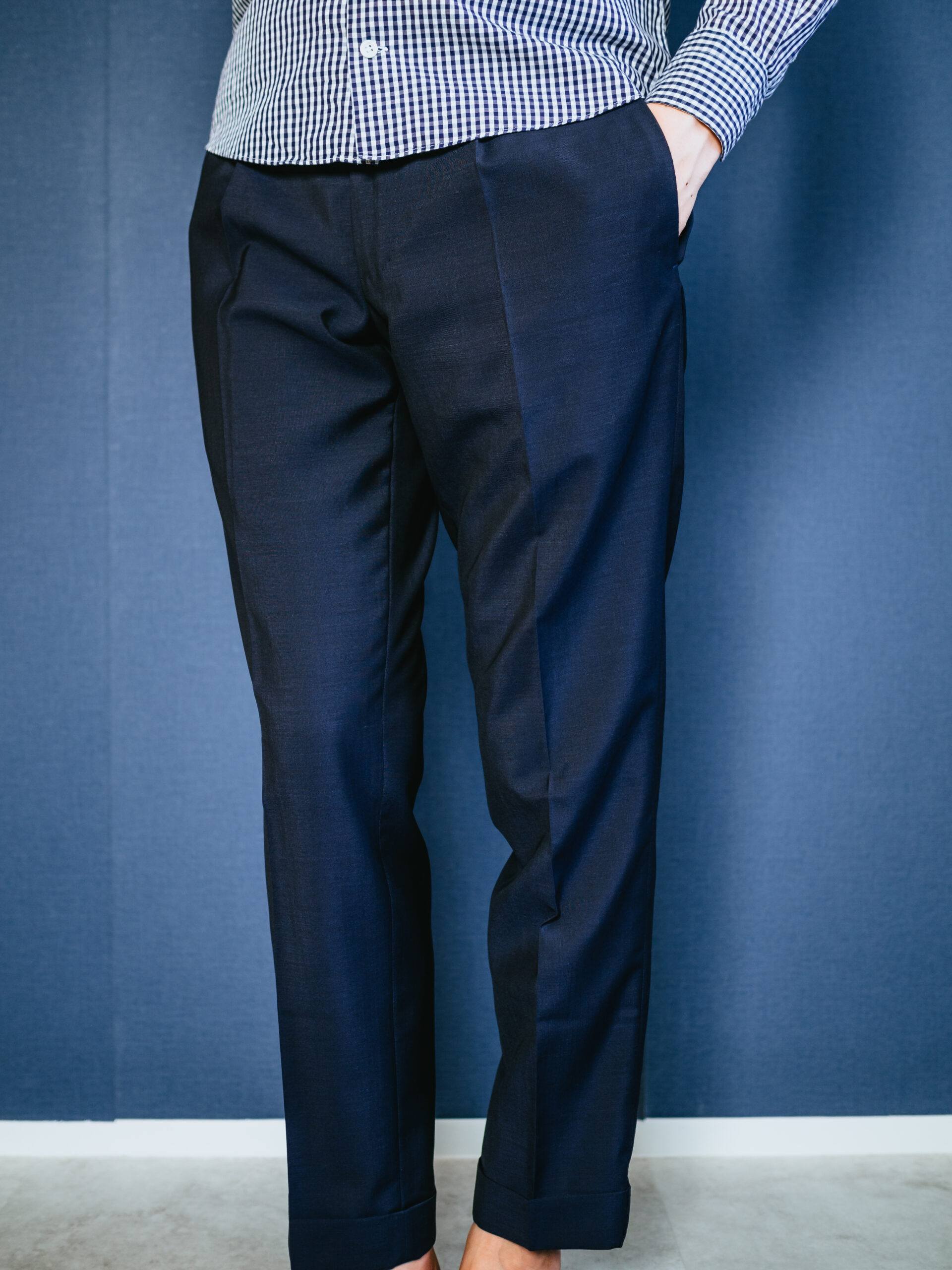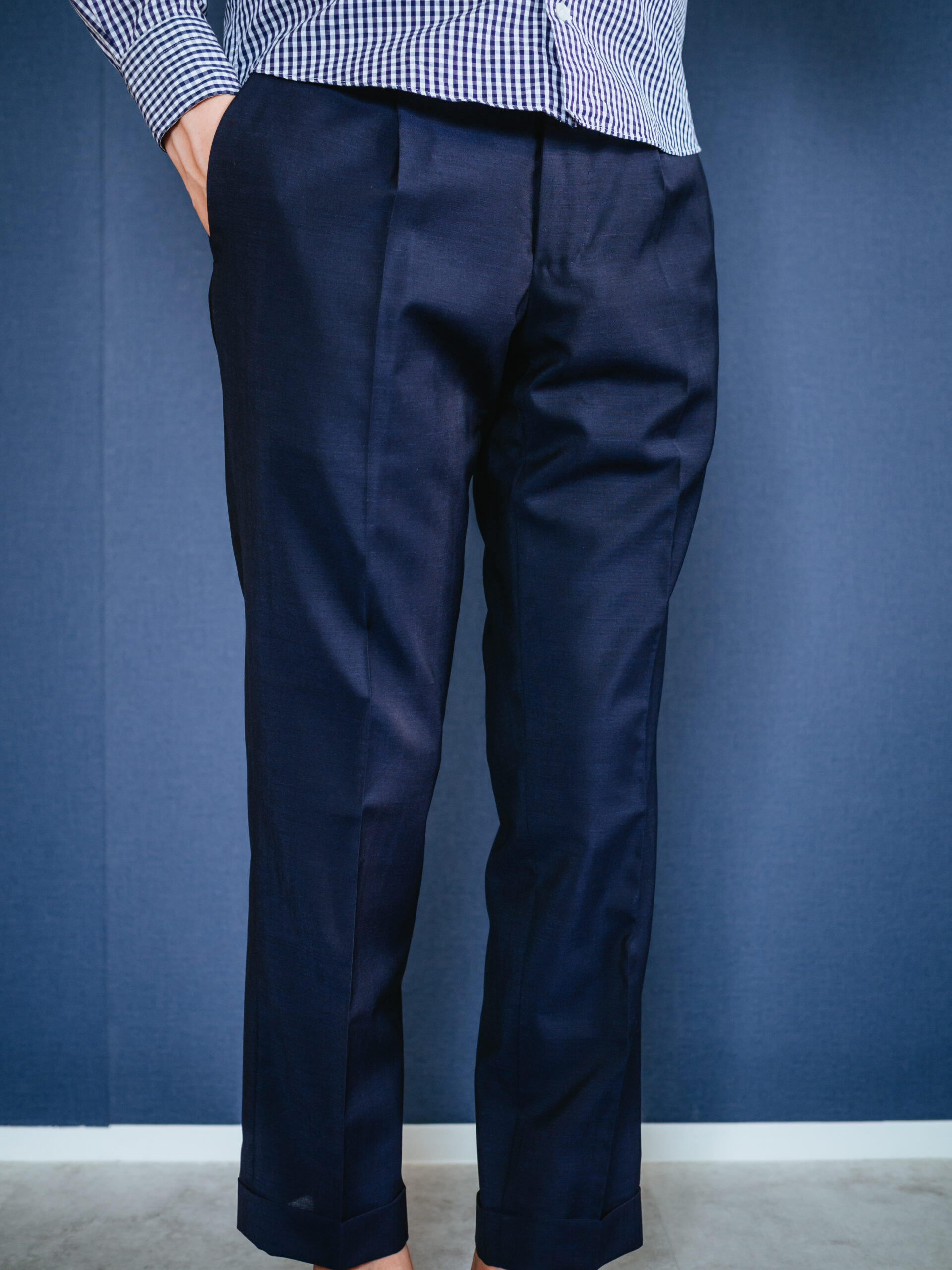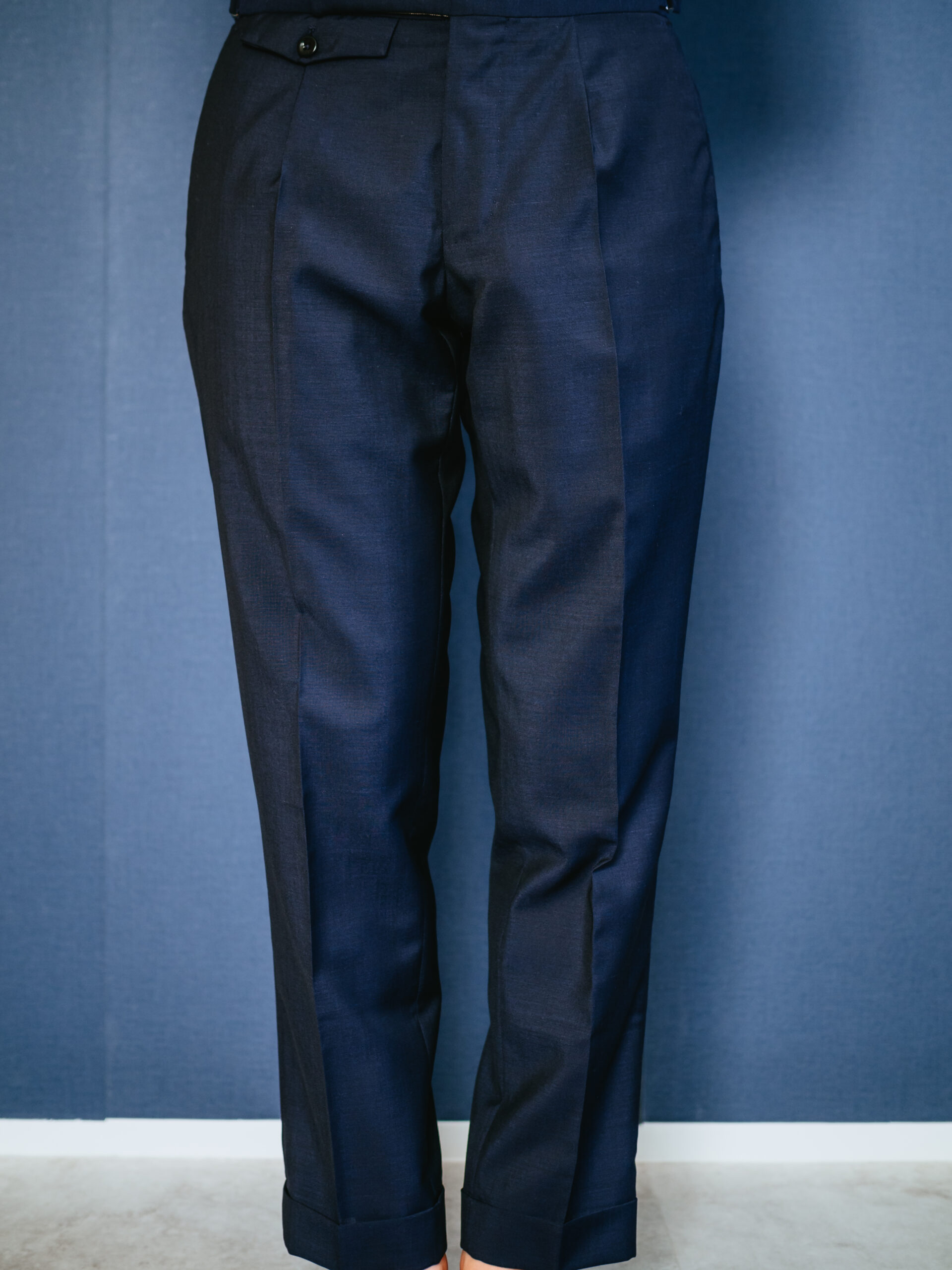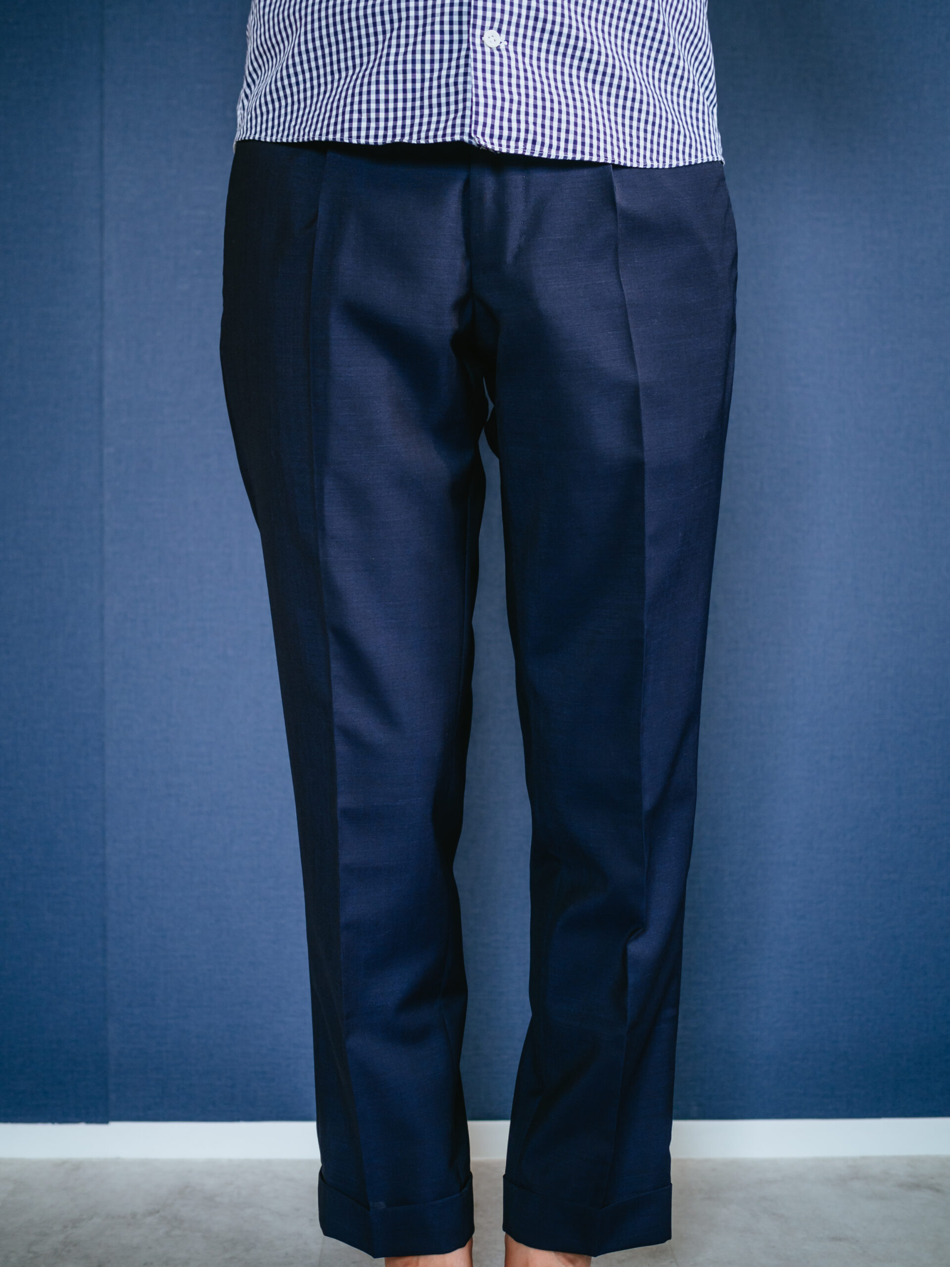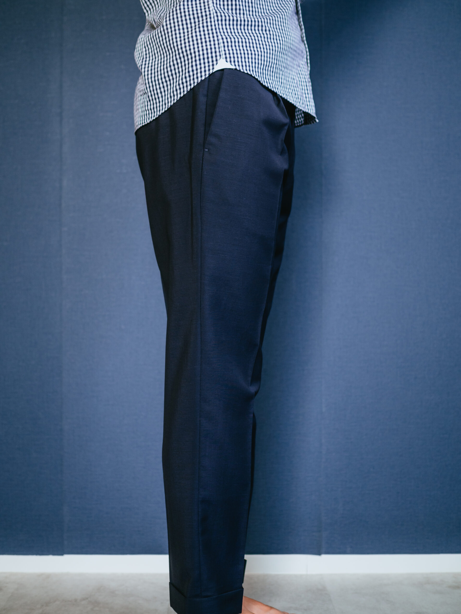 色は少し明るめのネイビー。両サイドにスラントポケット(スラッシュポケット)、補強のかんぬき止め。1プリーツ。サイドアジャスター付き