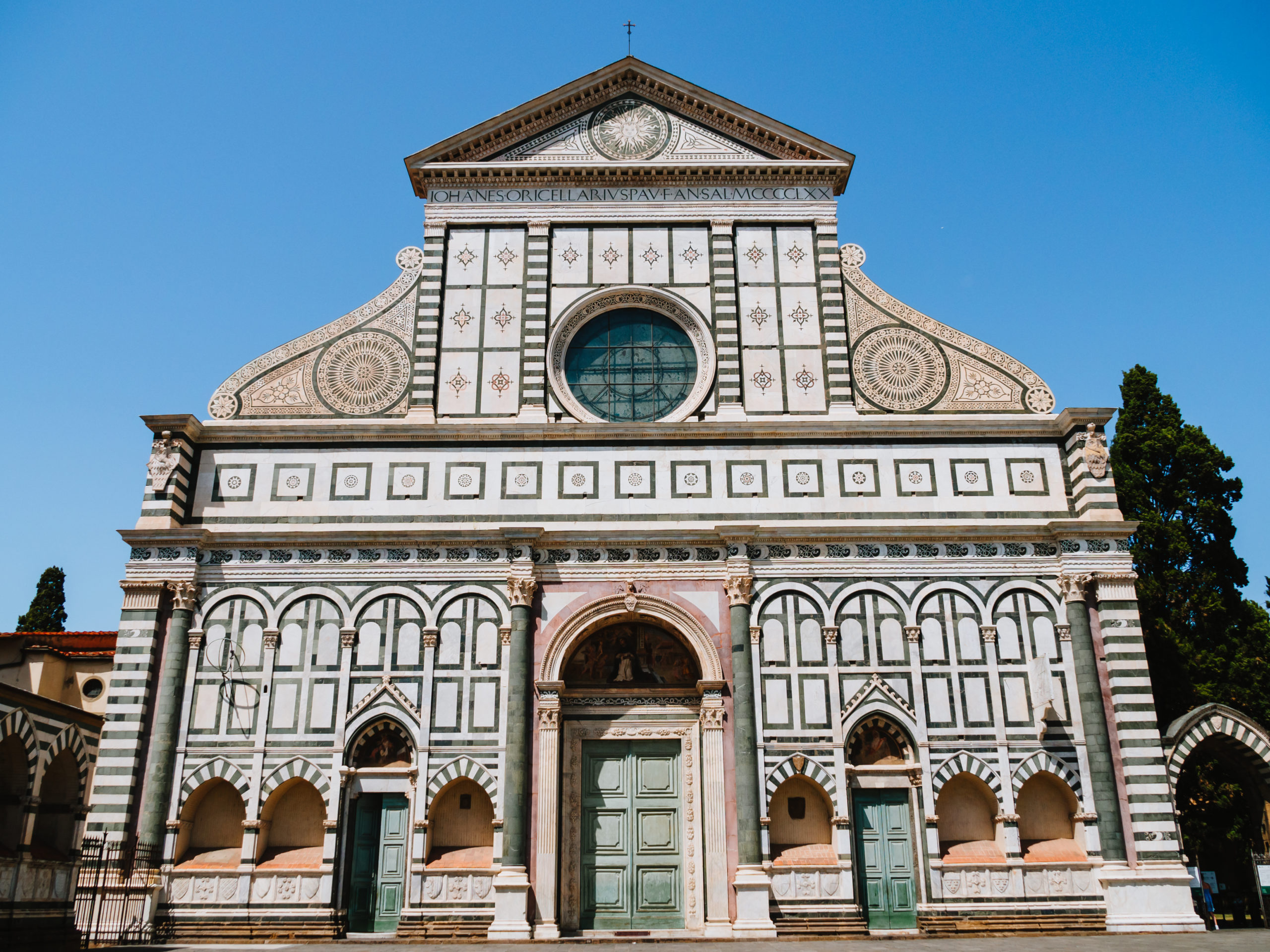 ルネサンスと呼ばれる文芸復興運動がイタリアで始まった頃に、ルッチェッライ家によりファサード(正面部分)の建築が依頼され、白色とエメラルド色の大理石に飾られたファサードが1470年に完成しました。両端のしましま部分にはルチェッライ家の紋章である風を受けて大きく膨らんだ帆が装飾されています。