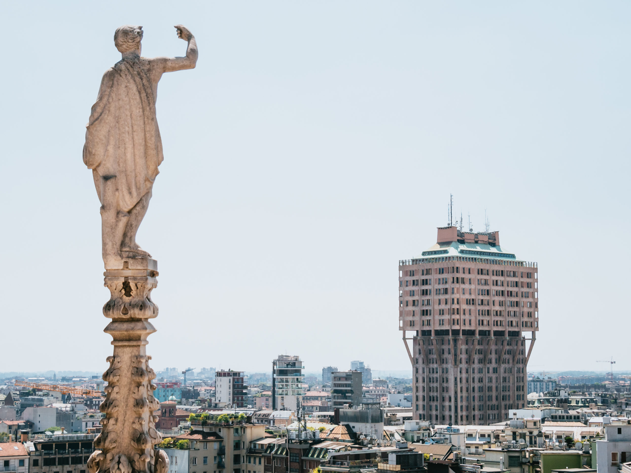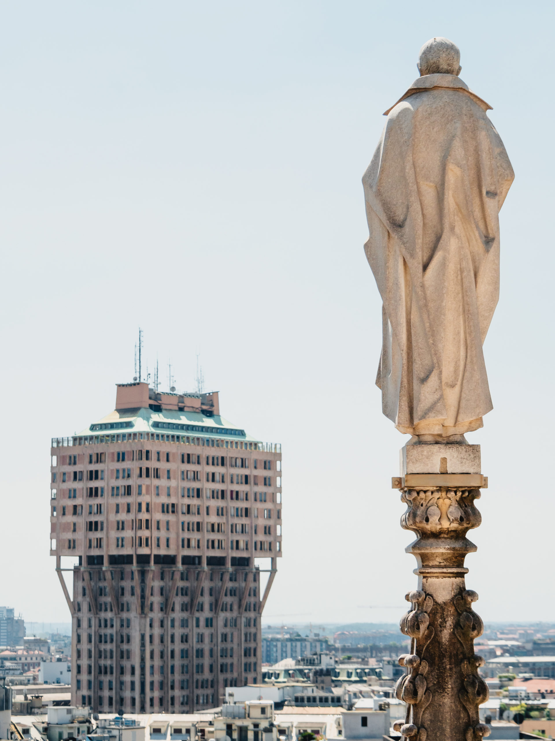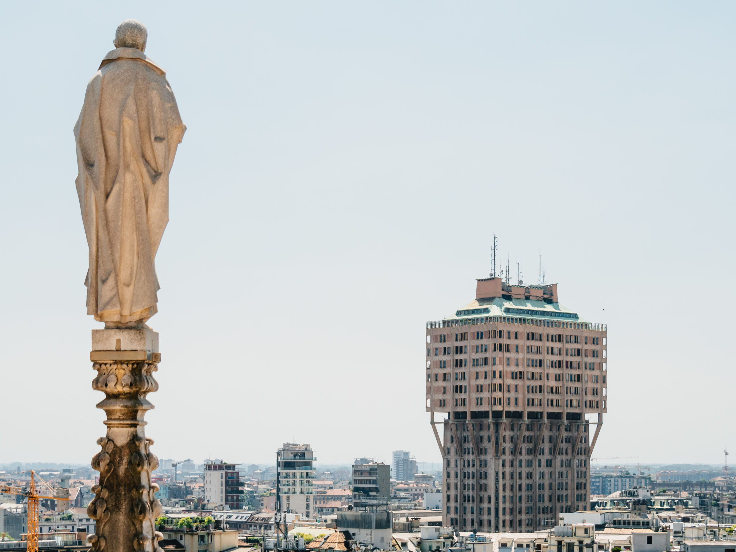 ドゥオーモの屋上からは、イギリスのメディアで「世界で最も醜い建築」に選ばれたトッレ・ヴェラスカ(ヴェラスカ・タワー)も見えます。オフィスや住居として使われているため一般入場はできませんが、遠くから眺めるだけでも面白い形をしています。
