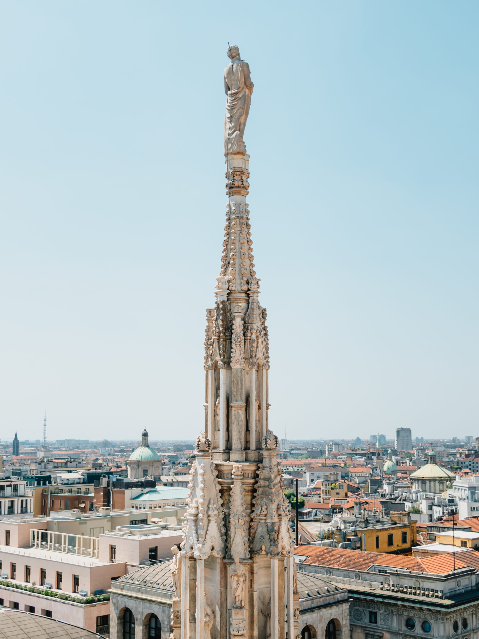 ドゥオーモには135本の尖塔があり尖塔の天辺ひとつひとつに聖人が立っています。一番高い主尖塔