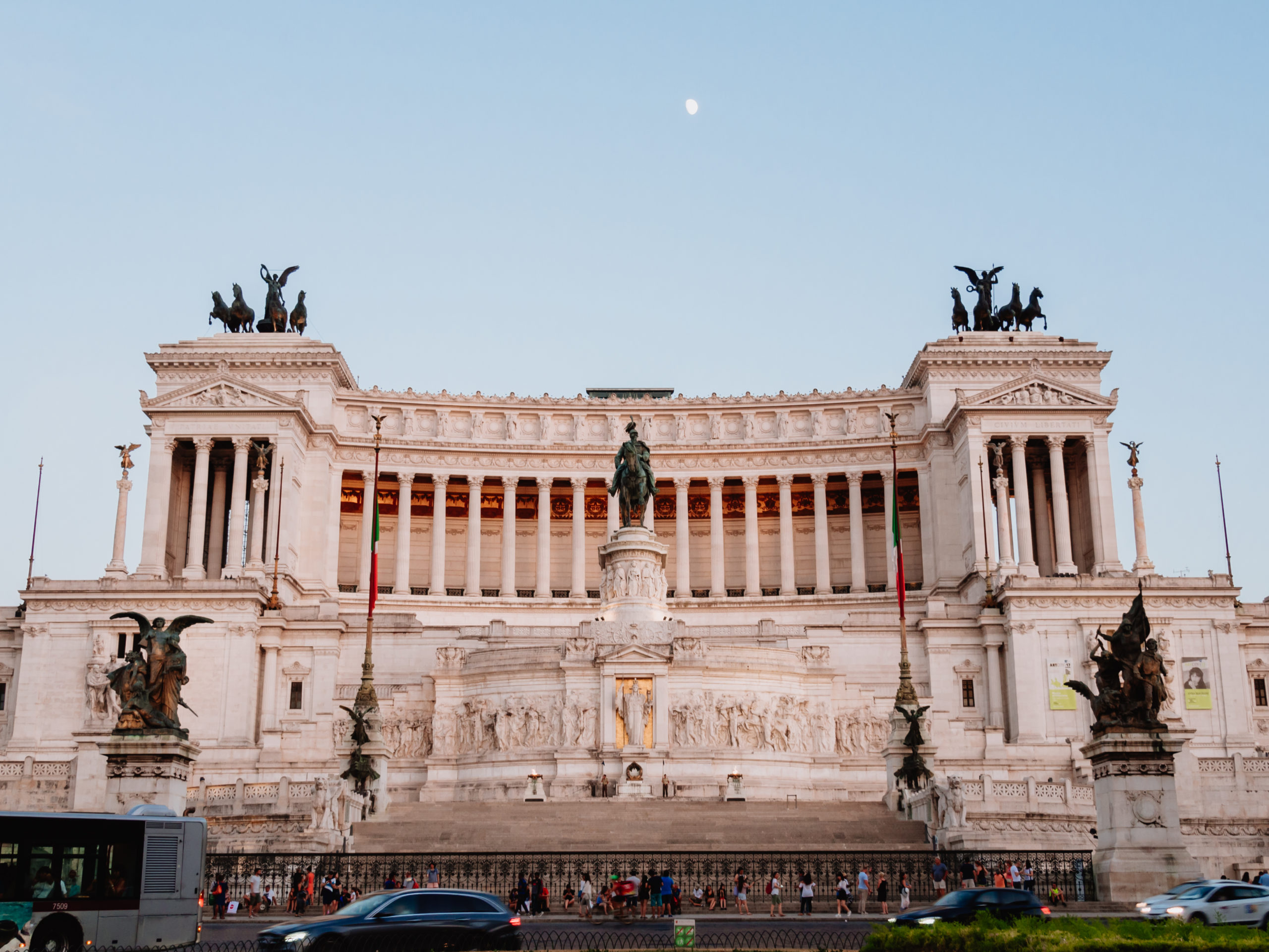 初日の昼間にも訪れましたが、夜景を撮るためにまたヴェネツィア広場に戻ってきました。19時半頃でもまだ明るいです。マジックアワーの空と月が綺麗でした。