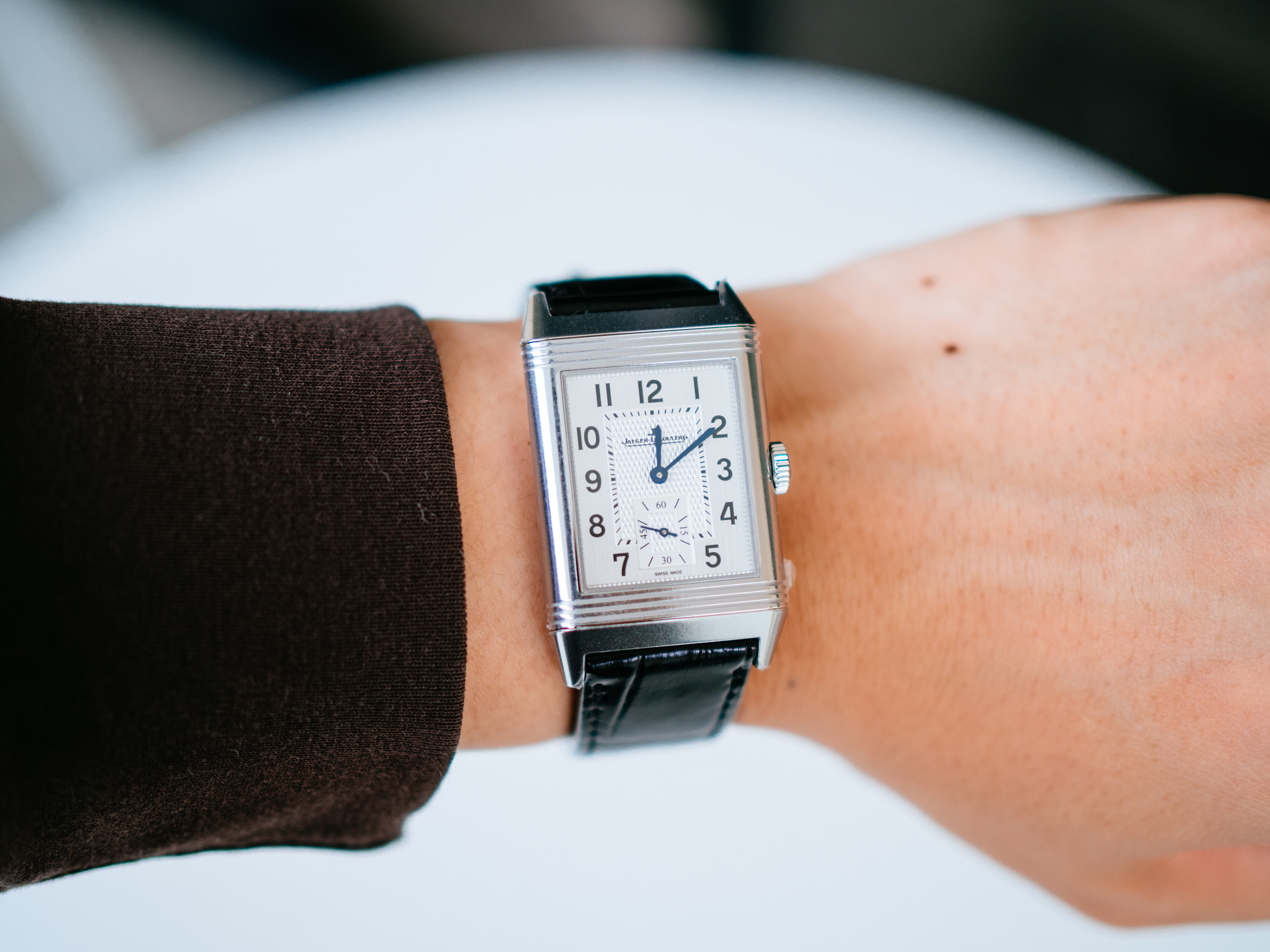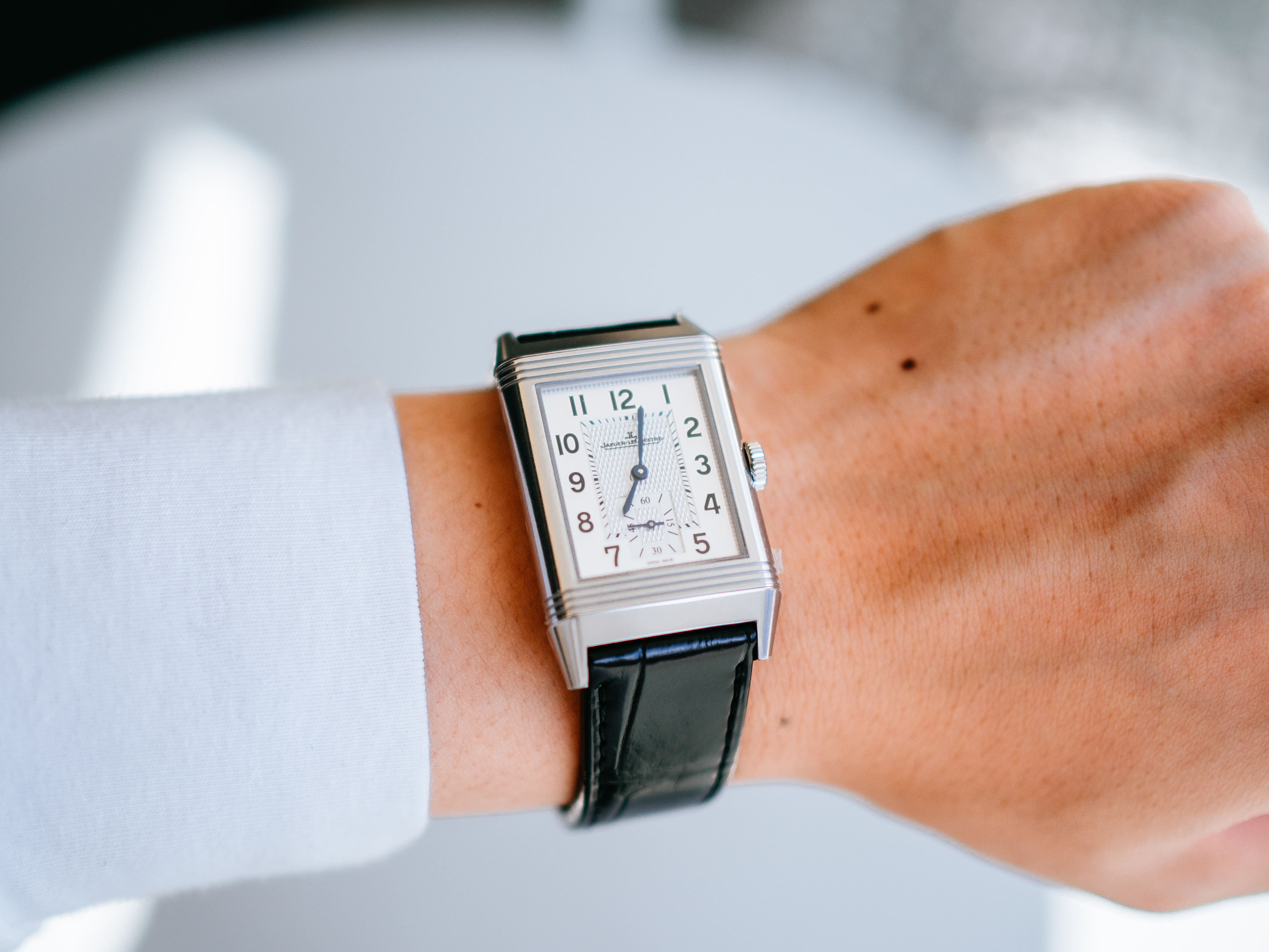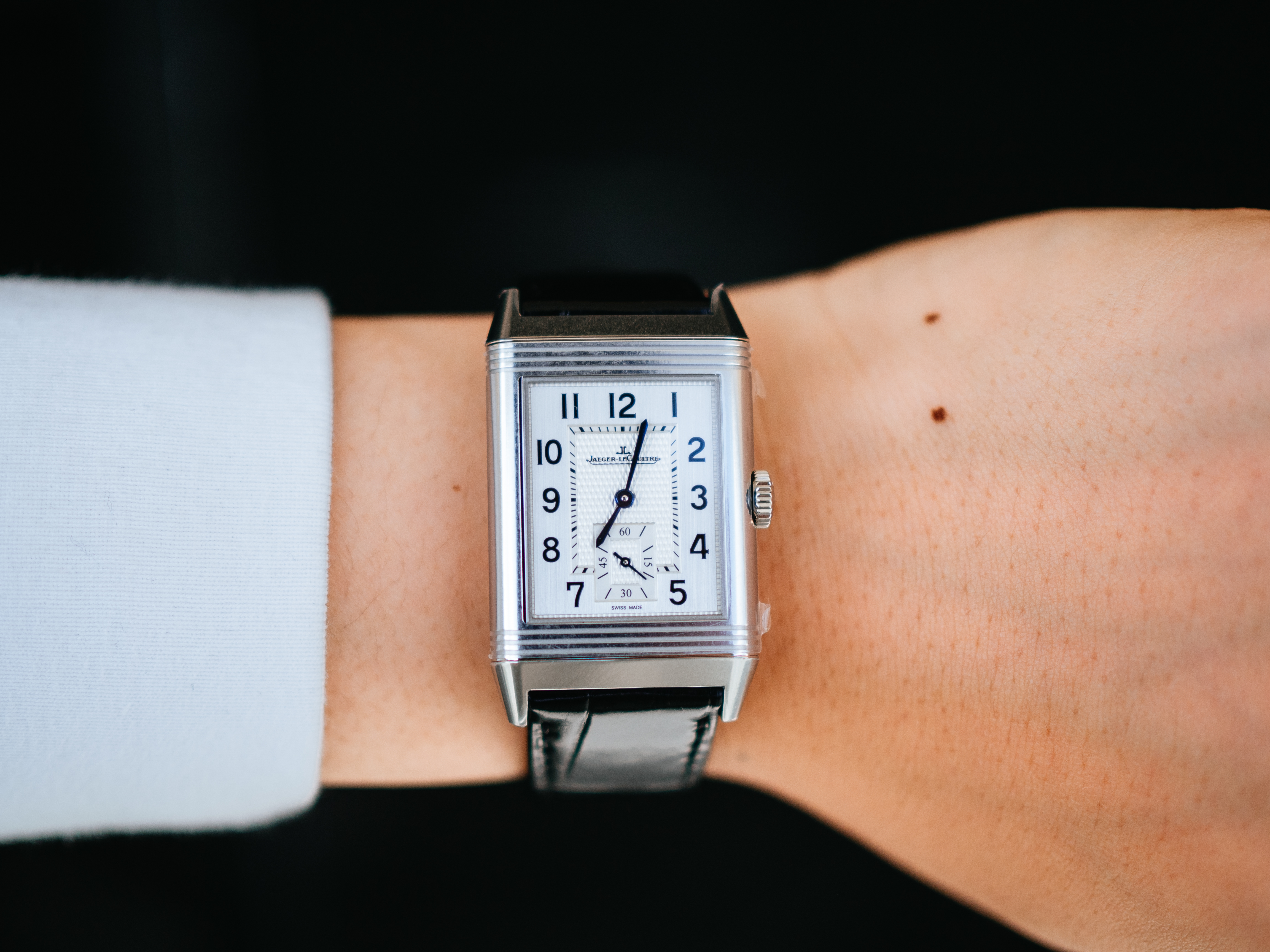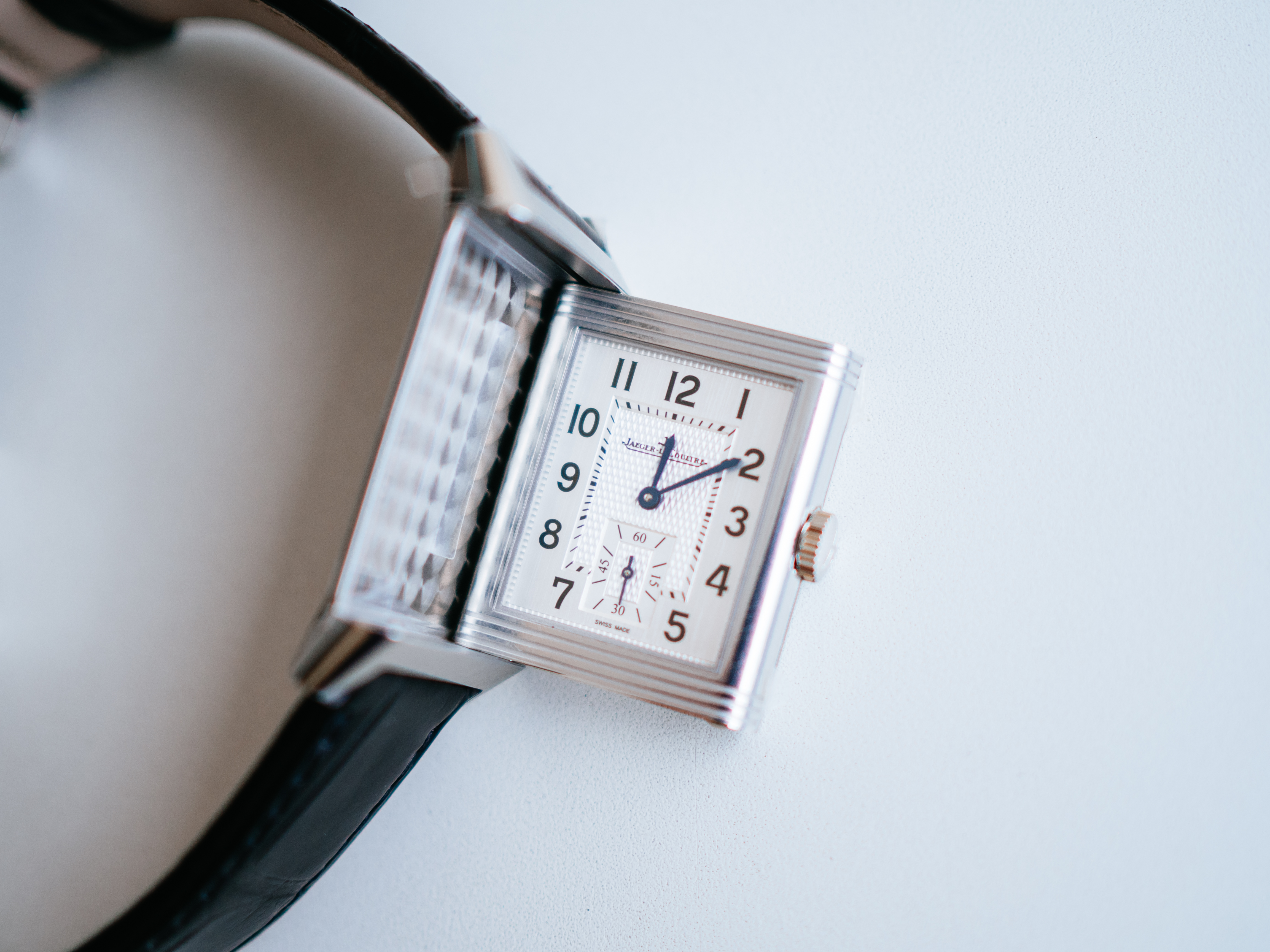 ダブルフェイスのデュオは、約50万円プラスで両面の文字盤(裏側は夜の雰囲気にぴったりな黒背景の文字盤)はお得感があるとは思ったのですが、約2mm厚みが増すのと、個人的にはそこまで裏の文字盤の必要性を感じなかったので、上記を全て鑑みて、レベルソ・クラシックのスモールセコンドが一番気に入りました。