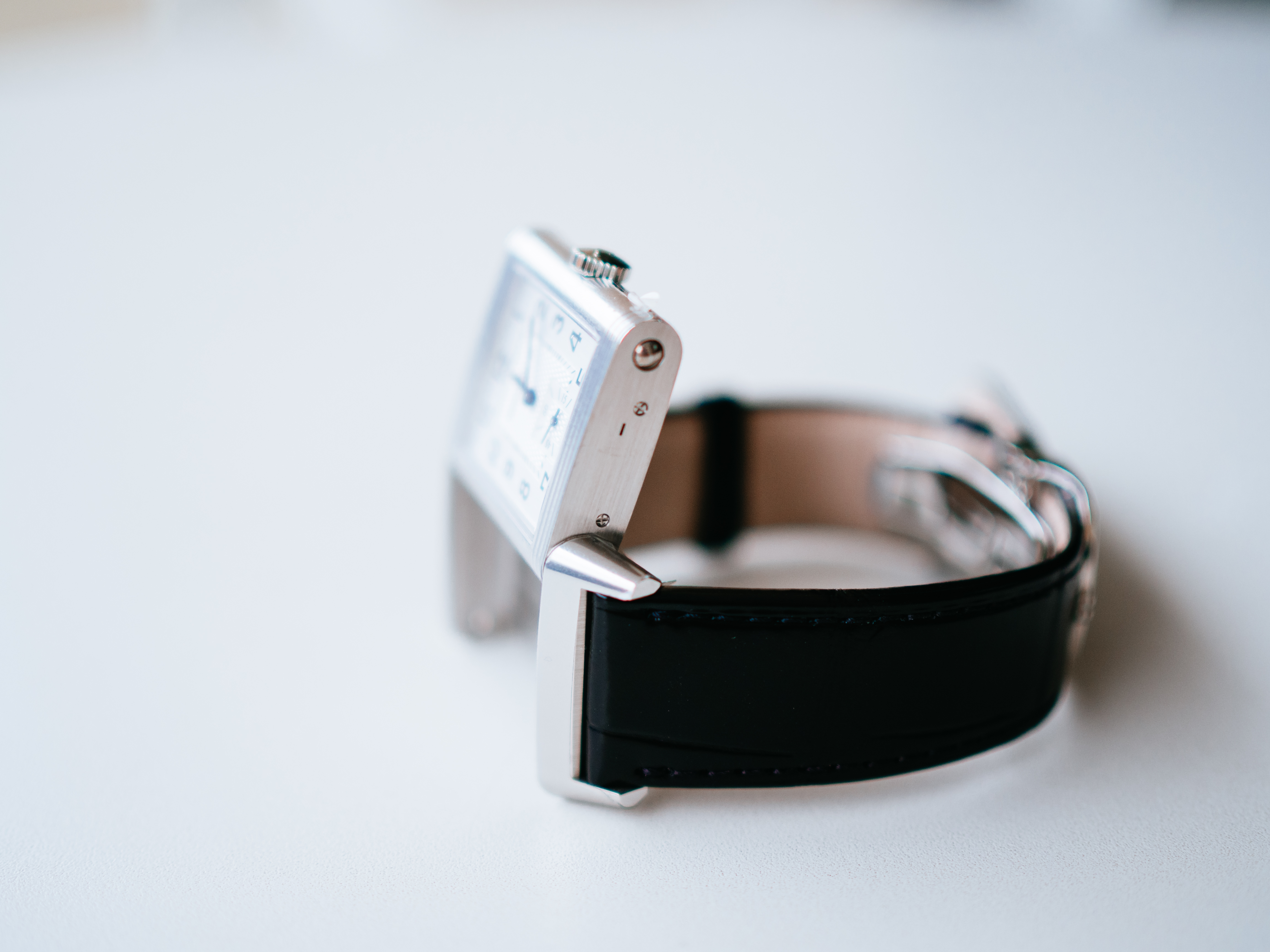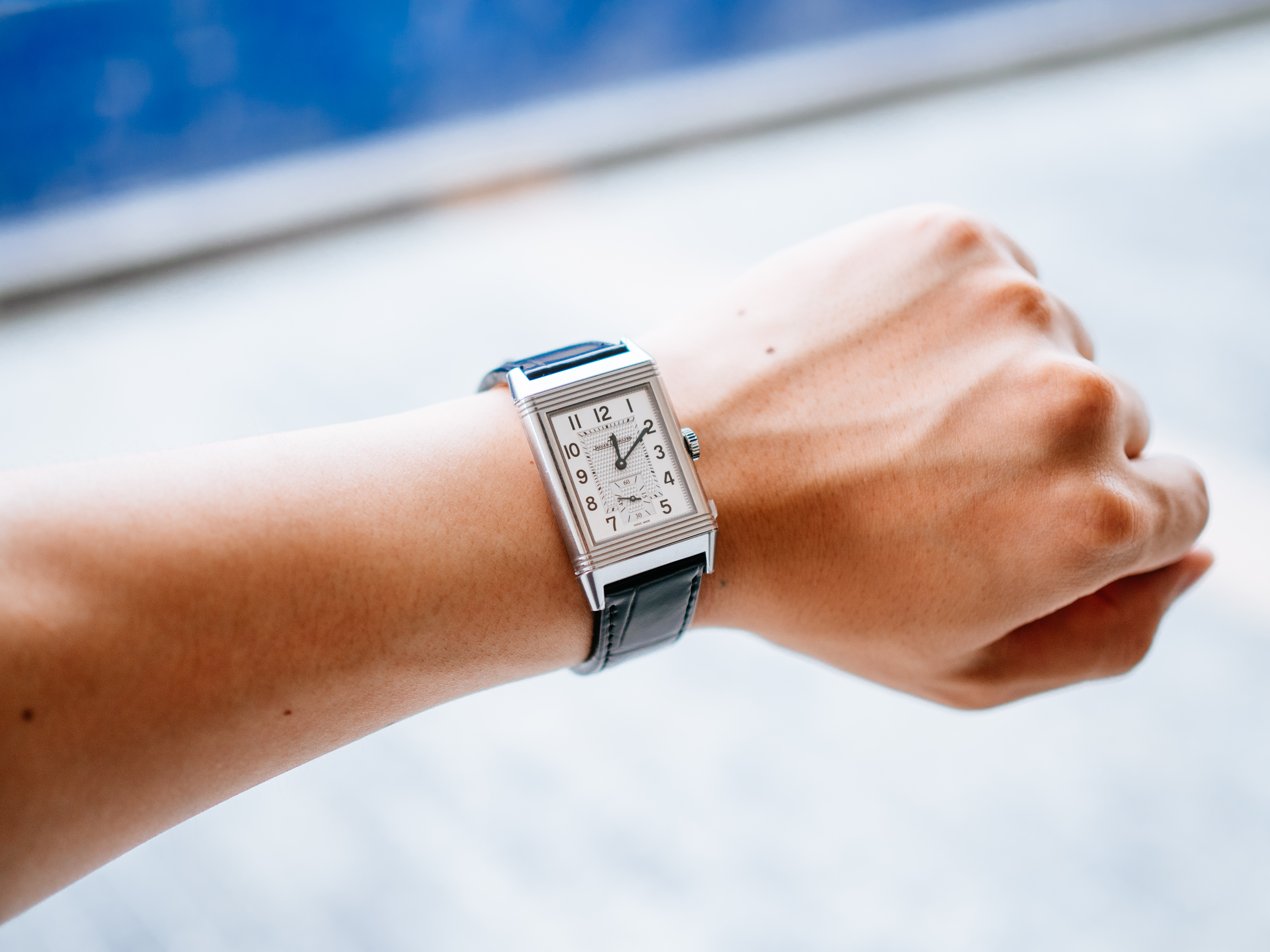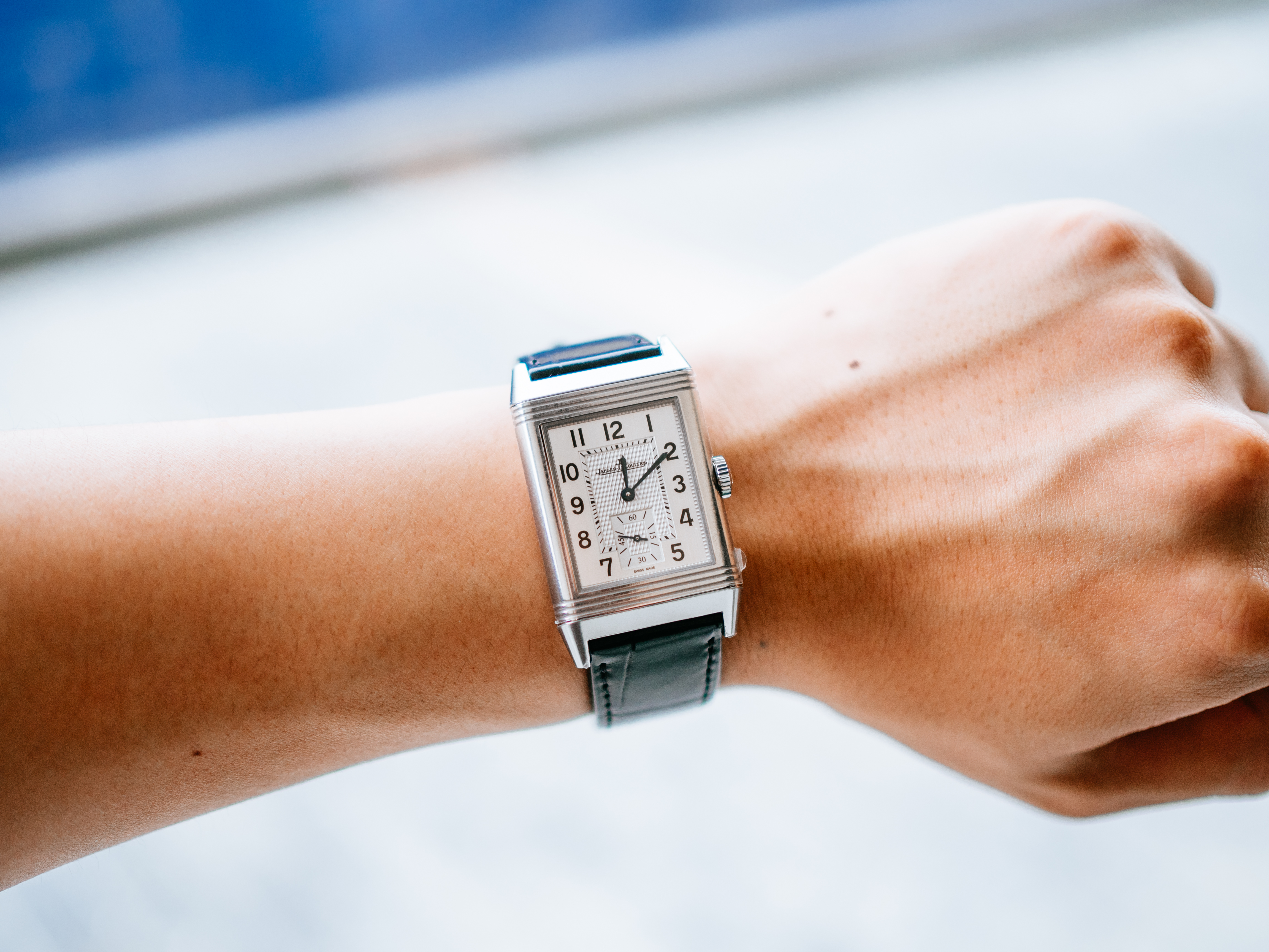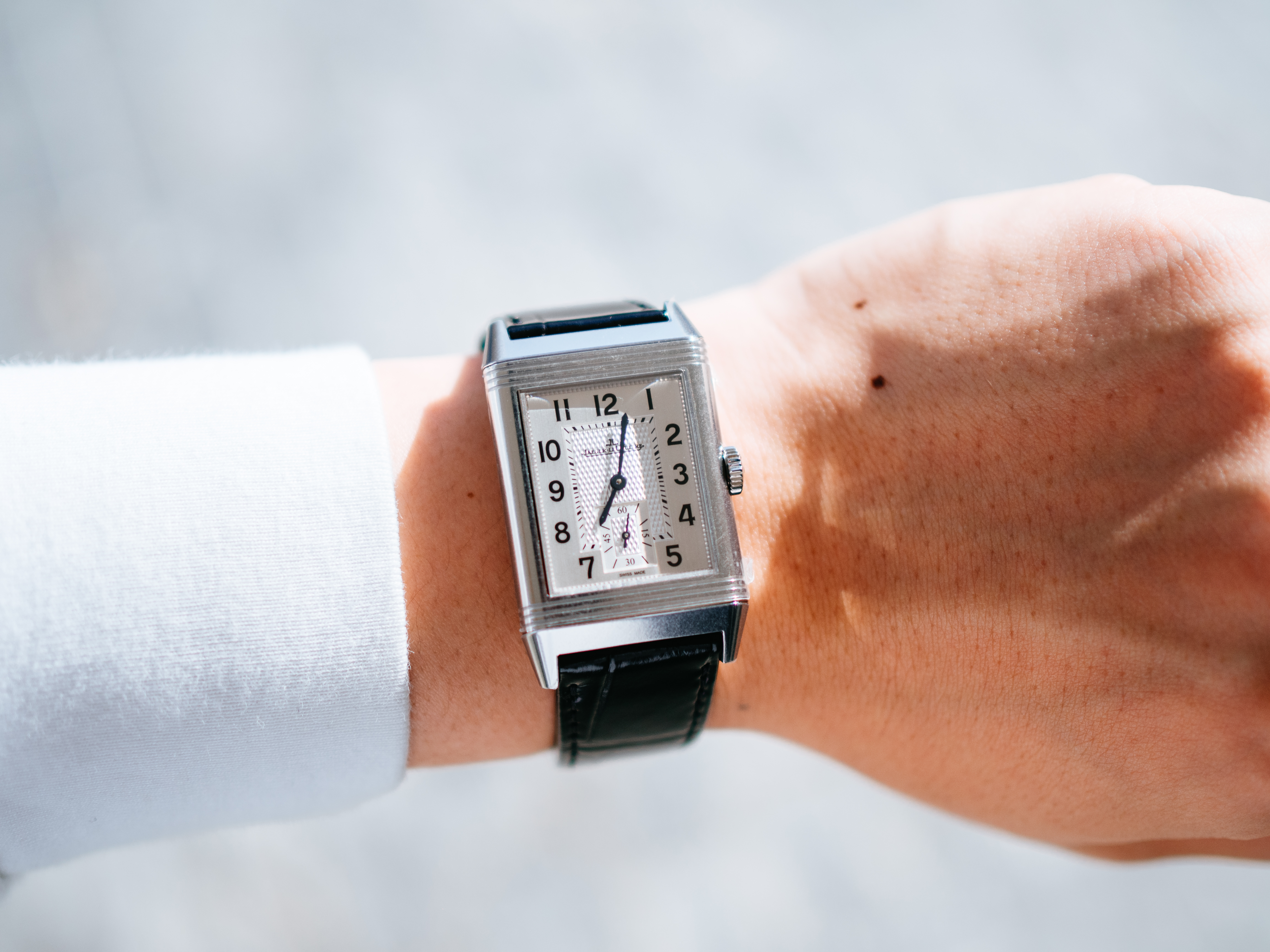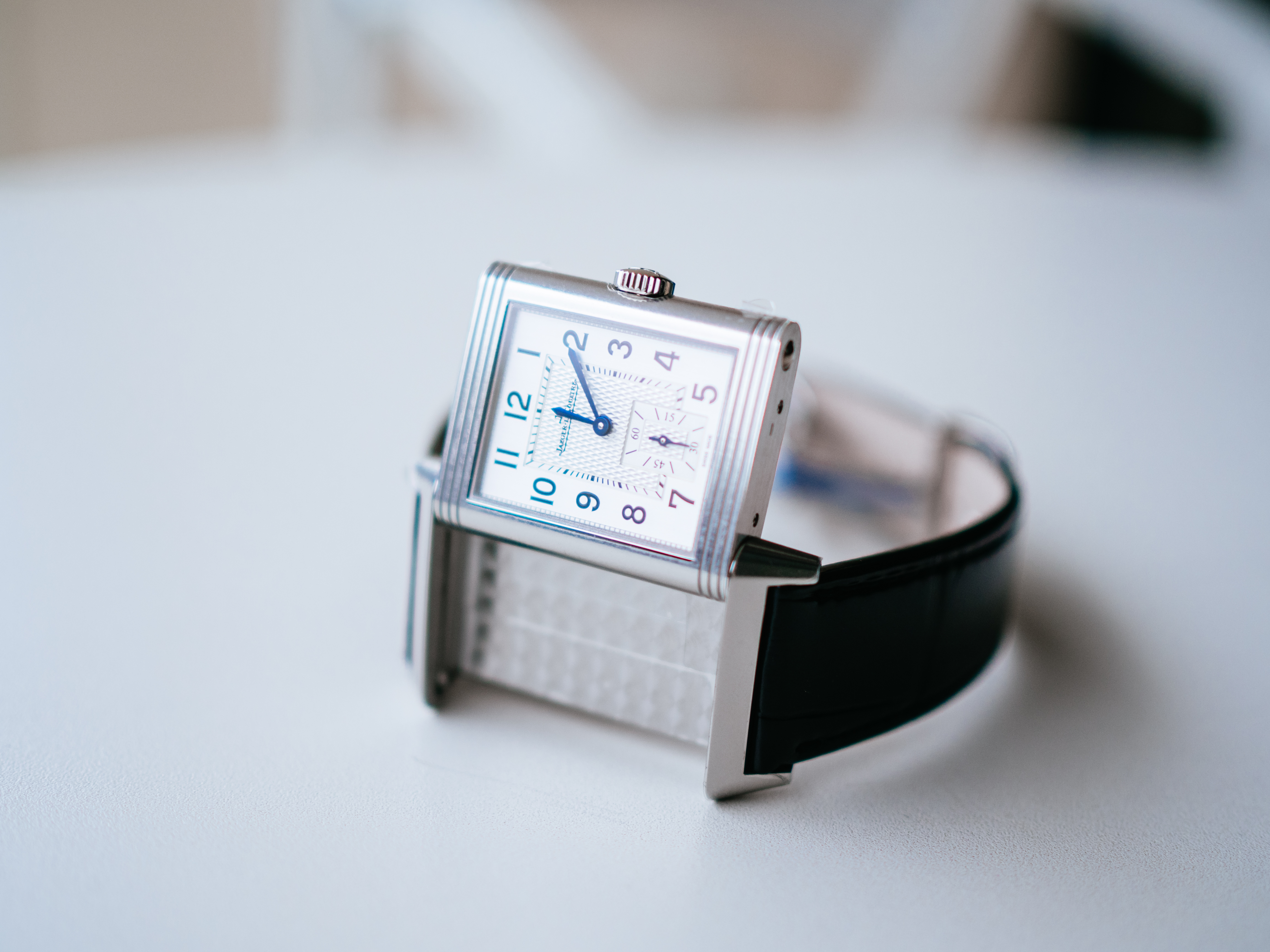 ダブルフェイスのデュオは、約50万円プラスで両面の文字盤(裏側は夜の雰囲気にぴったりな黒背景の文字盤)はお得感があるとは思ったのですが、約2mm厚みが増すのと、個人的にはそこまで裏の文字盤の必要性を感じなかったので、上記を全て鑑みて、レベルソ・クラシックのスモールセコンドが一番気に入りました。