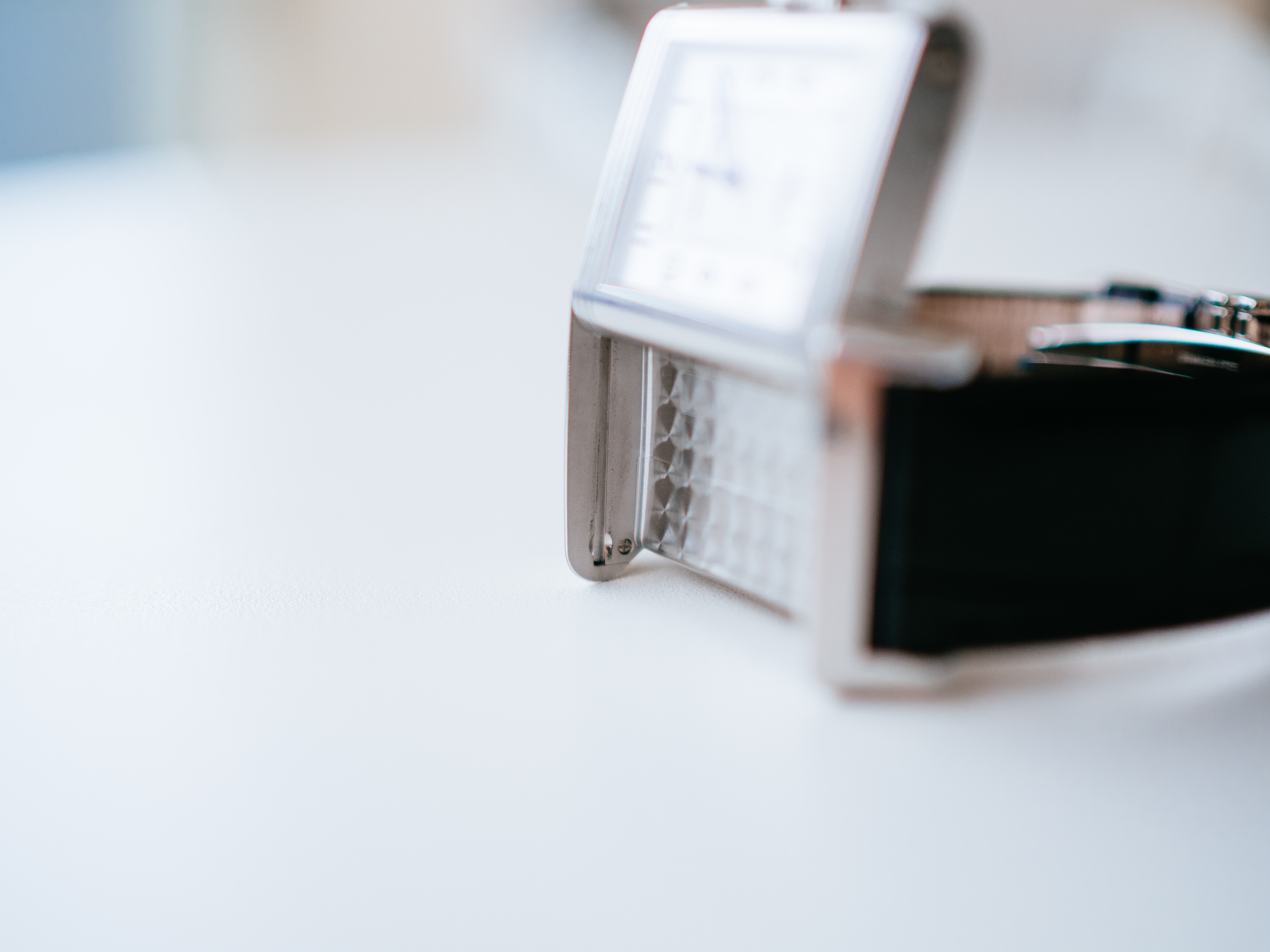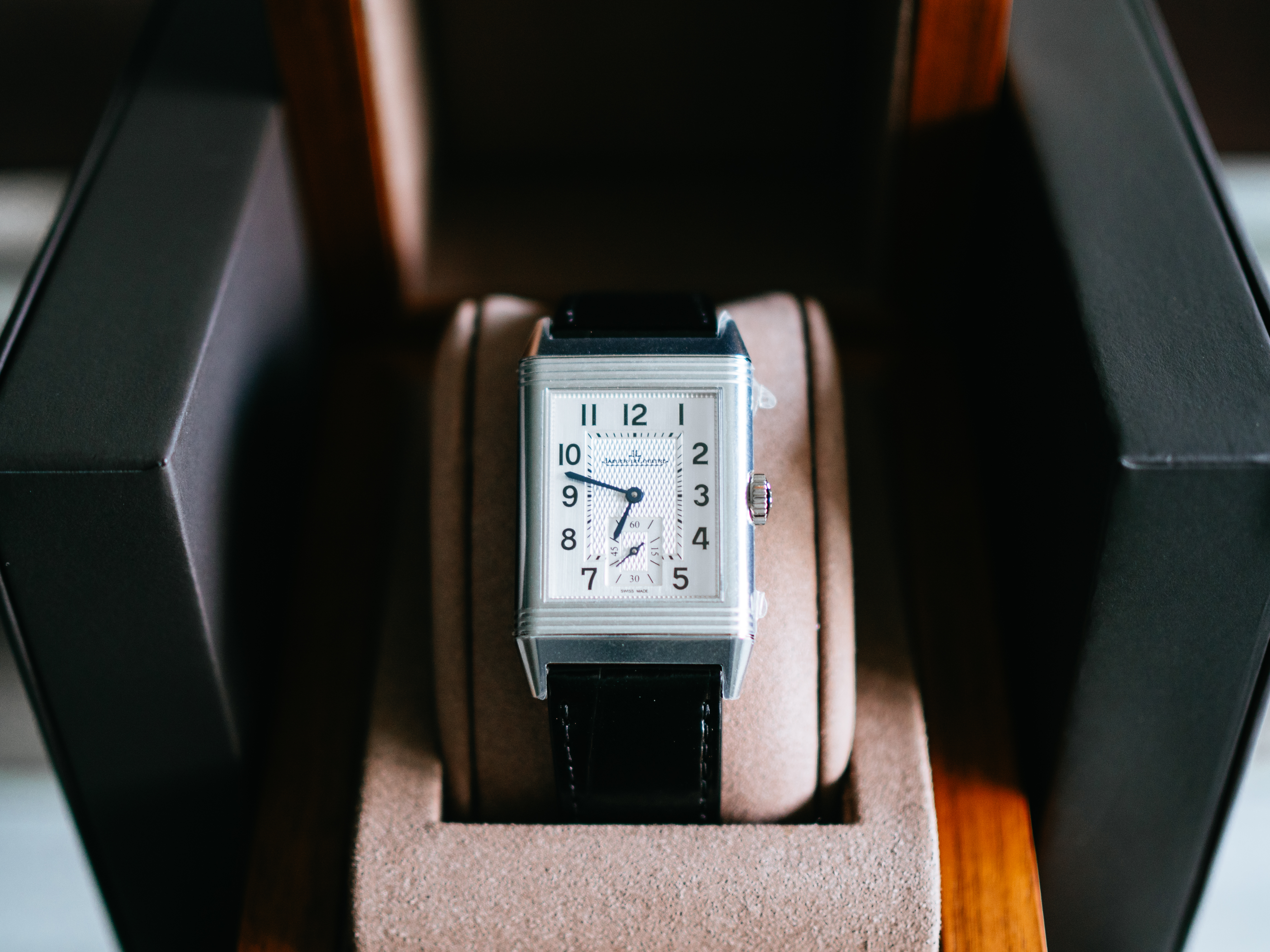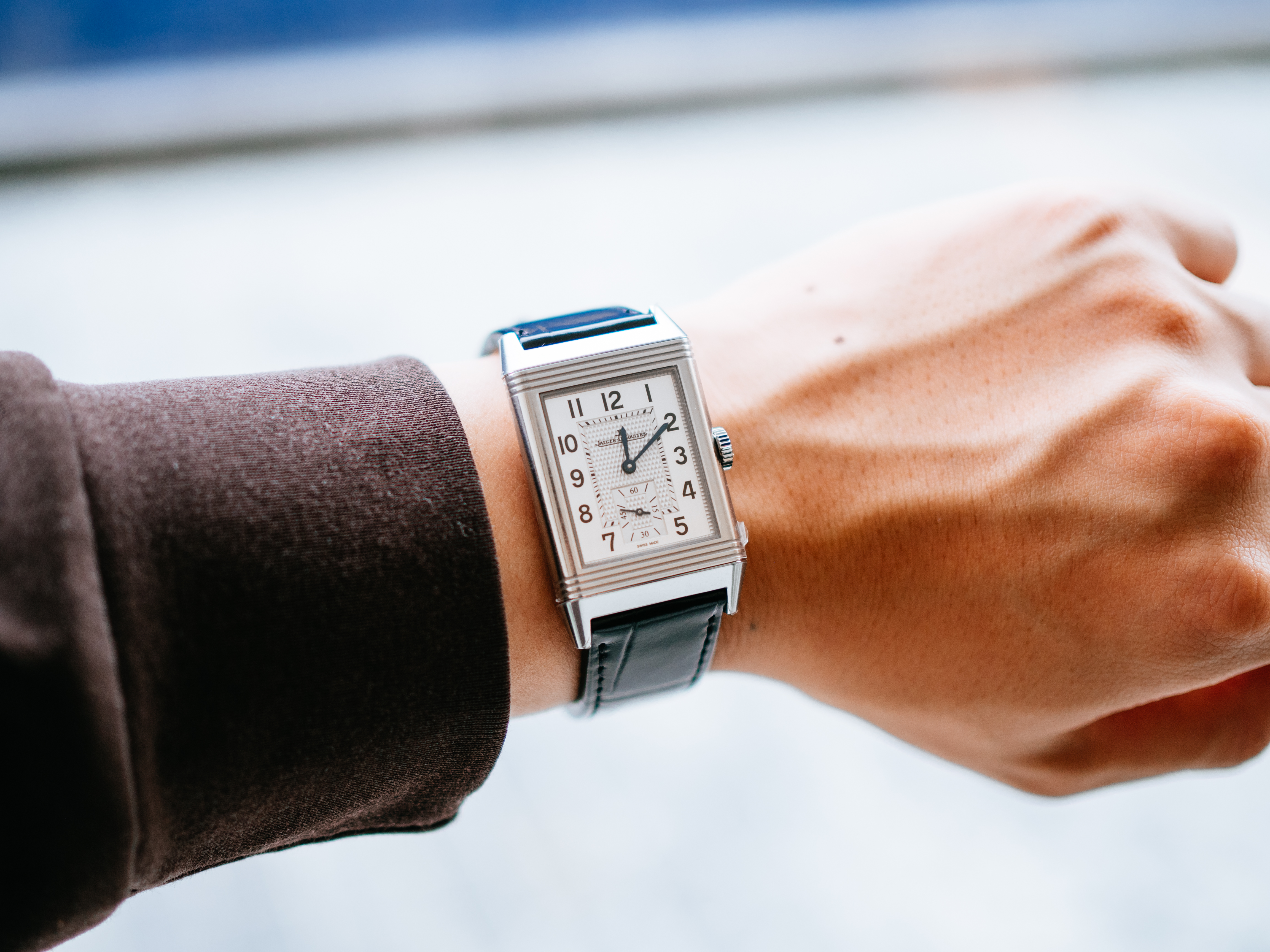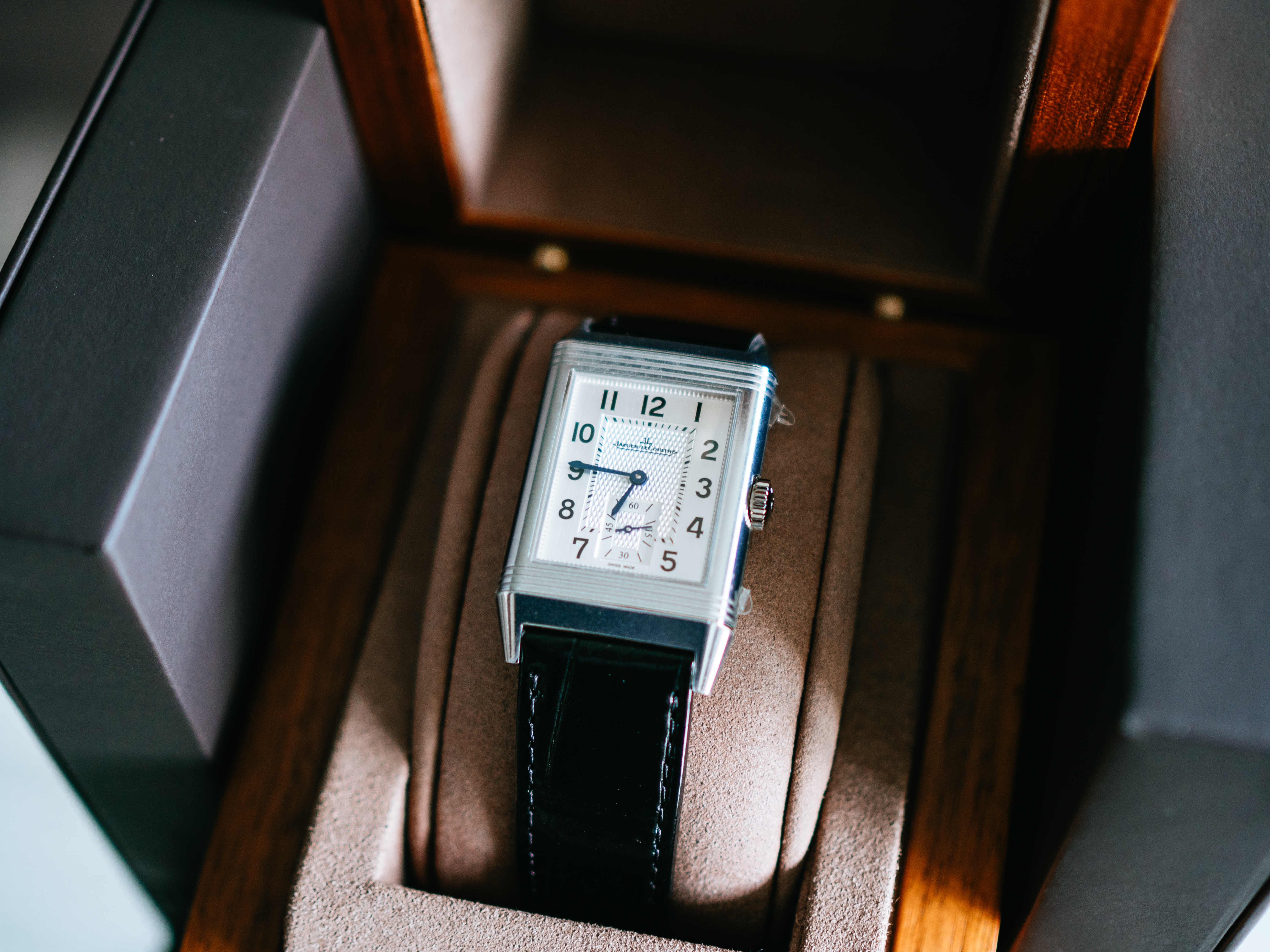 ダブルフェイスのデュオは、約50万円プラスで両面の文字盤(裏側は夜の雰囲気にぴったりな黒背景の文字盤)はお得感があるとは思ったのですが、約2mm厚みが増すのと、個人的にはそこまで裏の文字盤の必要性を感じなかったので、上記を全て鑑みて、レベルソ・クラシックのスモールセコンドが一番気に入りました。