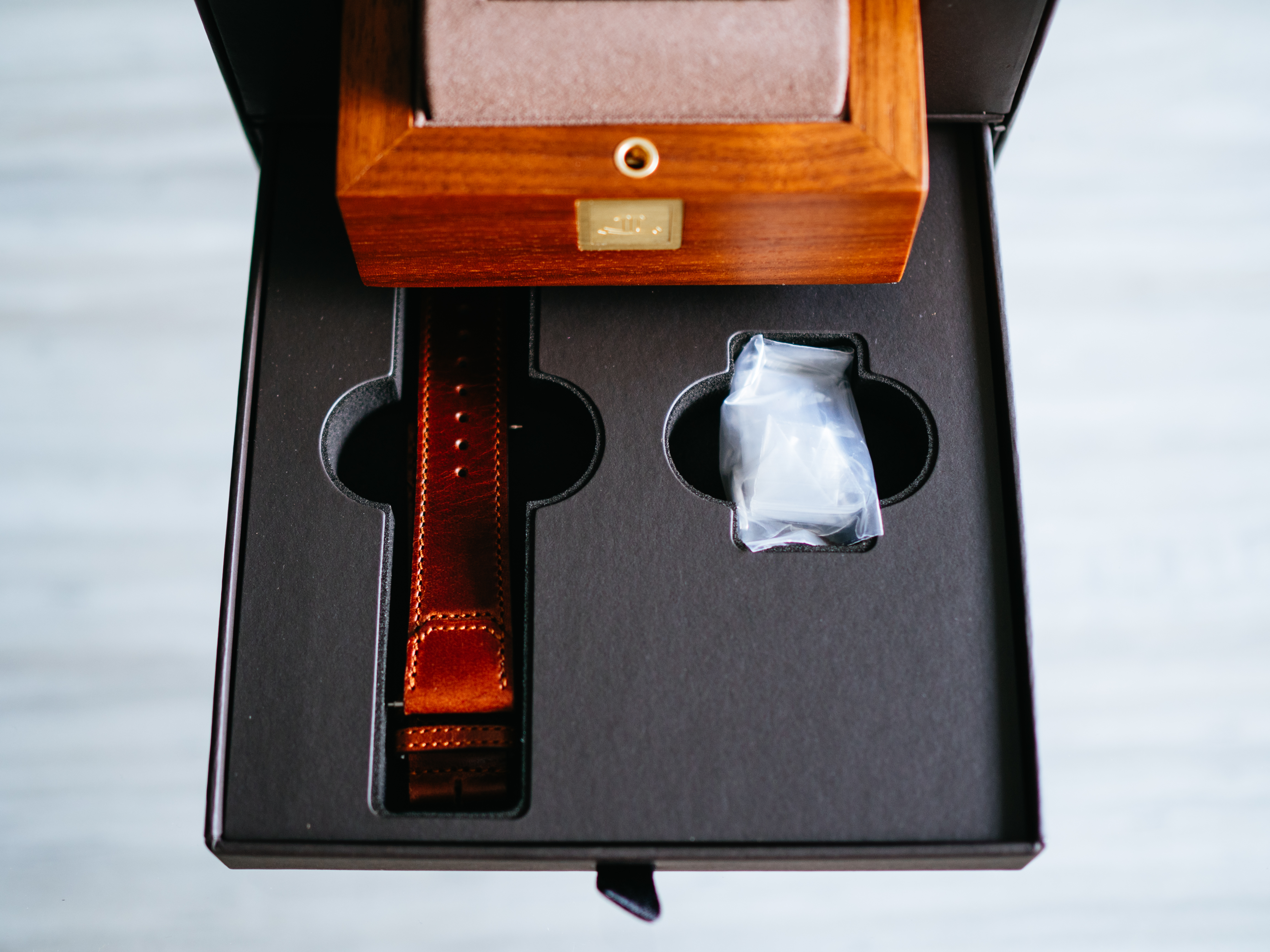 紙製の箱の中に木製の時計ケース。下の引き出しには元々付いていたブラウンのカーフストラップとピンバックルを収納してもらいました。