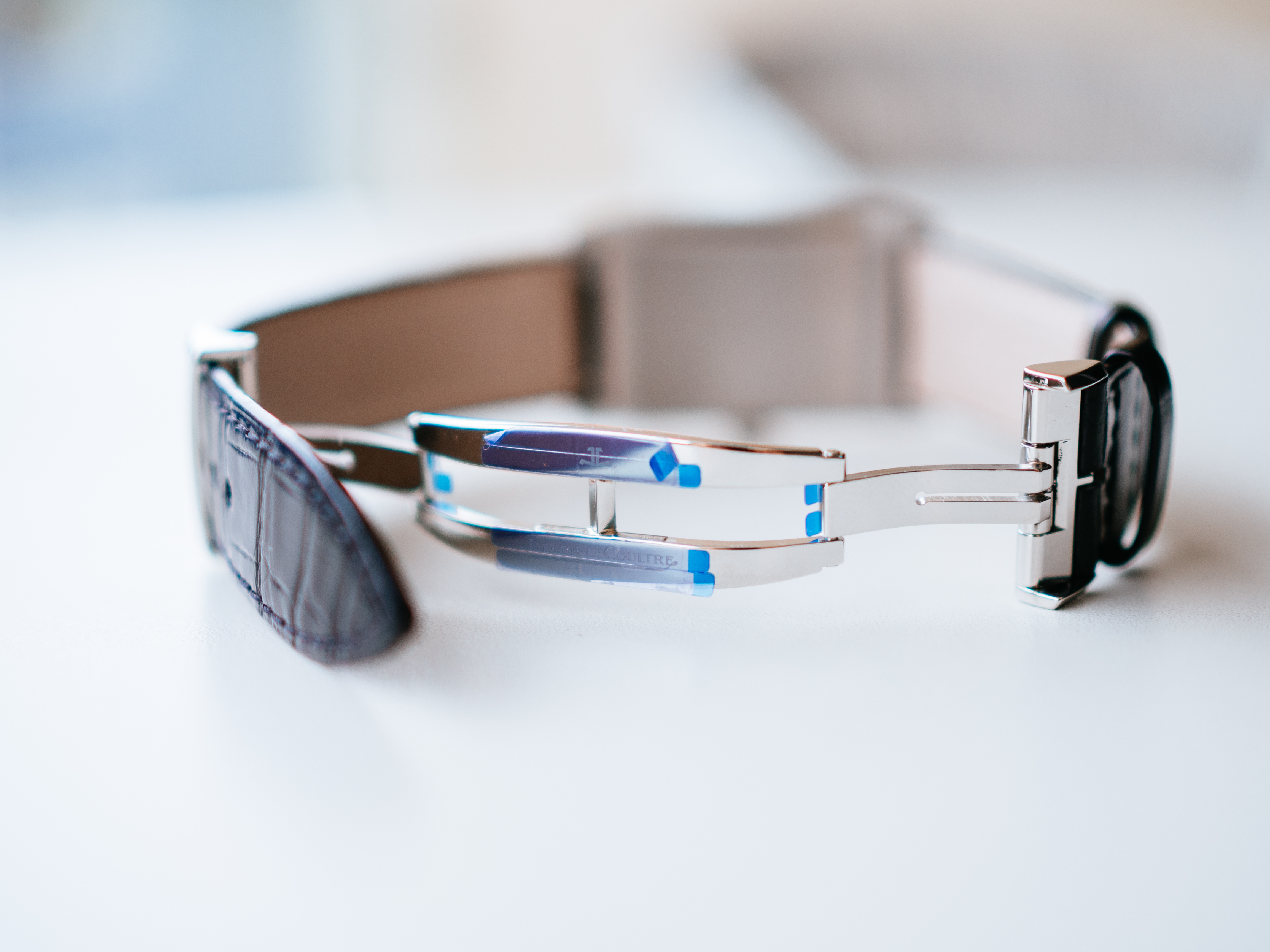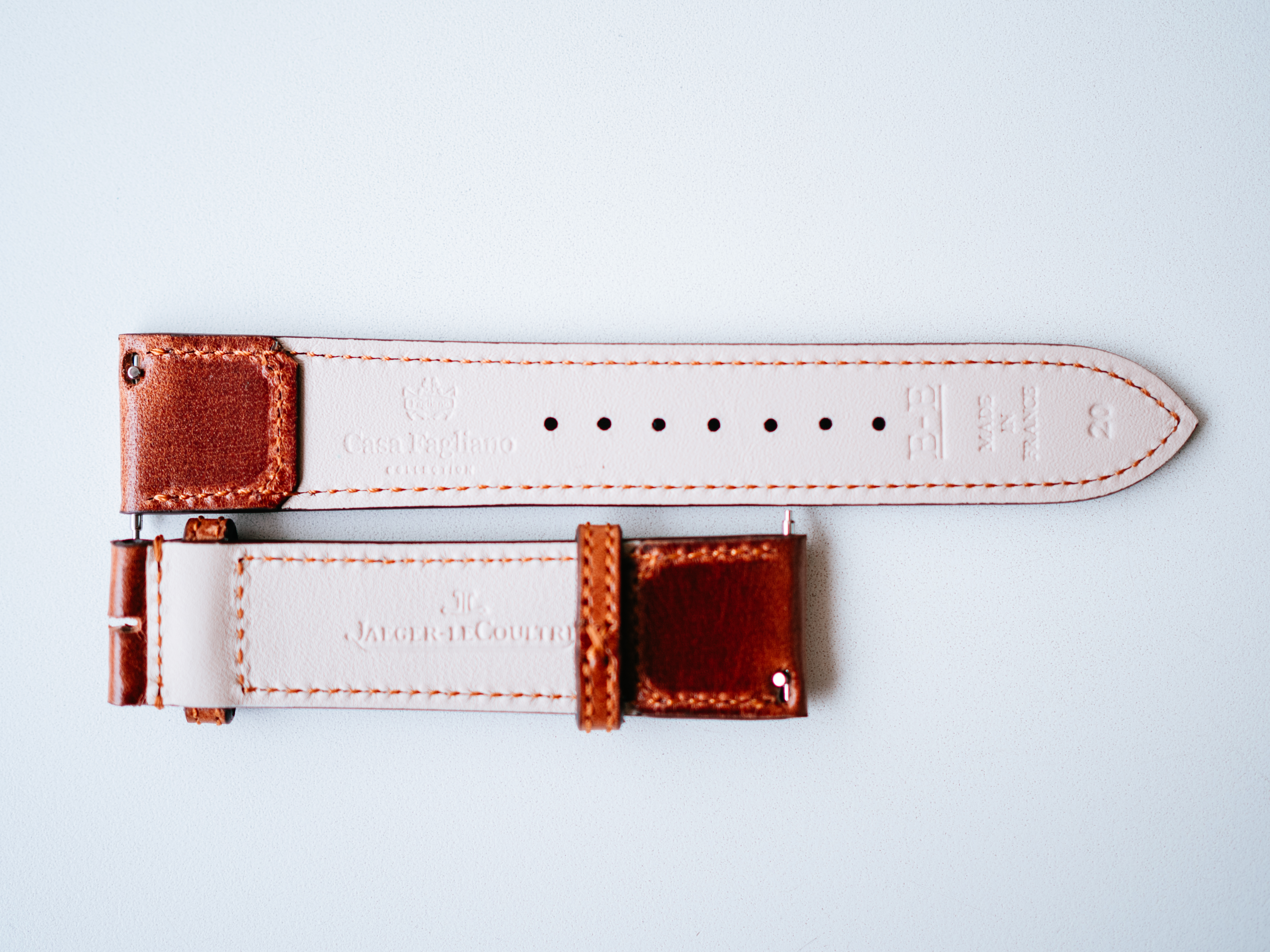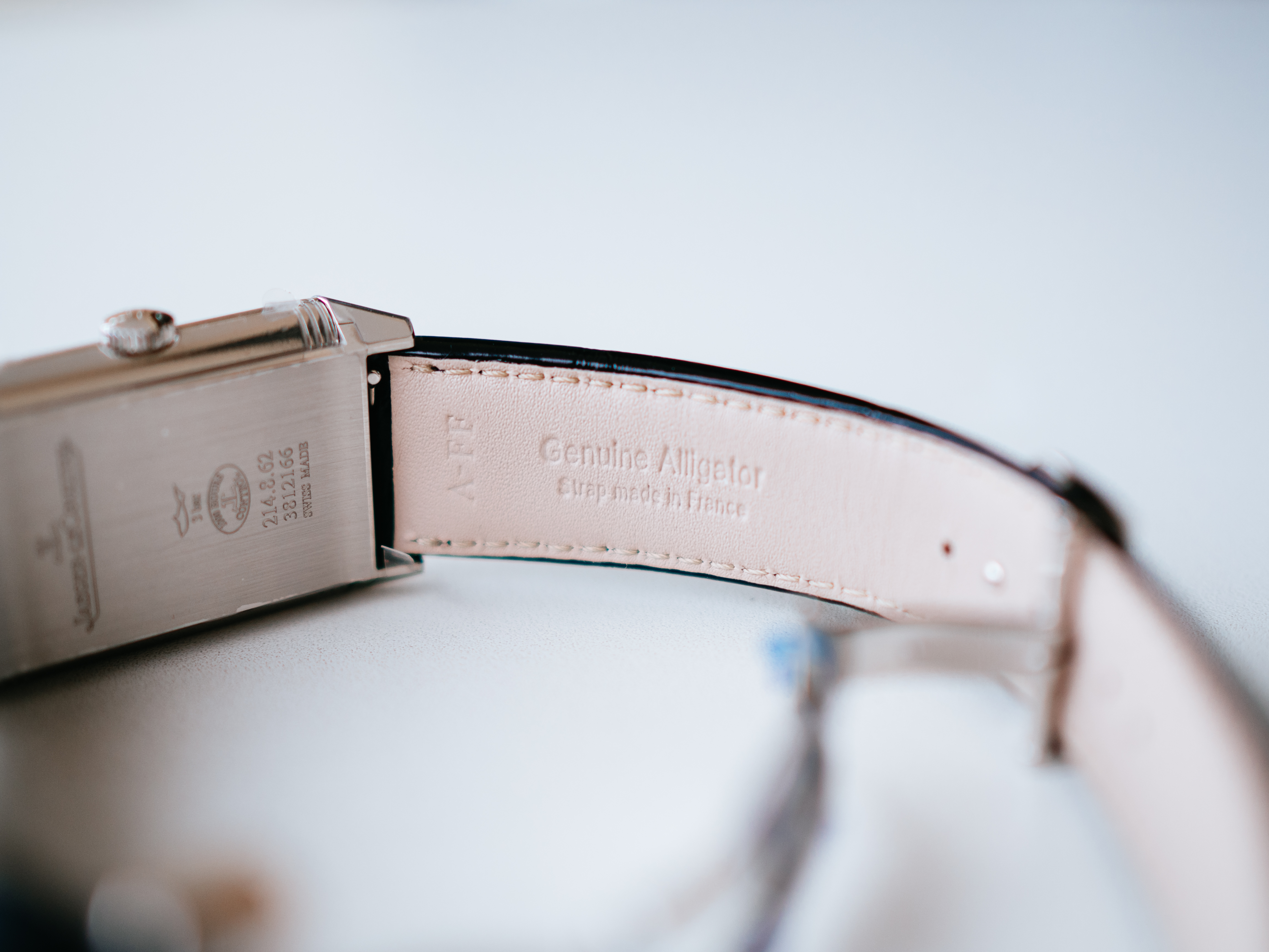 追加購入したブラックのアリゲーターのストラップはメーカーは不明(カミーユ・フォルネ?)ですが、ルクルトのロゴ入りでフランス製。標準のカーフのストラップはCasa Fagliano社製(アルゼンチンのポロブーツメーカー)でこちらもフランス製。