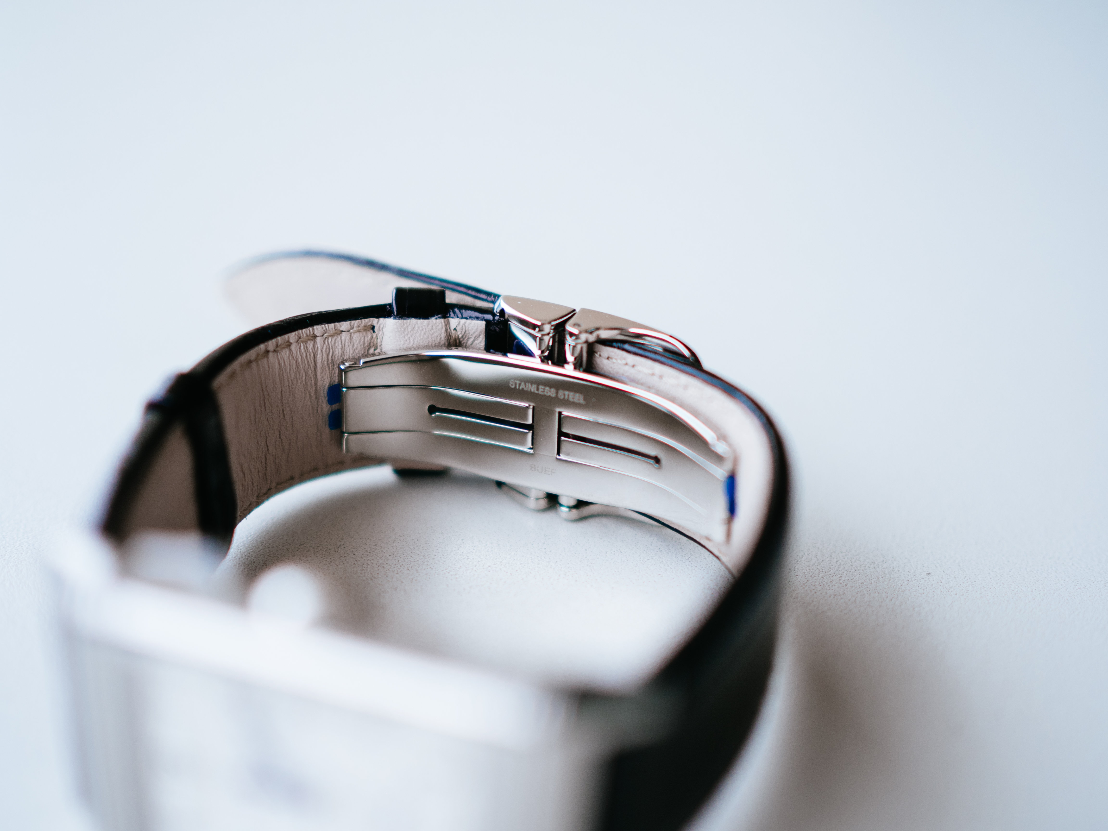 追加購入して付け替えてもらったDバックル(Deployment Buckle:展開する留め金)。着脱が容易で、ブレスレットのように腕に通してから左右を重ねて締めるので時計の落下を防止することができます。ピンバックルのように毎回穴に通す必要が無いので、革ストラップへの負担も軽減できるのでオススメです。ステンレスのバックルに約7万円は高いですが、、、。
