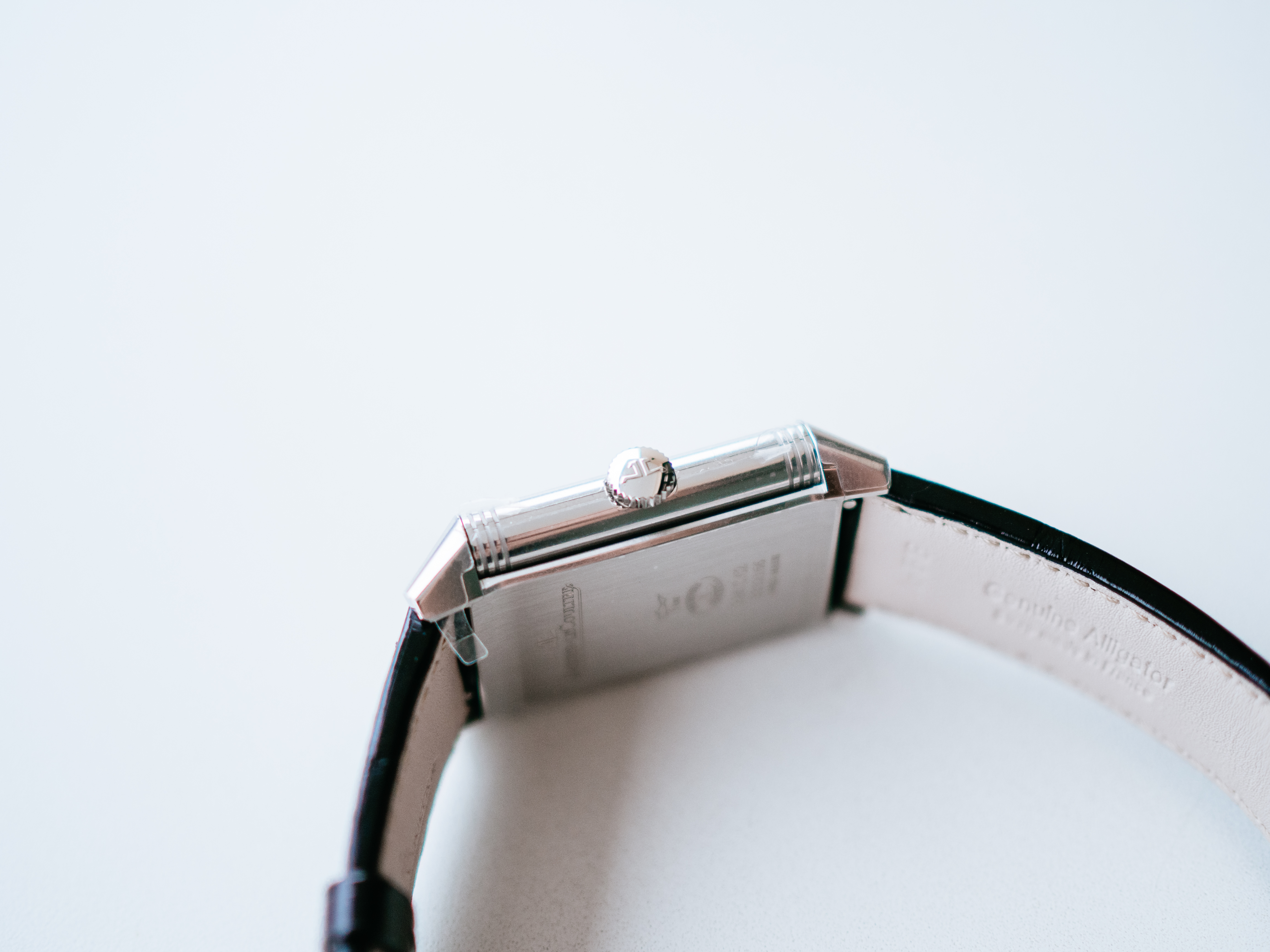 リューズにはジャガー・ルクルトのJLのロゴ。ケース裏側の上下部分は手首に沿うように傾斜がかかっていることが分かります。