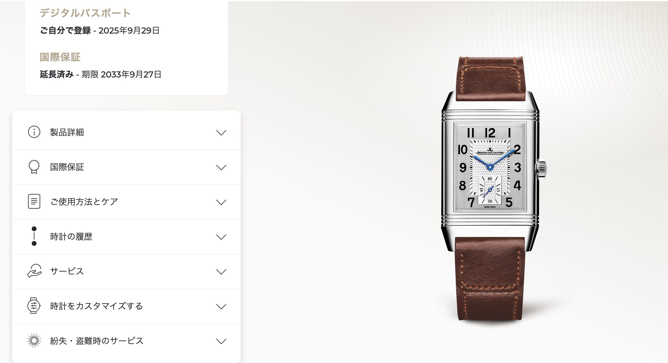 購入時に付随する「国際限定保証」の保証期間内にある時計は、オンラインでジャガー・ルクルト ケアプログラムに登録すると保証期間が最大8年まで延長されます。担当の店員さんからの案内で、購入時にその場で登録して8年保証を適用させました。