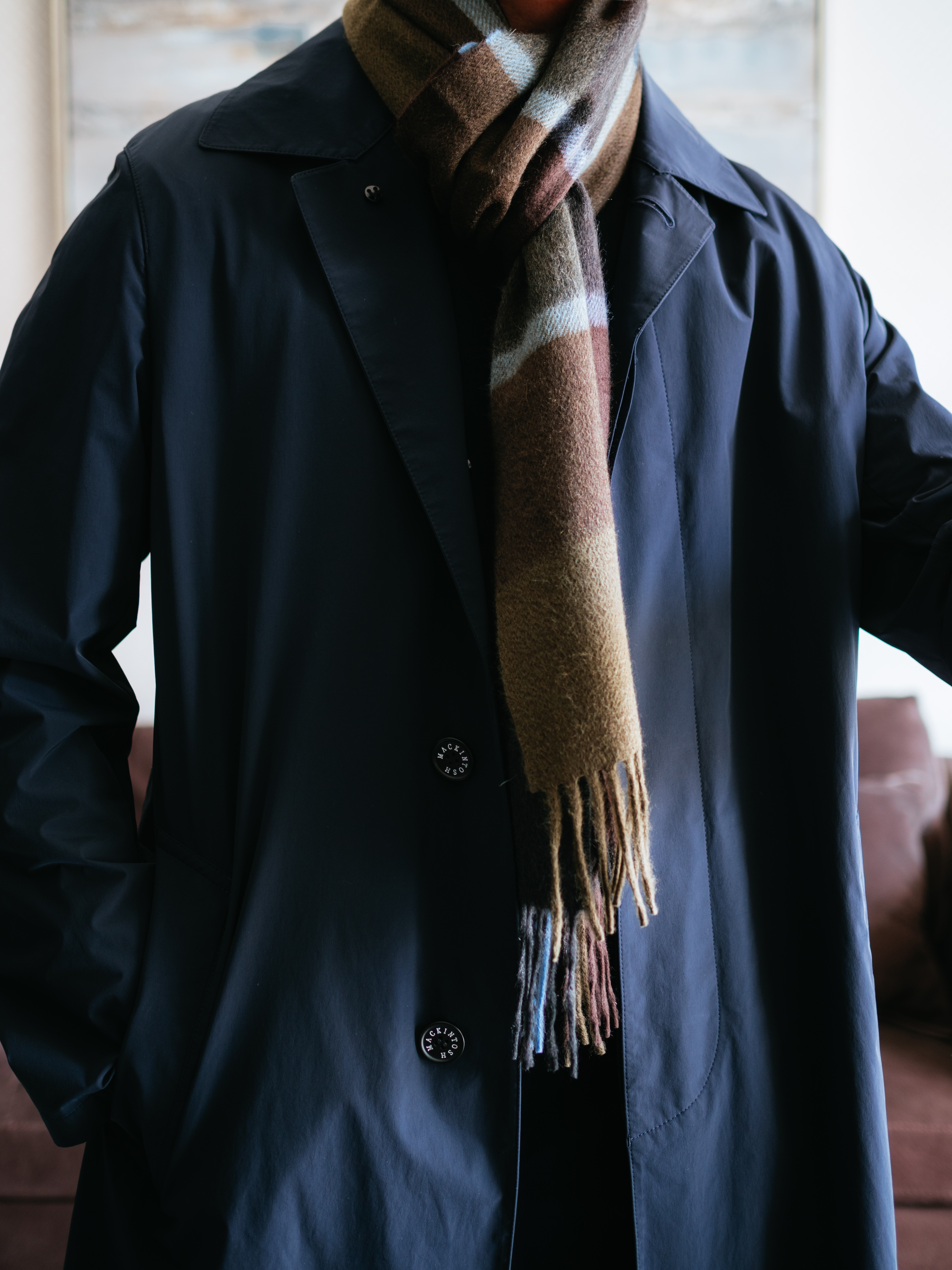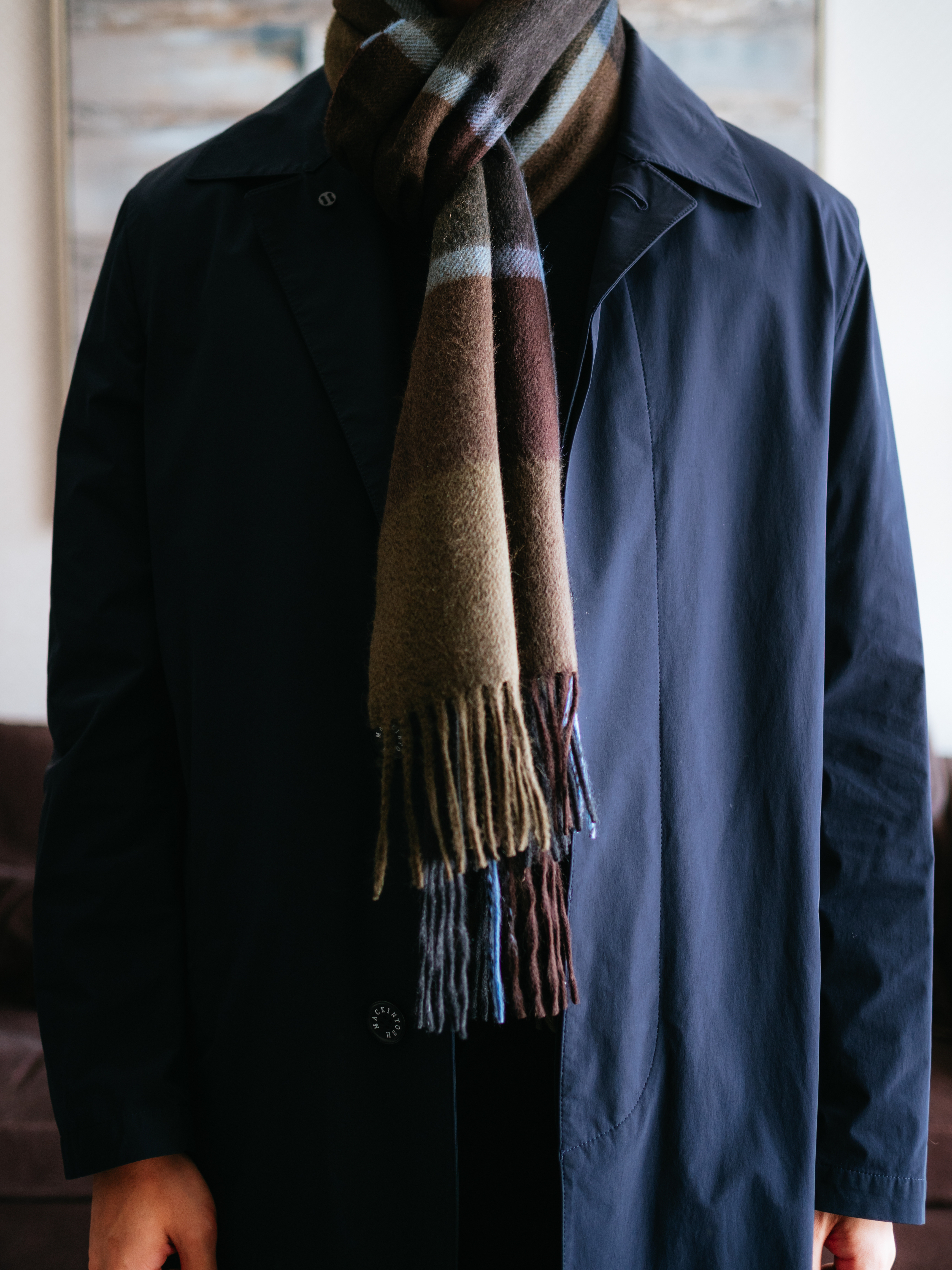 近年はマフラー、ストールの生産に力を入れています。生地を生産してきたブランドのため、起毛コートの仕上げを踏襲した、生地密度が高く、しっかりと重量感のある、丁寧に起毛されたカシミヤマフラー、ストールに定評があります。