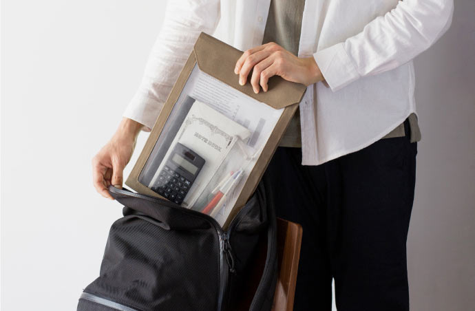 A4サイズなので、たいていのバッグであれば収納できます。また、厚みが最大2cmのため、かさばりません。