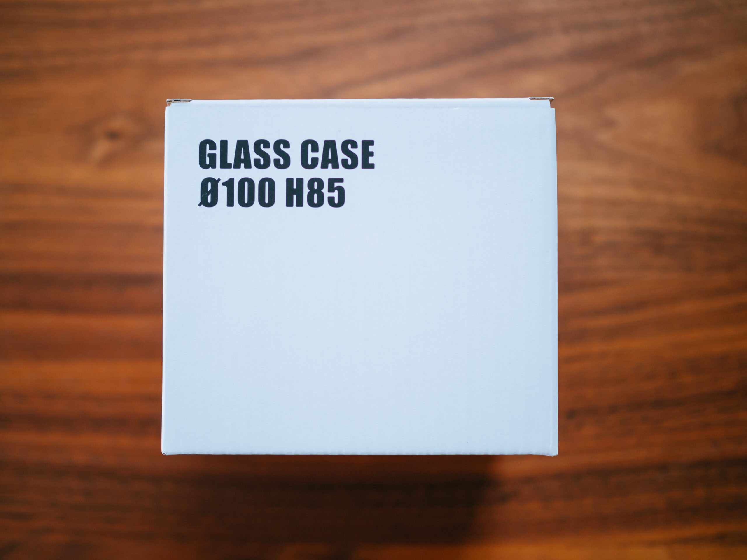 実験室にありそうなシンプルなデザインのガラスケース。クリア、スモーク、フロストの3色展開。サイズは直径は共通で100mm、高さが55mm、85mm、130mmの3サイズあります。