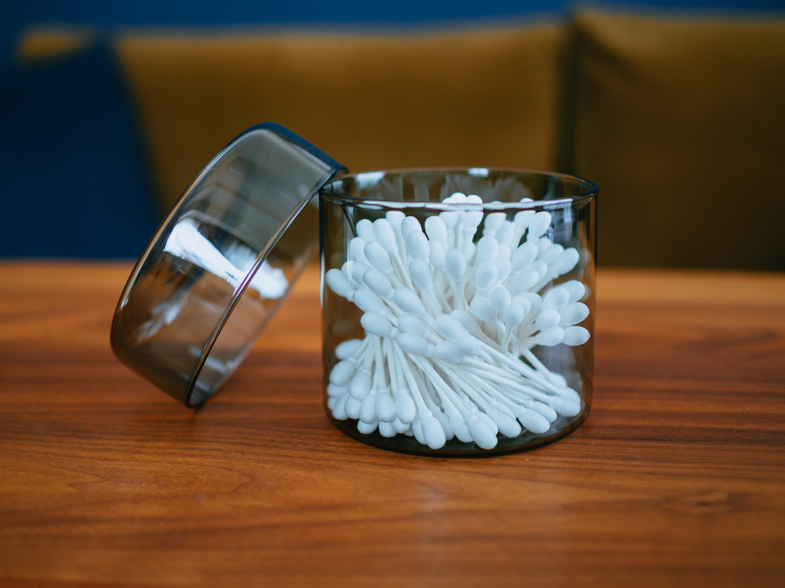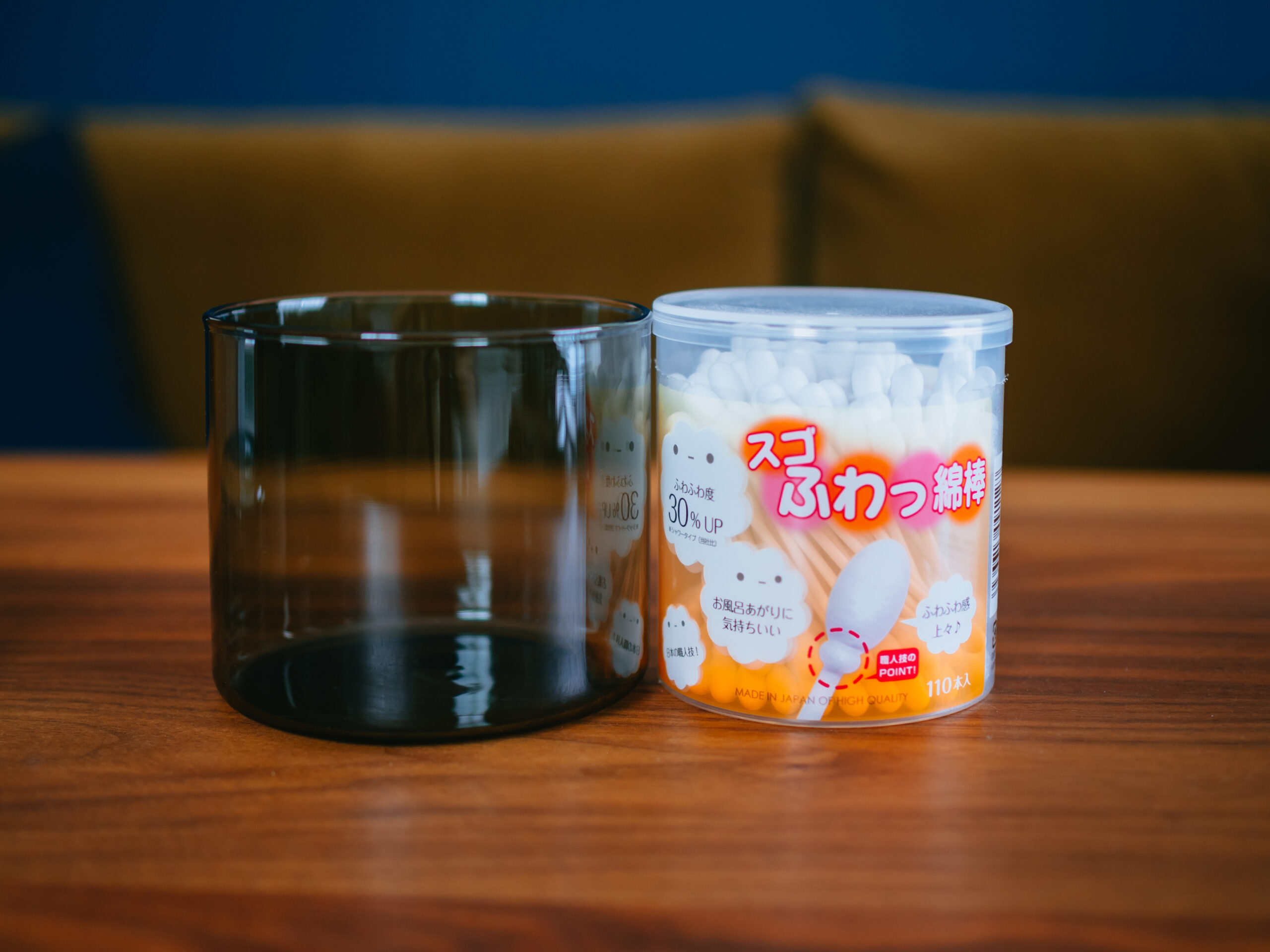 いつも使っている綿棒のパッケージが部屋に馴染まず目立っていたので、中身をKINTOのガラスケースに入れ替えてみました。スモークの重厚感で雰囲気が引き締まり、良い感じです。