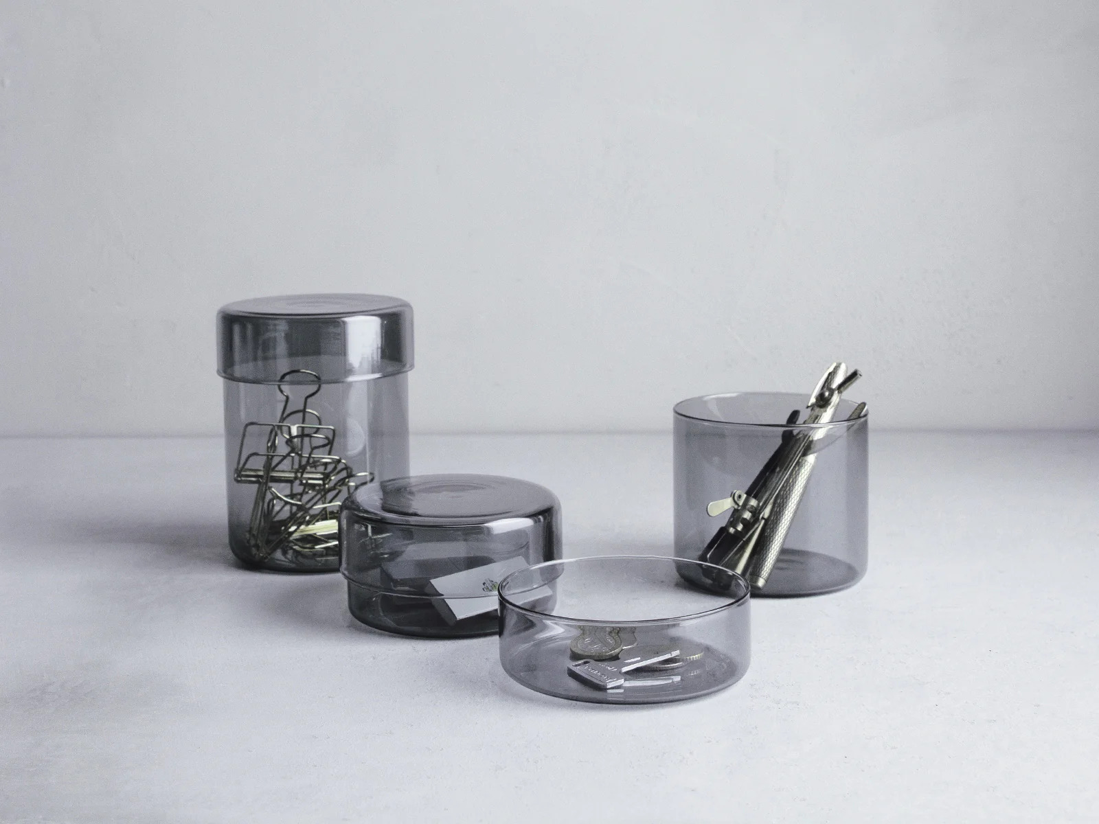 インテリア雑貨通販サイトを眺めていたら、KINTO(キントー)のガラスケース「SCHALE」が目に留まり、最近追加されたスモークというカラーに一目惚れしたので、小物入れとして試しに1つ購入してみました。