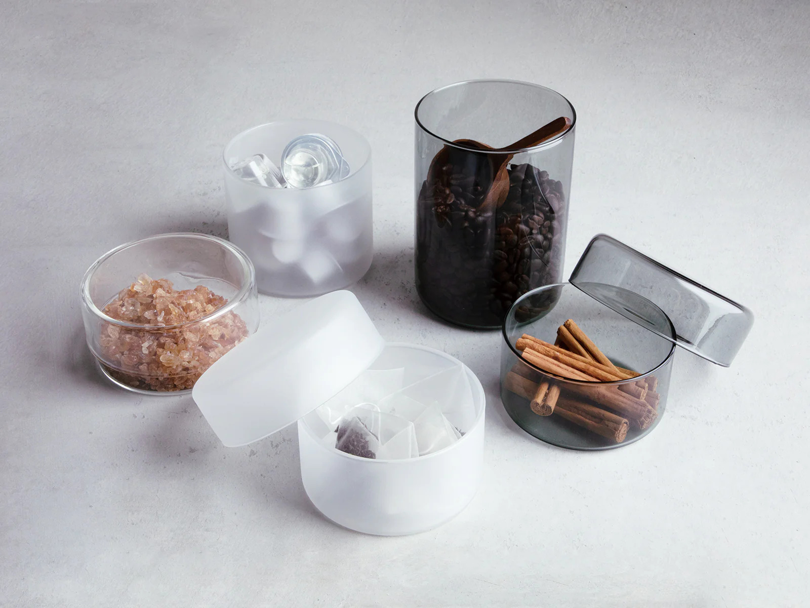 クリアとスモークは透明で中身がしっかり見えるので、お洒落に見せる収納として、食材、小物、バスルーム用品などを入れる容器としてぴったりです。