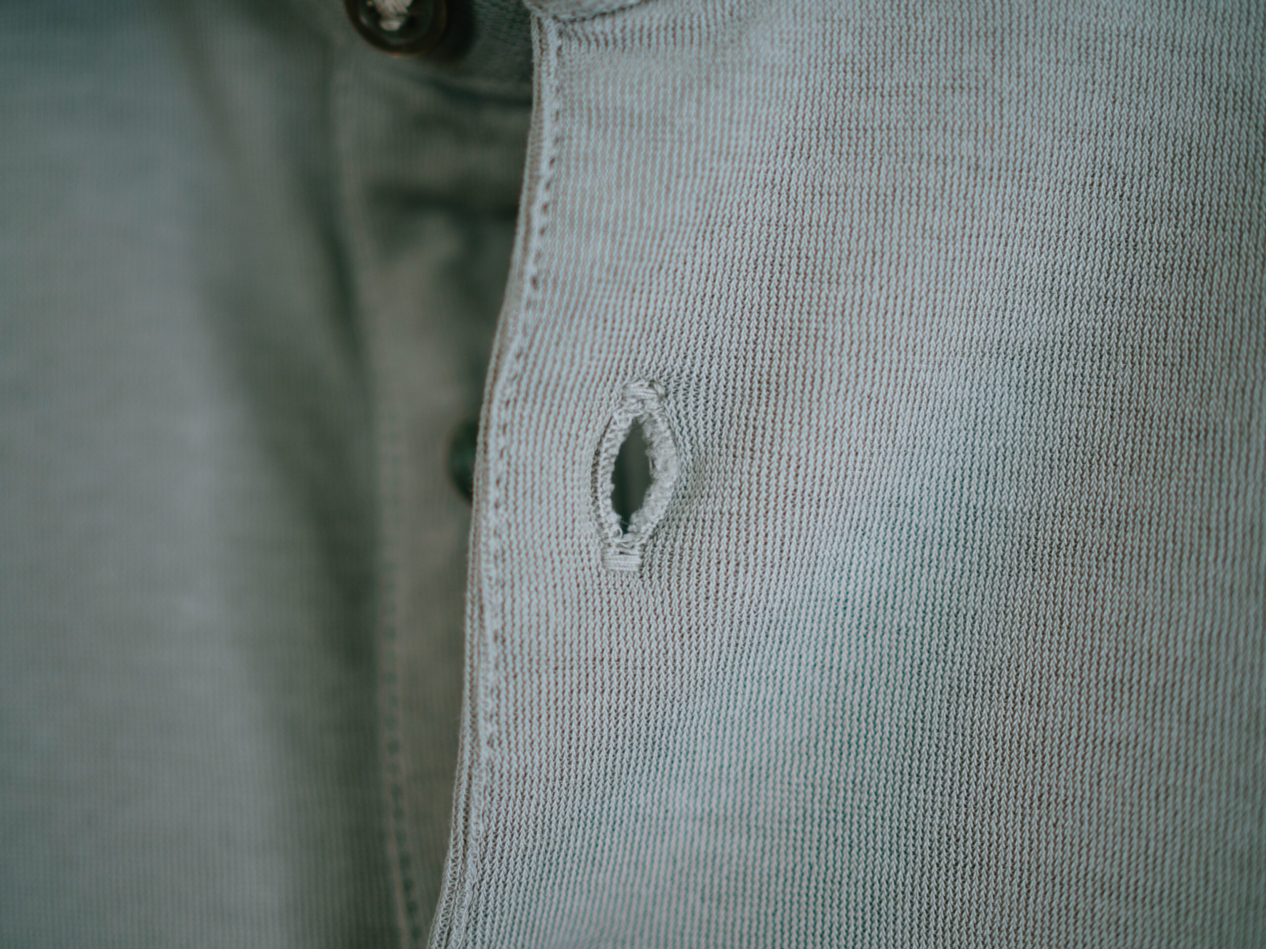 黒の高瀬貝ボタンが3つ。ボタンホールの処理はあまいですが、上下の補強縫いはしっかり施されています。