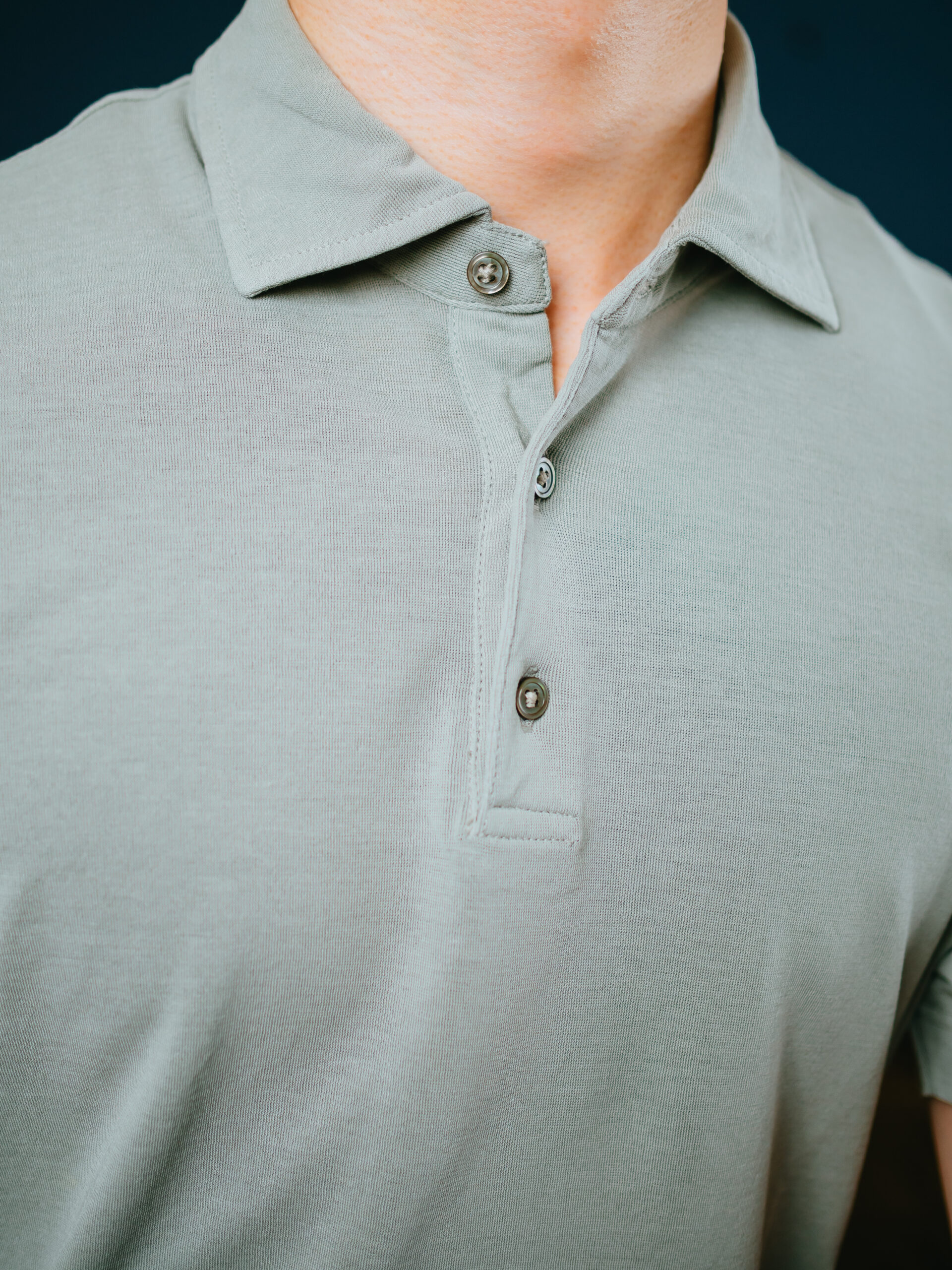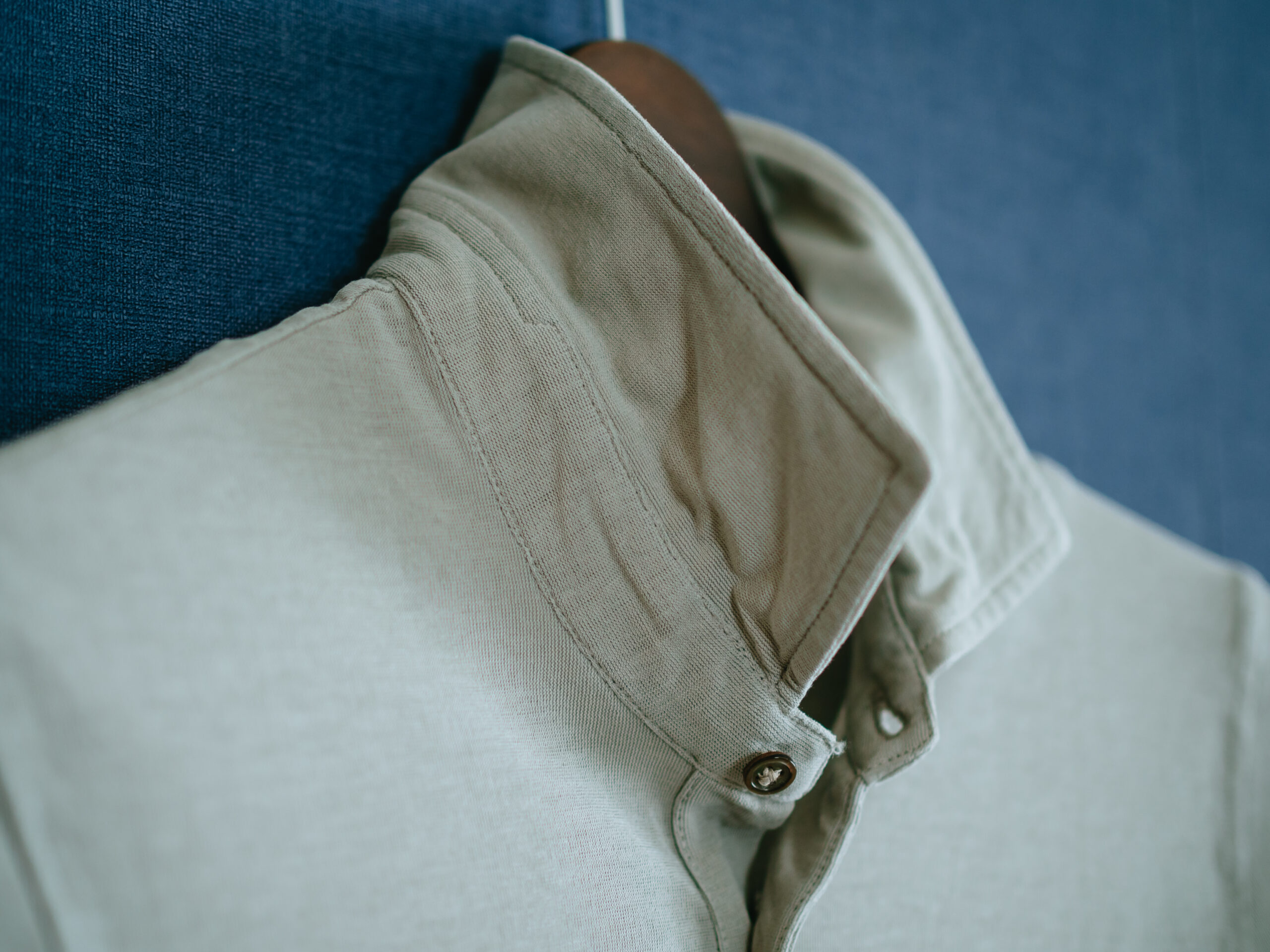 カーキ色。伸縮性のあるジャージー生地で、かつ、目の細かい鹿の子生地にもなっているので、通気性抜群で肌触りはサラサラ。FEDELIのジャージー生地とZANONEのアイスコットンピケ生地の融合のよう。