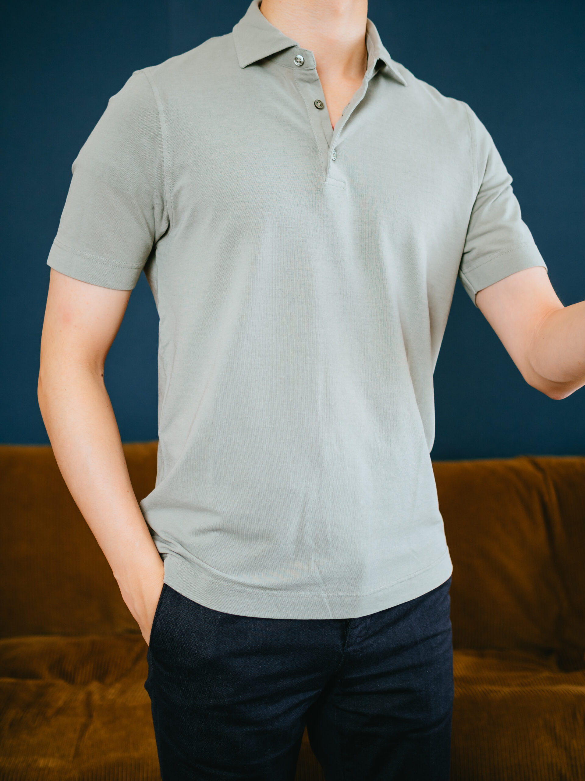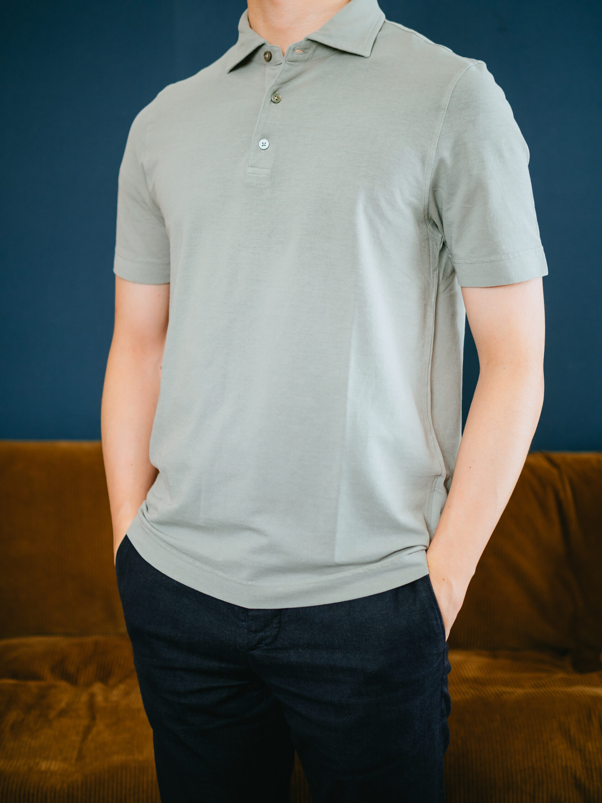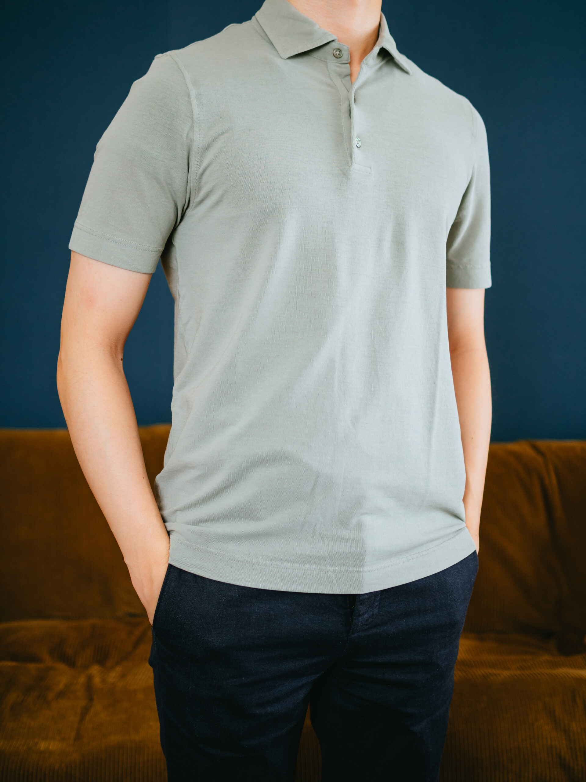肌触りはFEDELIのジャージーポロのほうがしっとりしていて気持ち良いですが、通気性はこのLARDINIのポロのほうが良いです。袖丈や着丈が短すぎずちょうど良いシルエット。