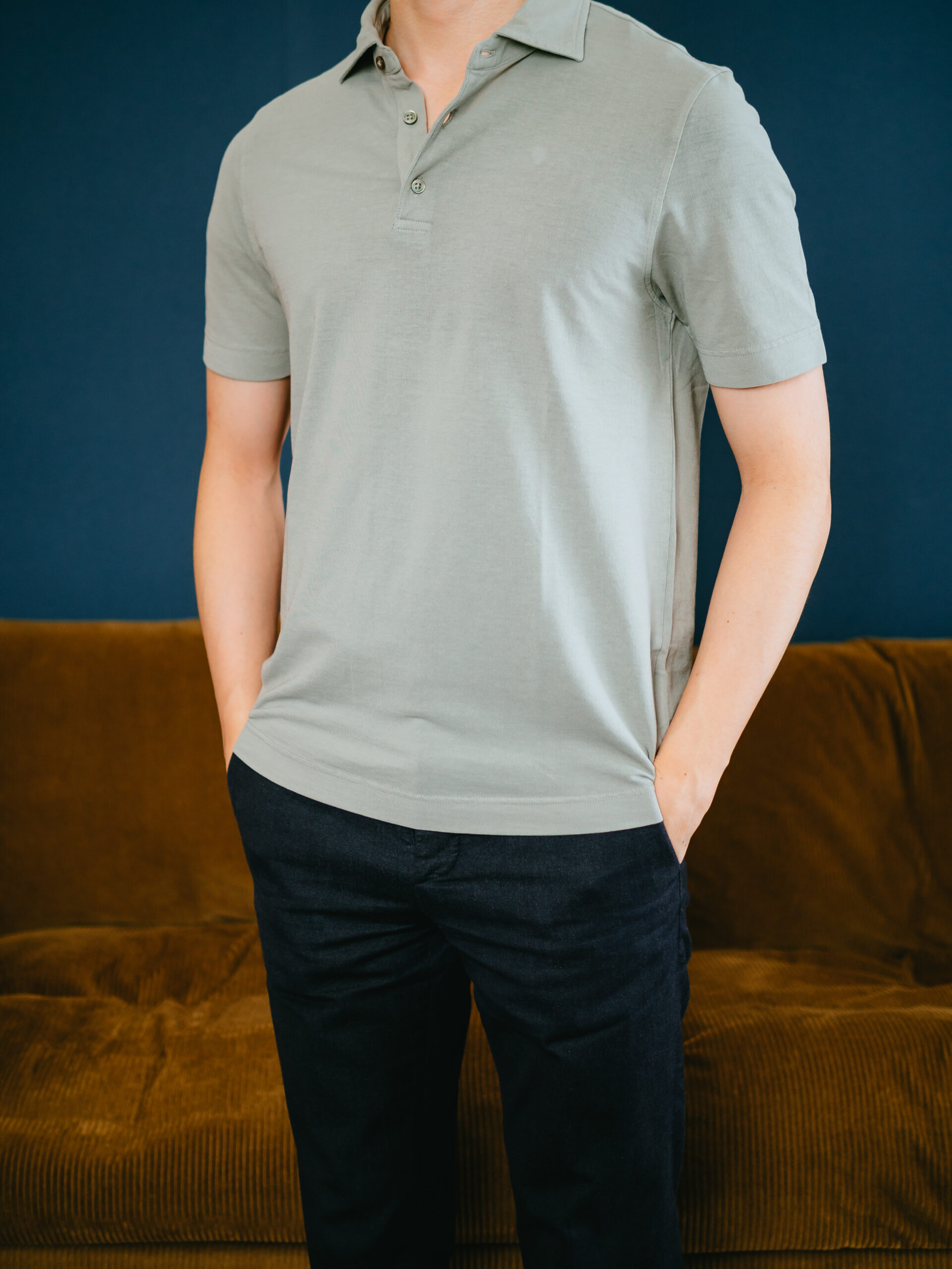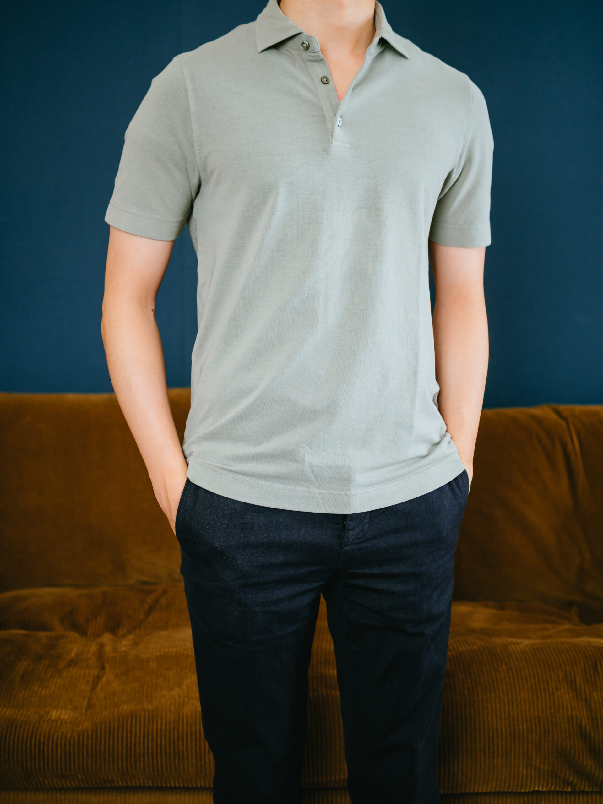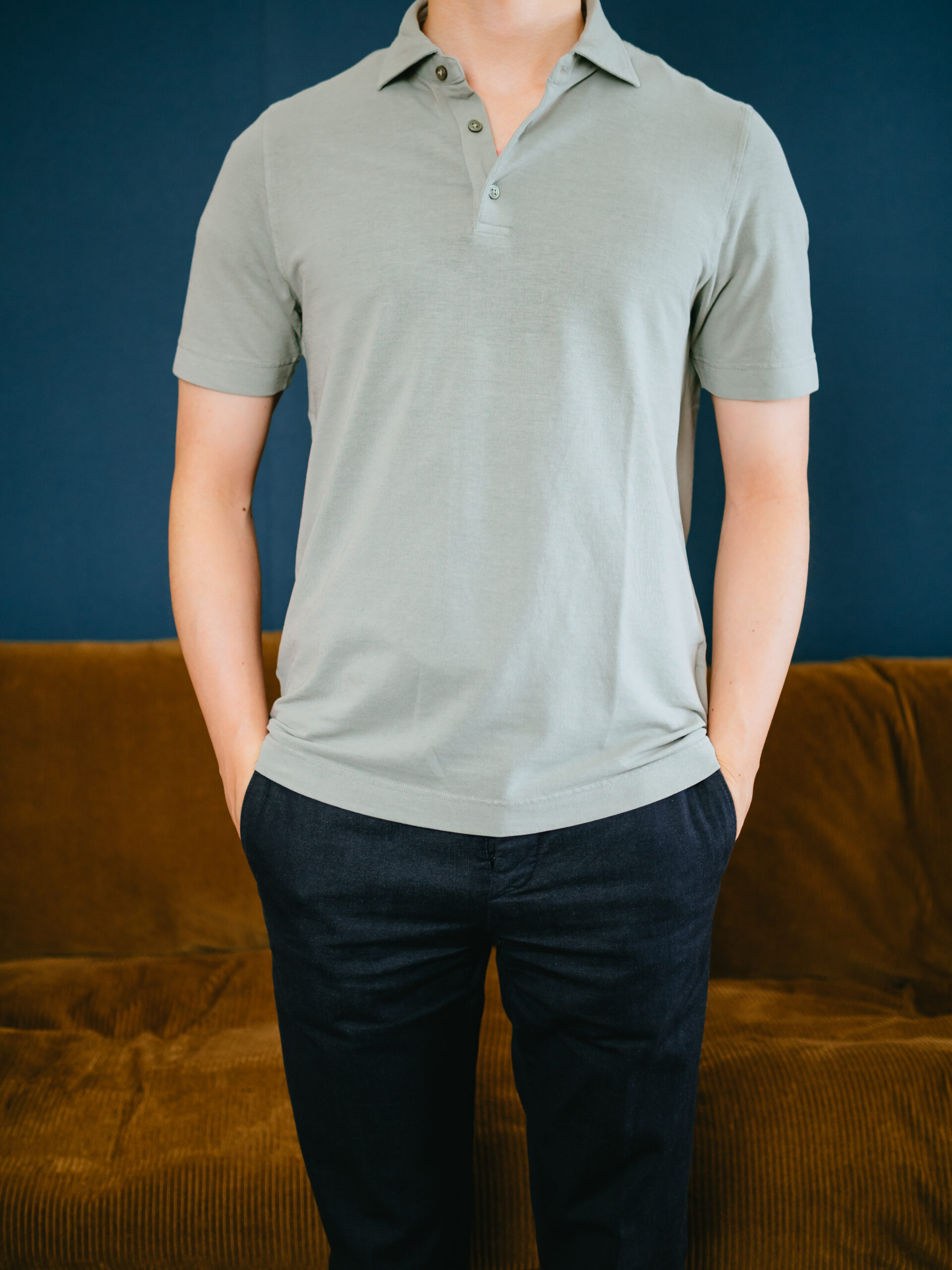 肌触りはFEDELIのジャージーポロのほうがしっとりしていて気持ち良いですが、通気性はこのLARDINIのポロのほうが良いです。袖丈や着丈が短すぎずちょうど良いシルエット。