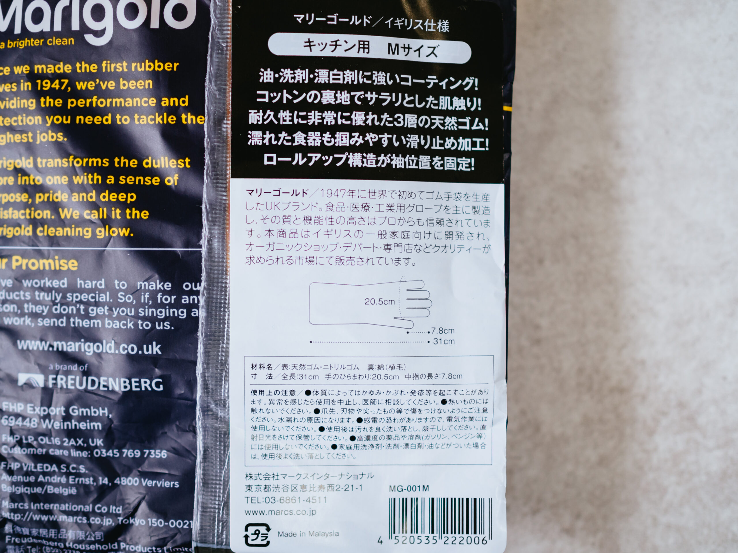 家庭用に製造した初めてのゴム手袋「Marigold」。イギリスブランドに惹かれて購入しましたが、定価約700円とゴム手袋にしてはお高め。しかし、これ以上のゴム手袋はないと思えるほど良いモノでした。