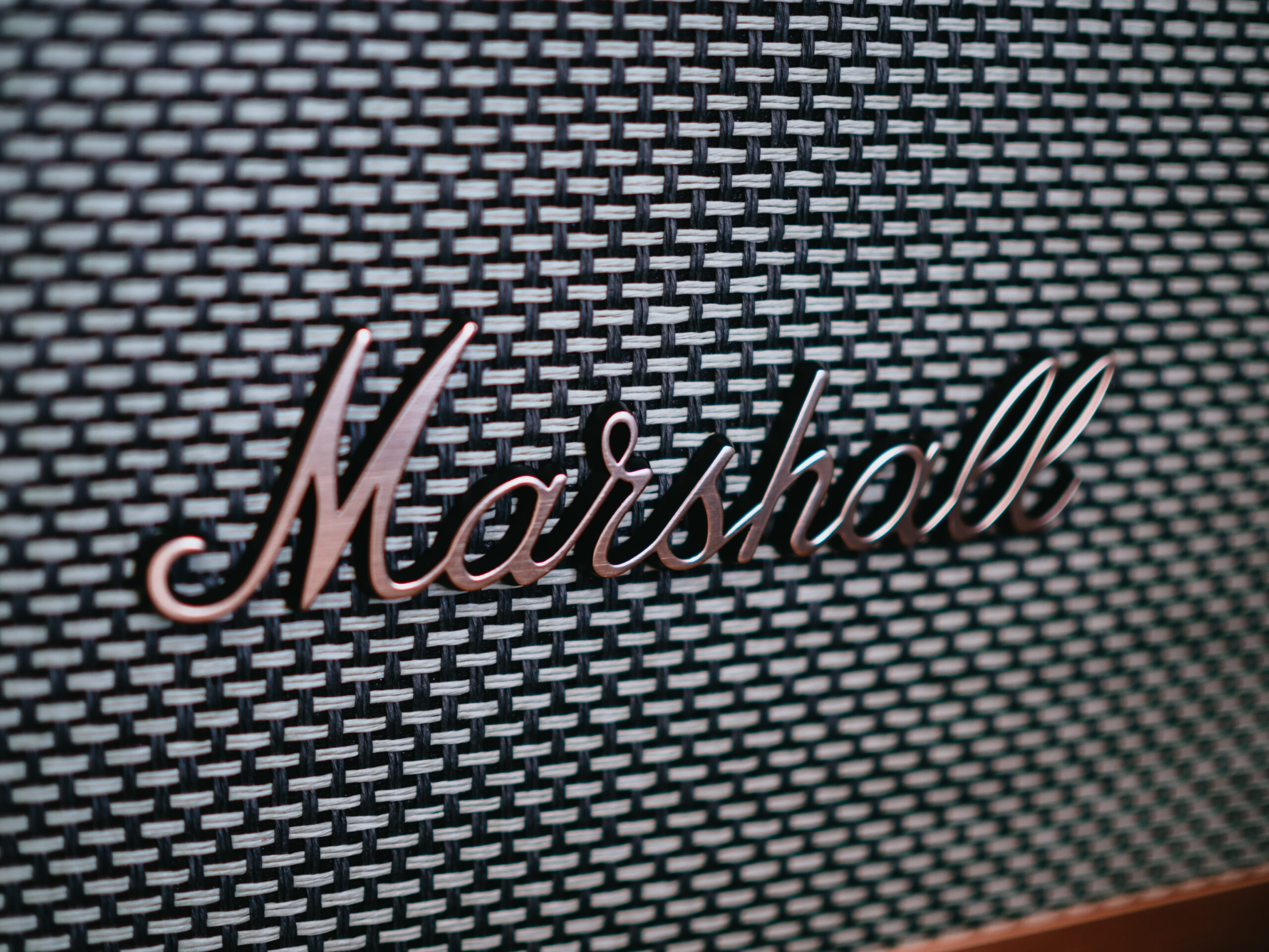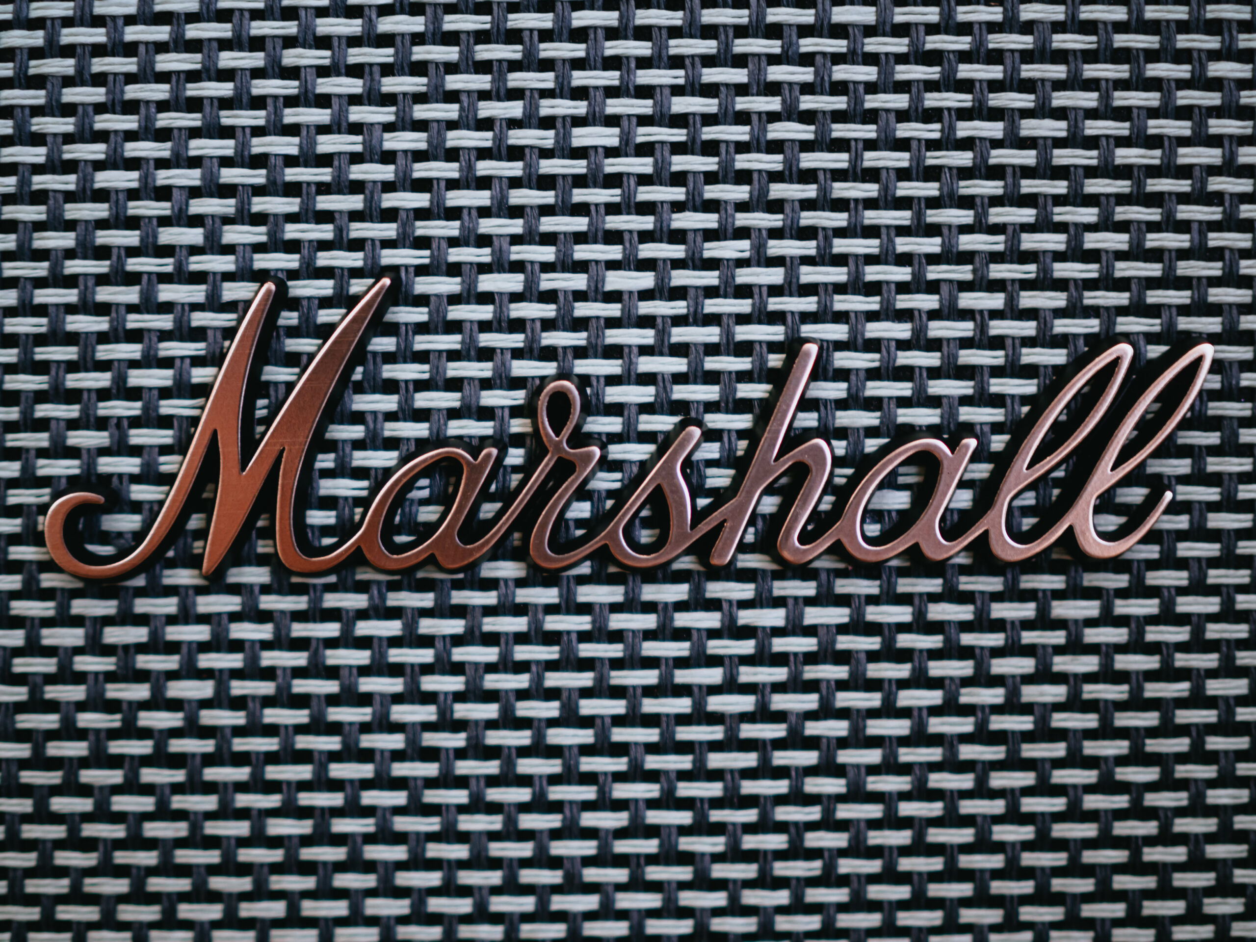 スピーカーのグリルは「FRET00012 ブラック/クリームのソルト・アンド・ペッパー」。マーシャルのロゴは高級感のあるブロンズ色です。