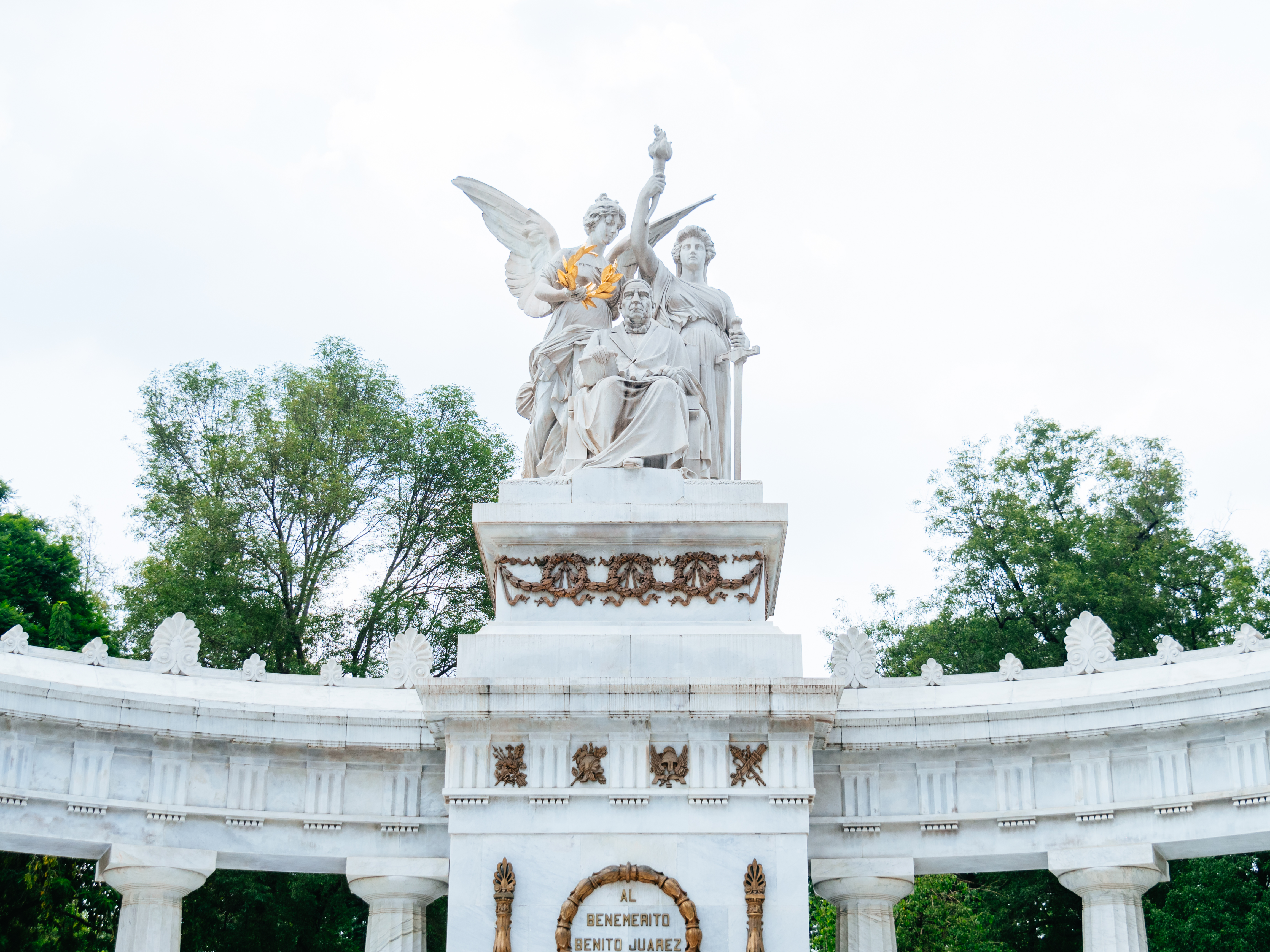 新古典主義の12本のドーリア式の柱、中央にベニート・フアレス、左右に月桂樹の冠を持つ「祖国」と松明を持つ「法律」を象徴する彫刻像があり、下部中央には「“Al Benemérito Benito Juárez, la Patria”(祖国の名誉あるベニート・フアレスへ捧げる)」と書かれています。