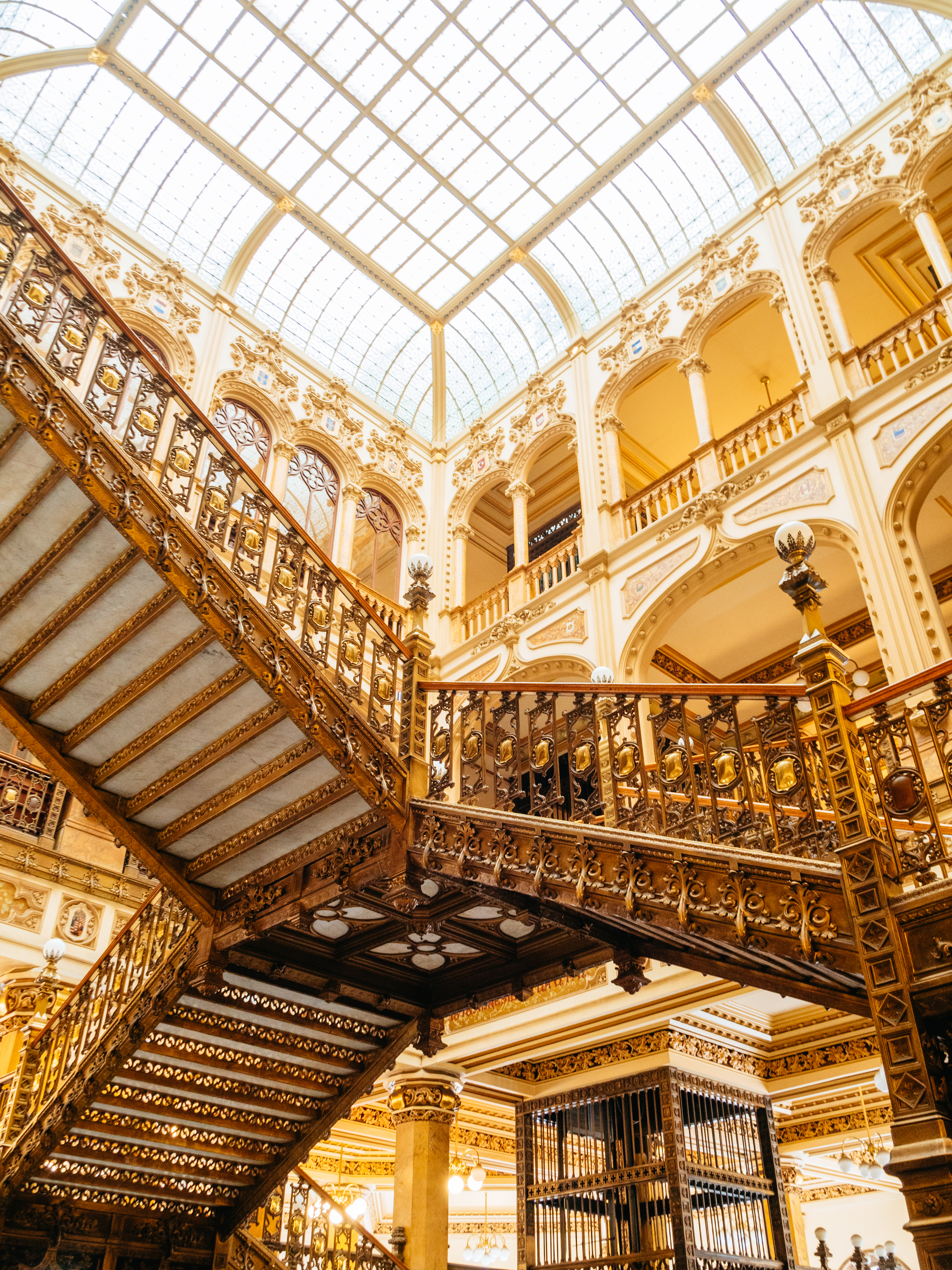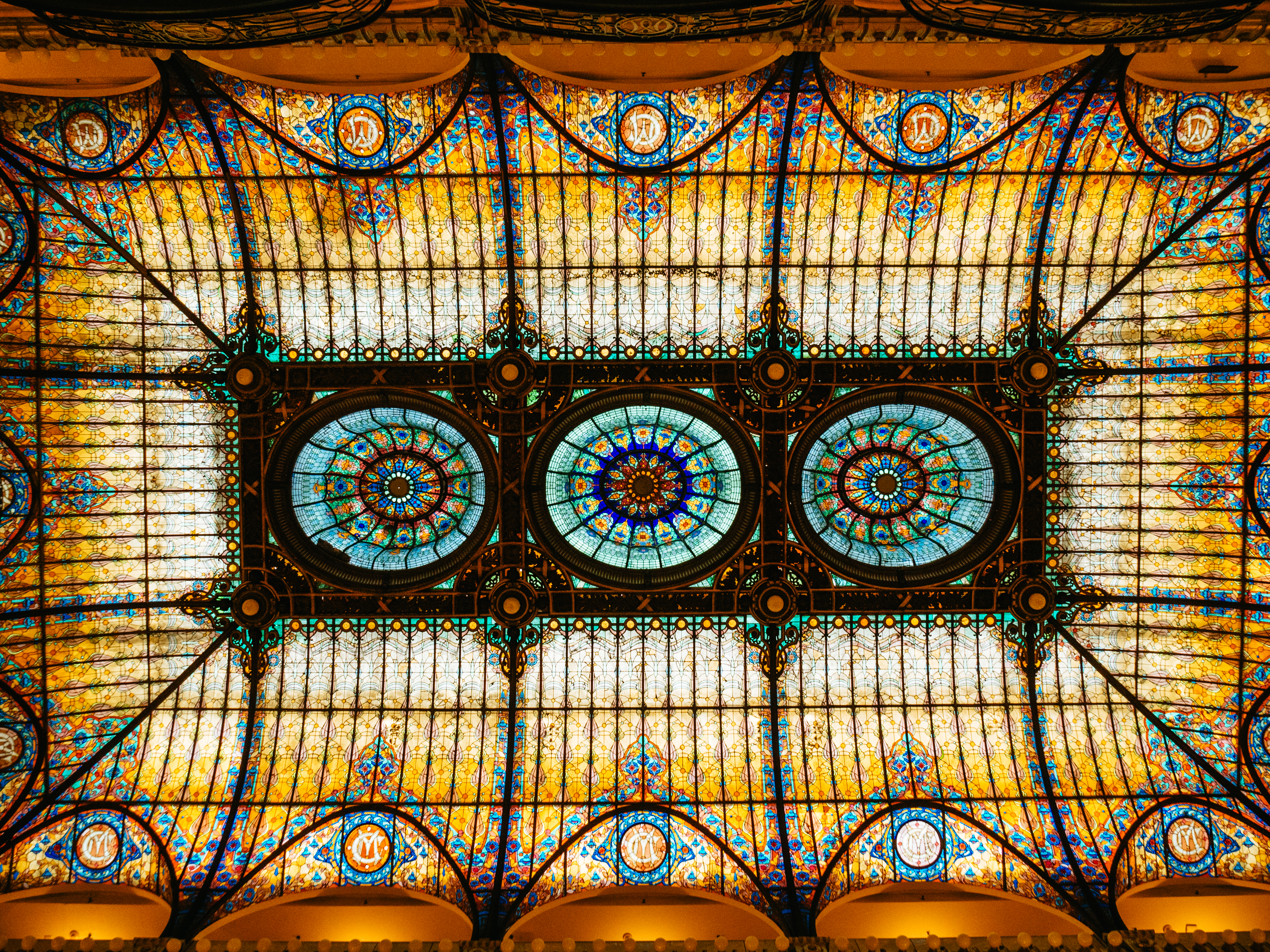 天井に広がる巨大なステンドグラスは、ジュエリーブランド「Tiffany & Co.」の創業者の息子でデザイナーのルイス・コンフォート・ティファニーが開発した2万個のティファニー・ガラスが使われており、フランス人アーティストによって製作された作品。