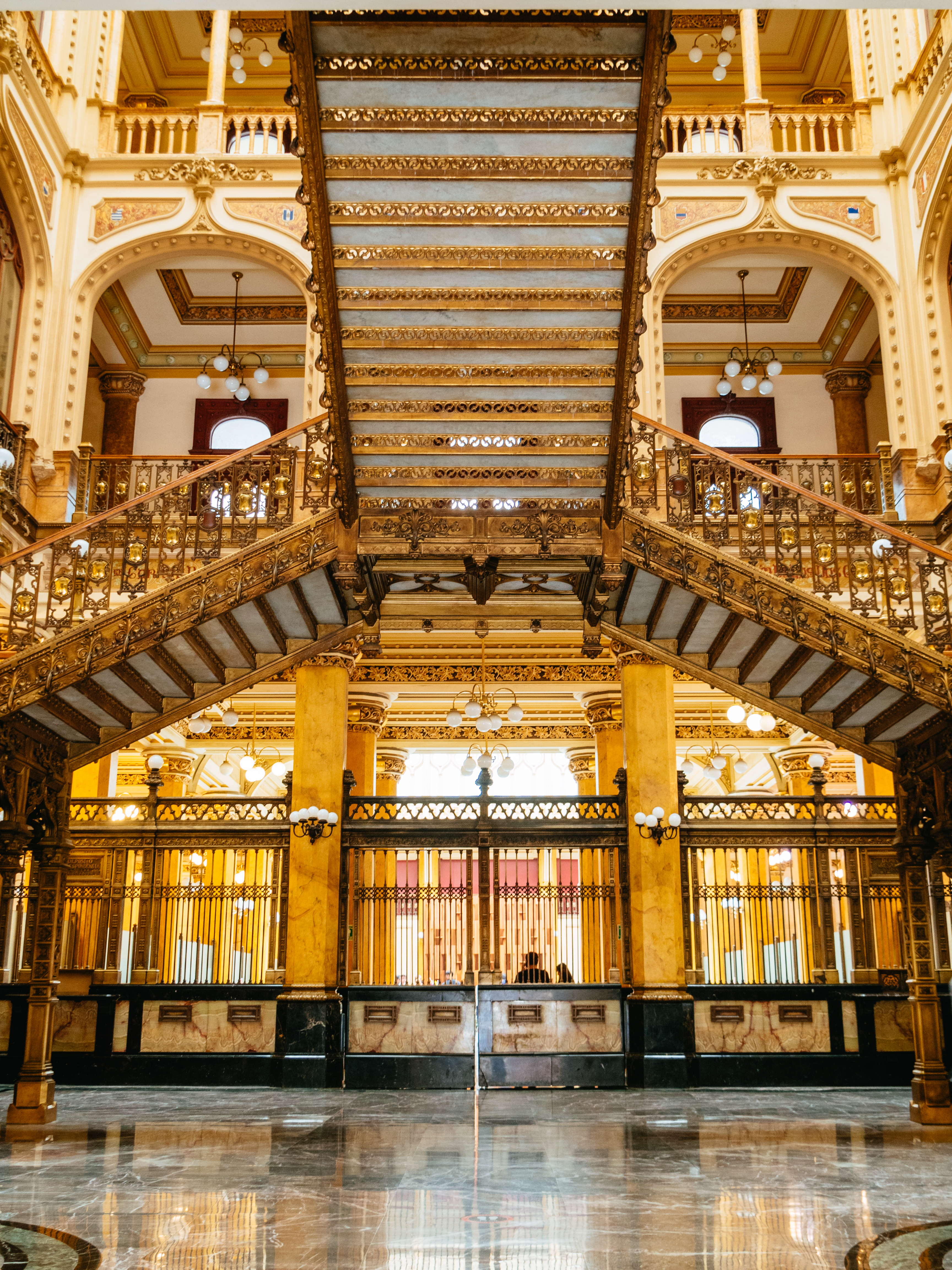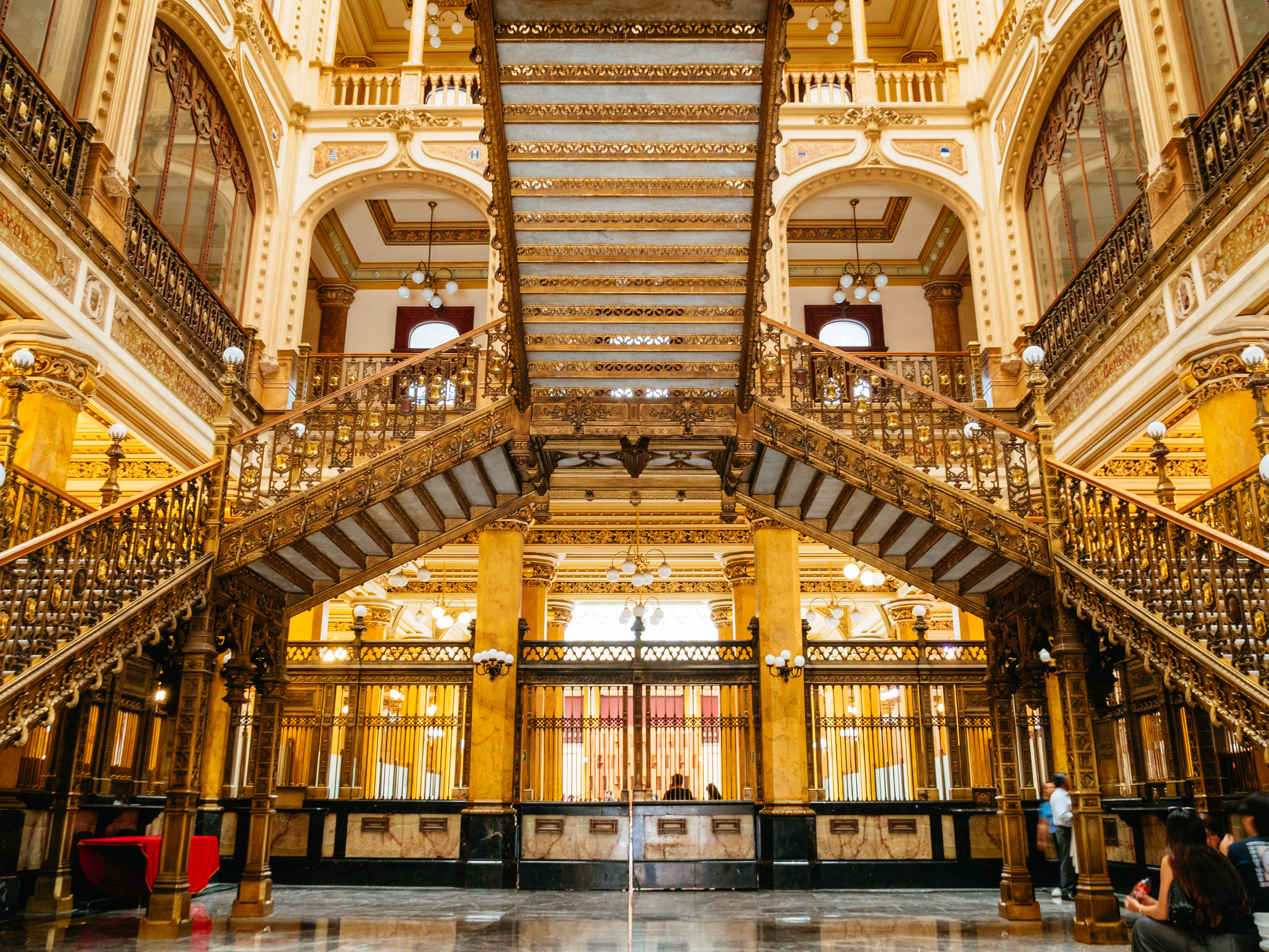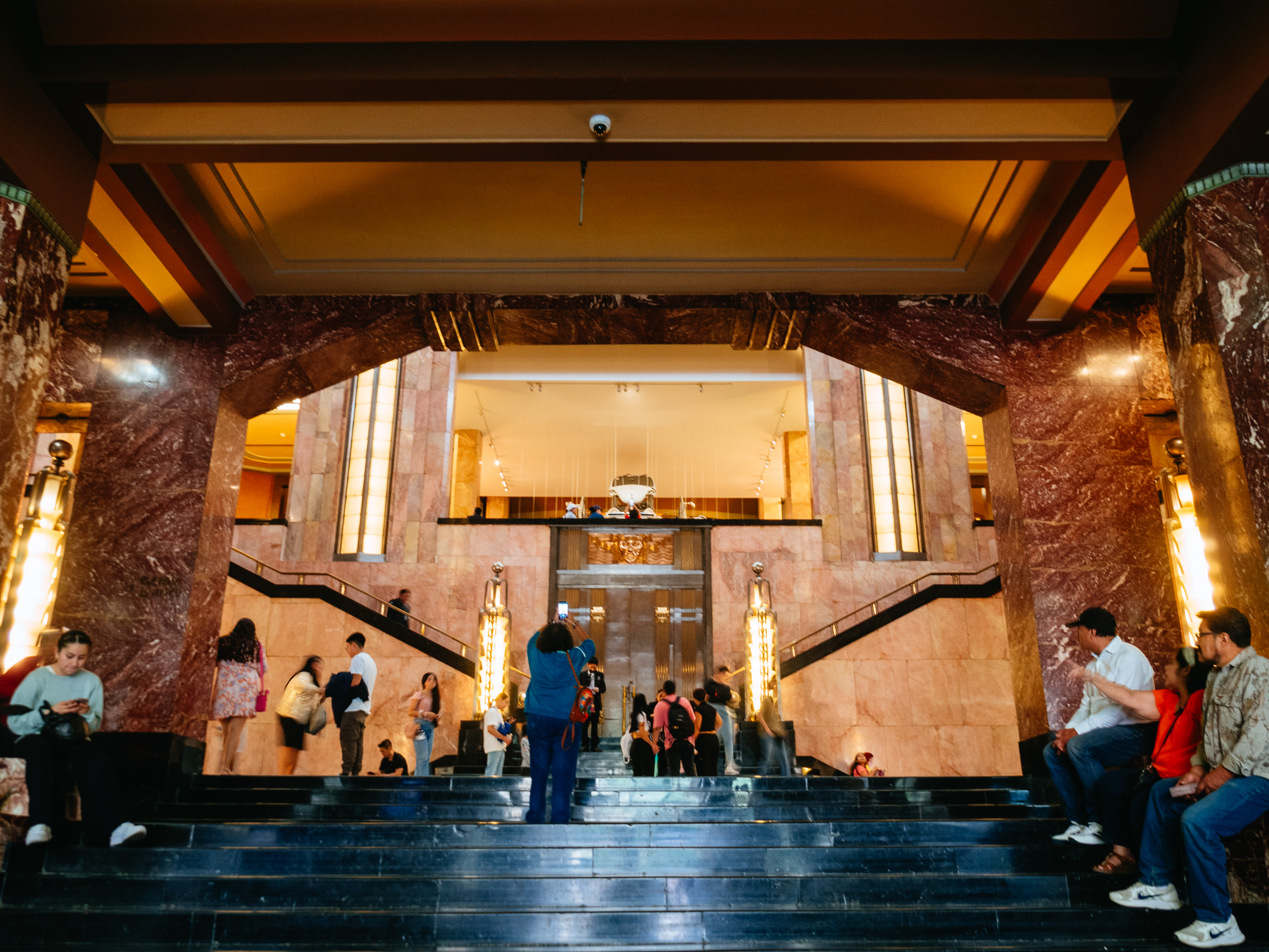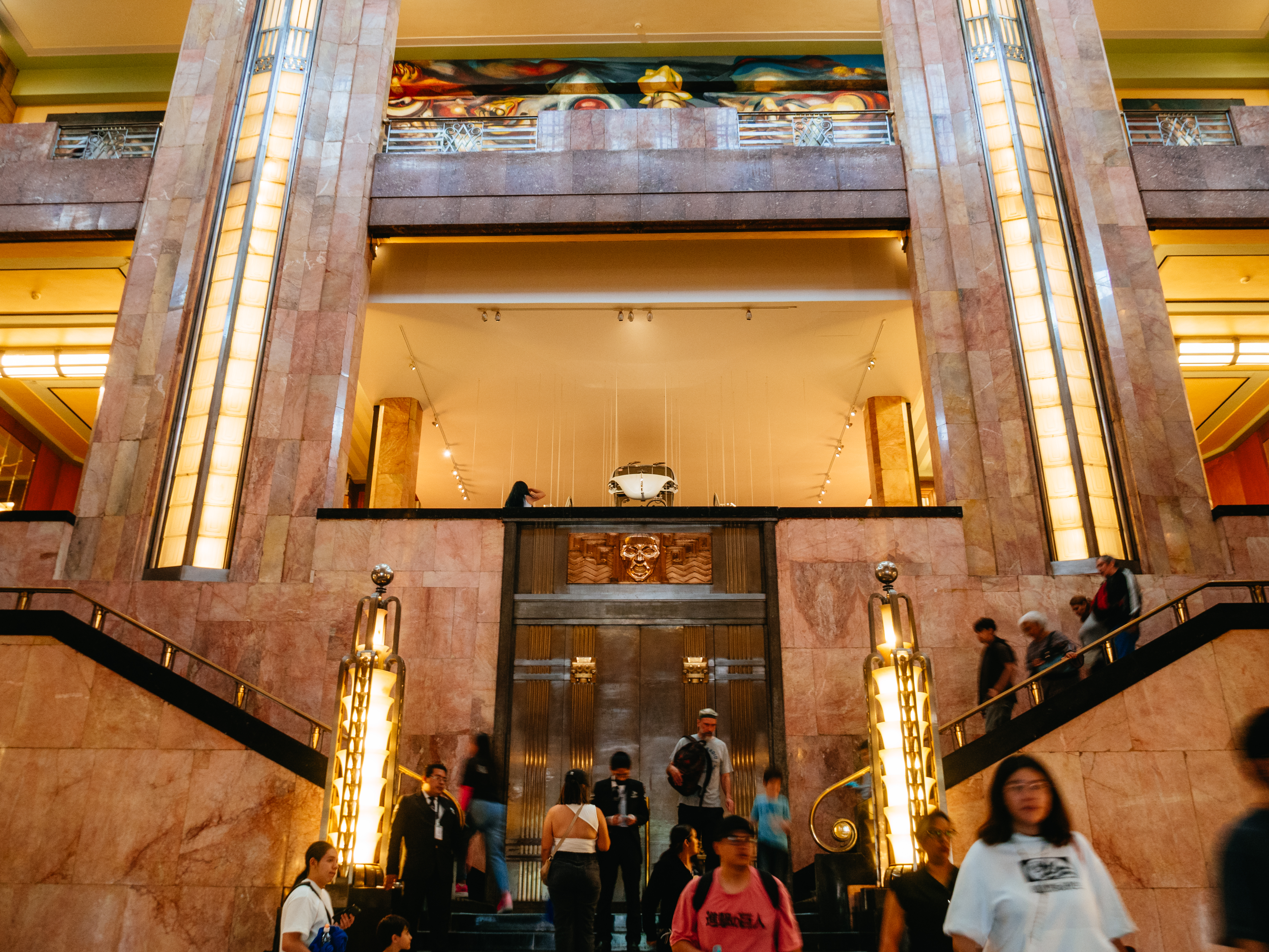 観光客に写真スポットとして人気の階段は正面入口入ってすぐ目の前にあります。階段はメキシコ産の大理石で作られ、ブロンズはイタリアのフィレンツェにあるピニョーネ財団で製作されました。
