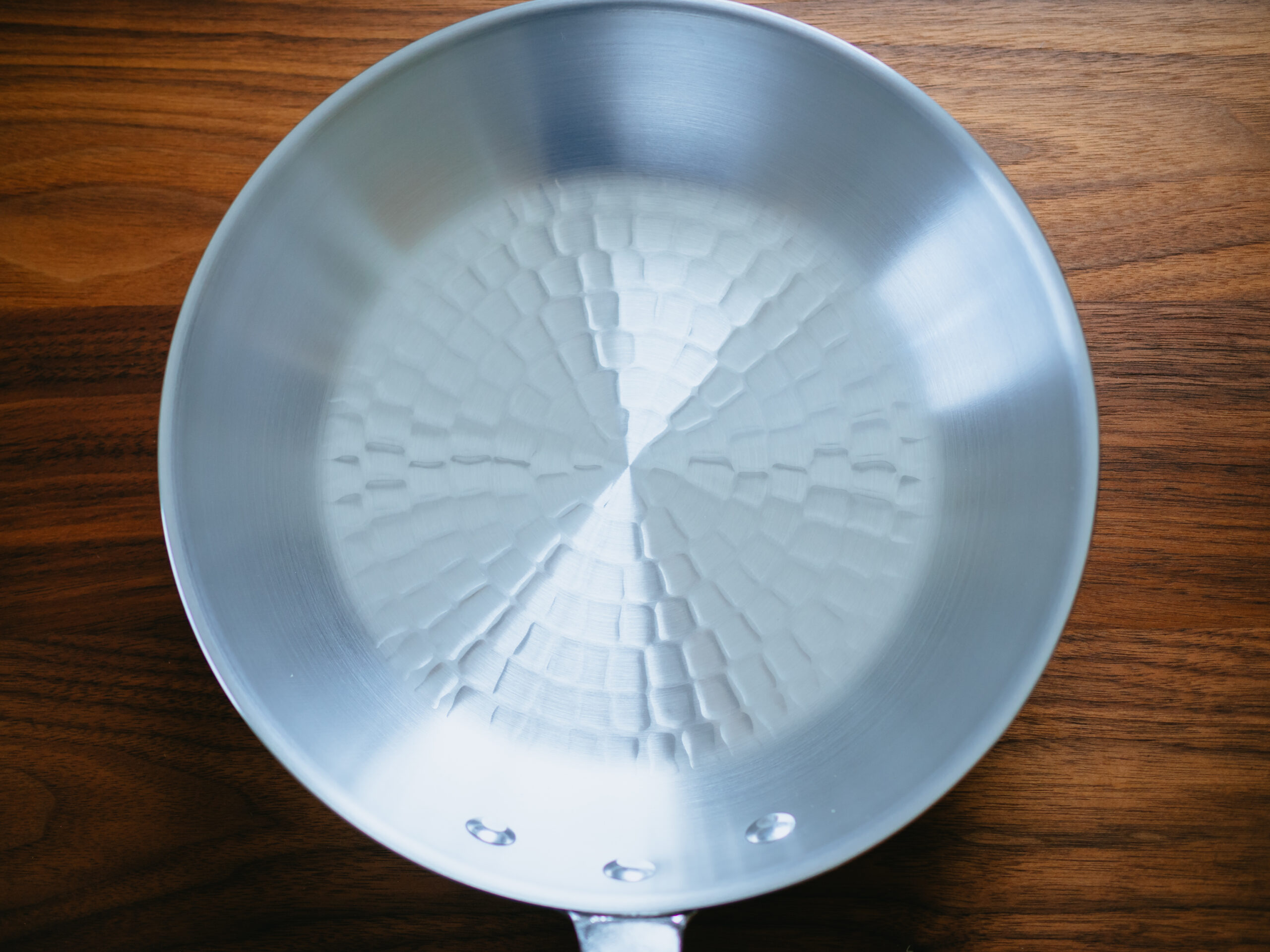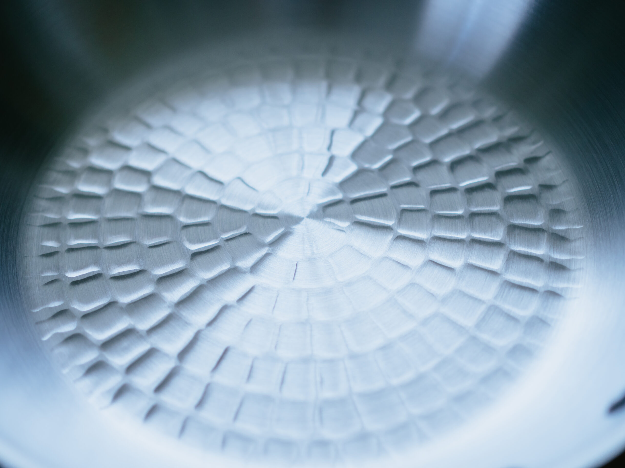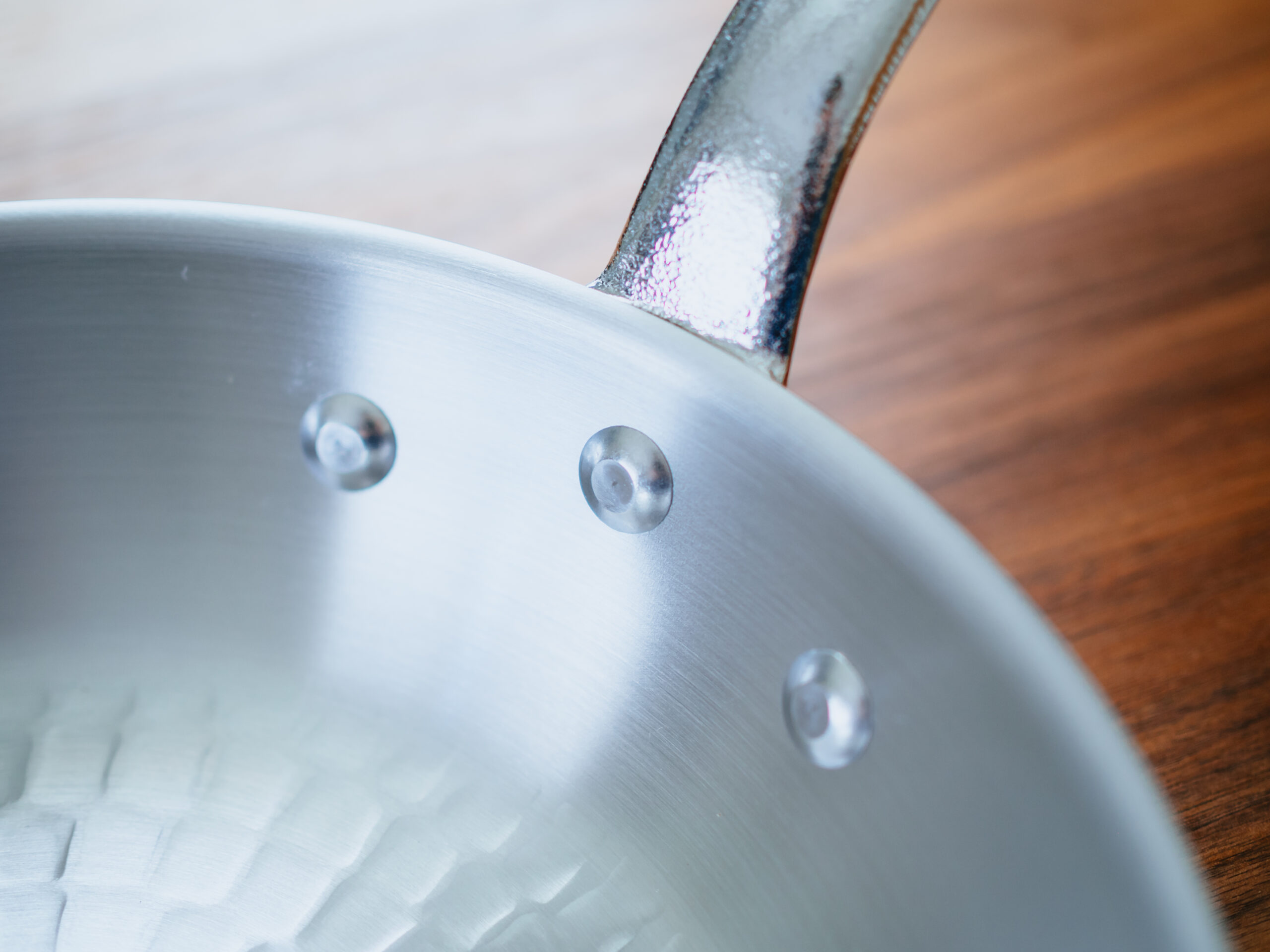 底面に打出しが施されており、強度、熱伝導を上げたハイクラスアイテム。3mmと厚めのアルミ材が熱ムラ無く料理を仕上げてくれます。