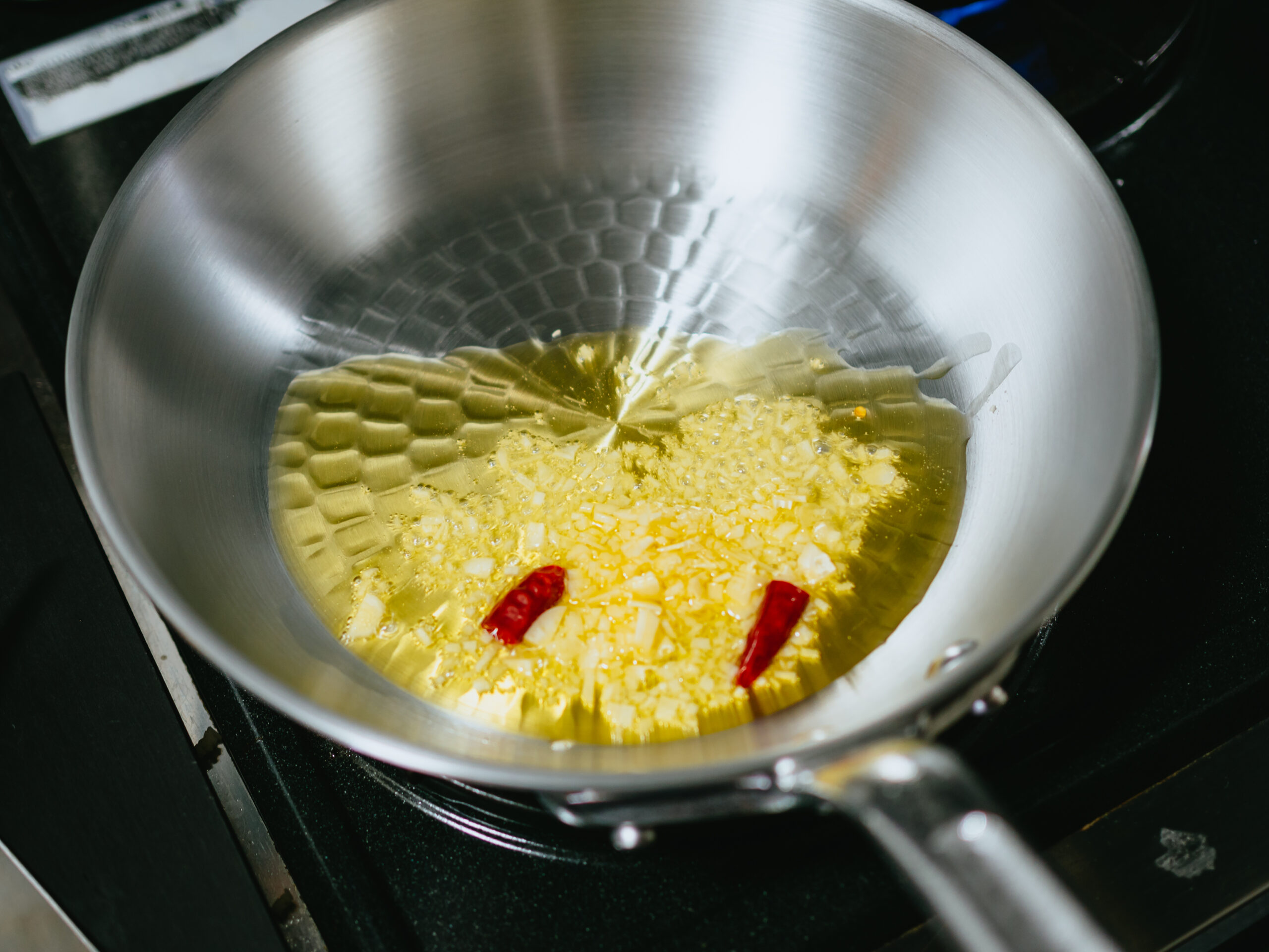熱伝導が高く、保温性が低いので、余熱に神経質にならずに絶妙な火加減を調整しやすいです。鉄のフライパンでは焦げやすいニンニクも焦がさずきつね色にできます。