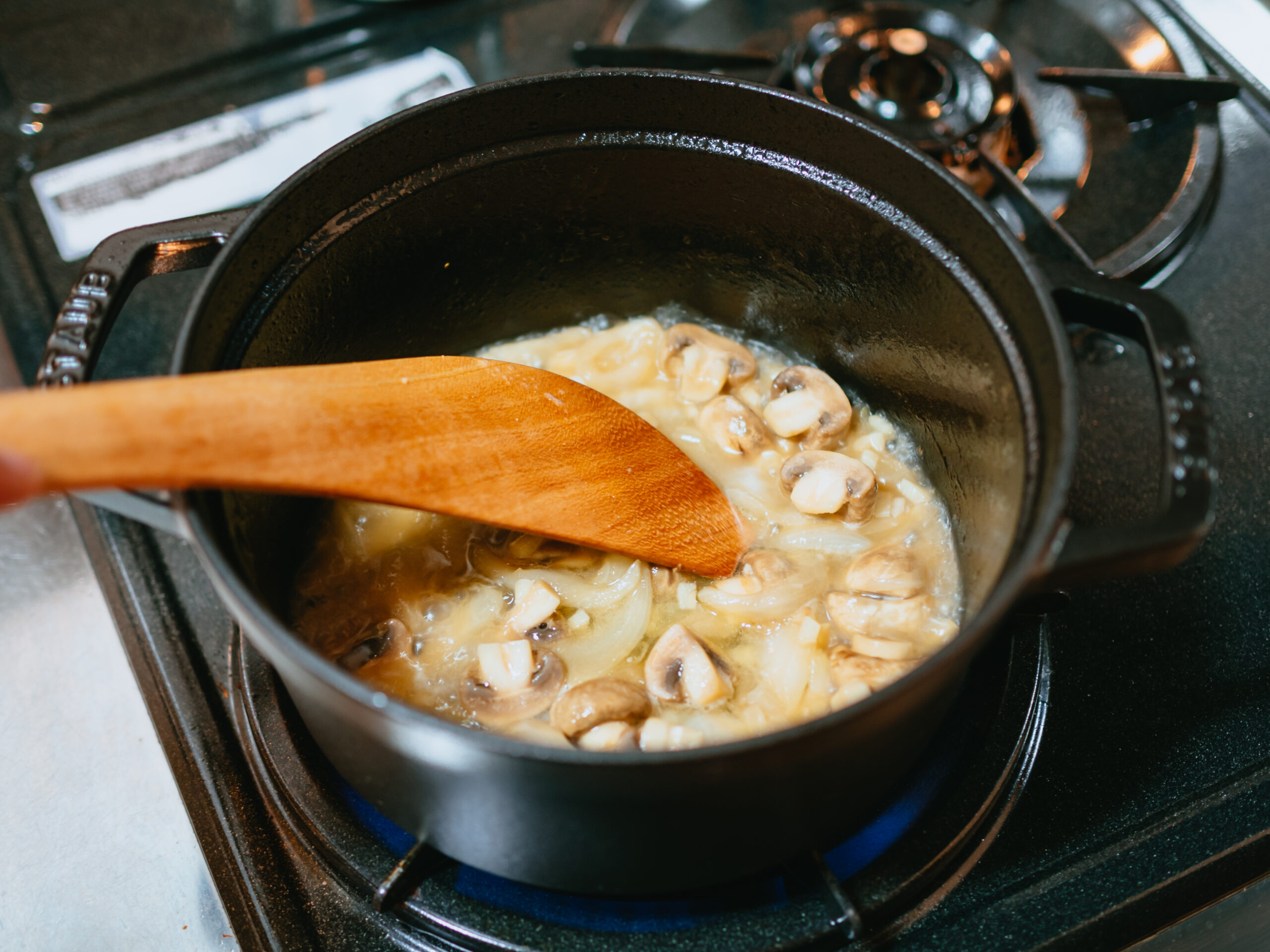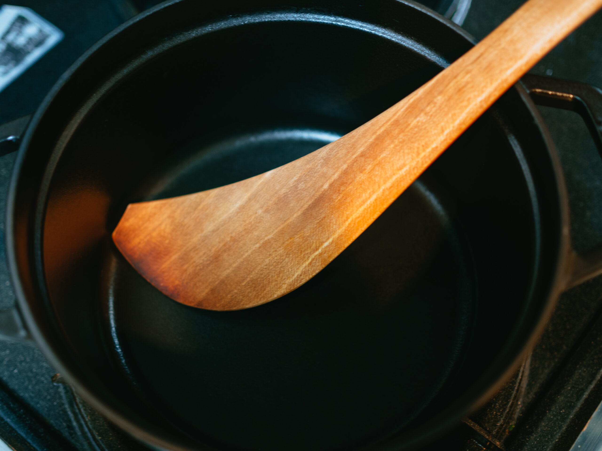 この木べらの最大の特徴はその形。アイスホッケーのスティックのように先端にかけて湾曲しているため、鍋やフライパンの底面にぴったりと沿って、食材を混ぜやすく返しやすいです。具を鍋からかき出す時も鍋肌の食材を綺麗に剥がすことができます。