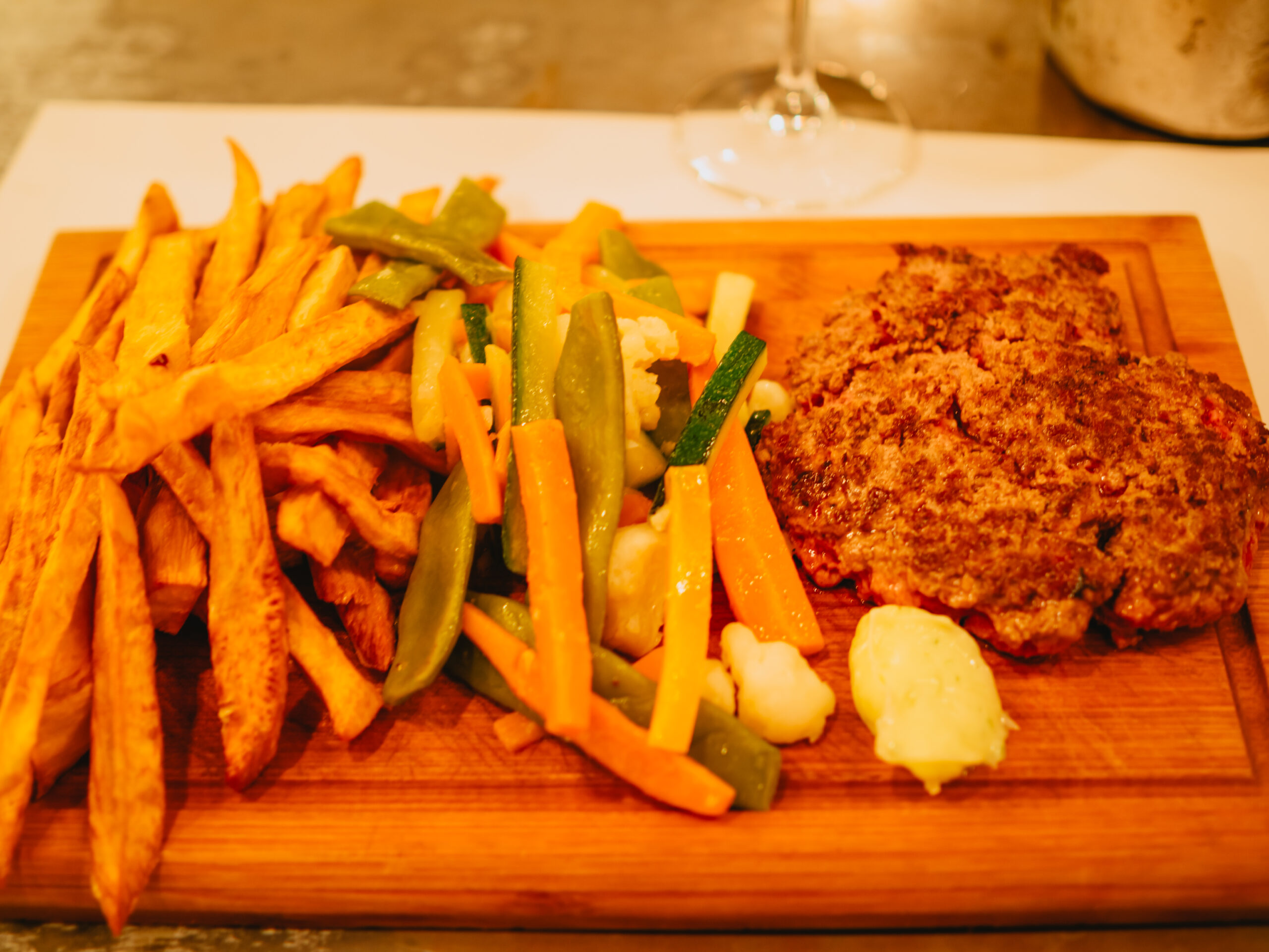 エビのコロッケ1.9ユーロ、赤ワイン3.5ユーロ、和牛ハンバーグプレート11ユーロ、、ベリーのスムージー3.5ユーロを注文。ポルトガルでWAGYUを見かけてちょっと感動しました。付け合わせのスイートポテトフライも美味しかったです。