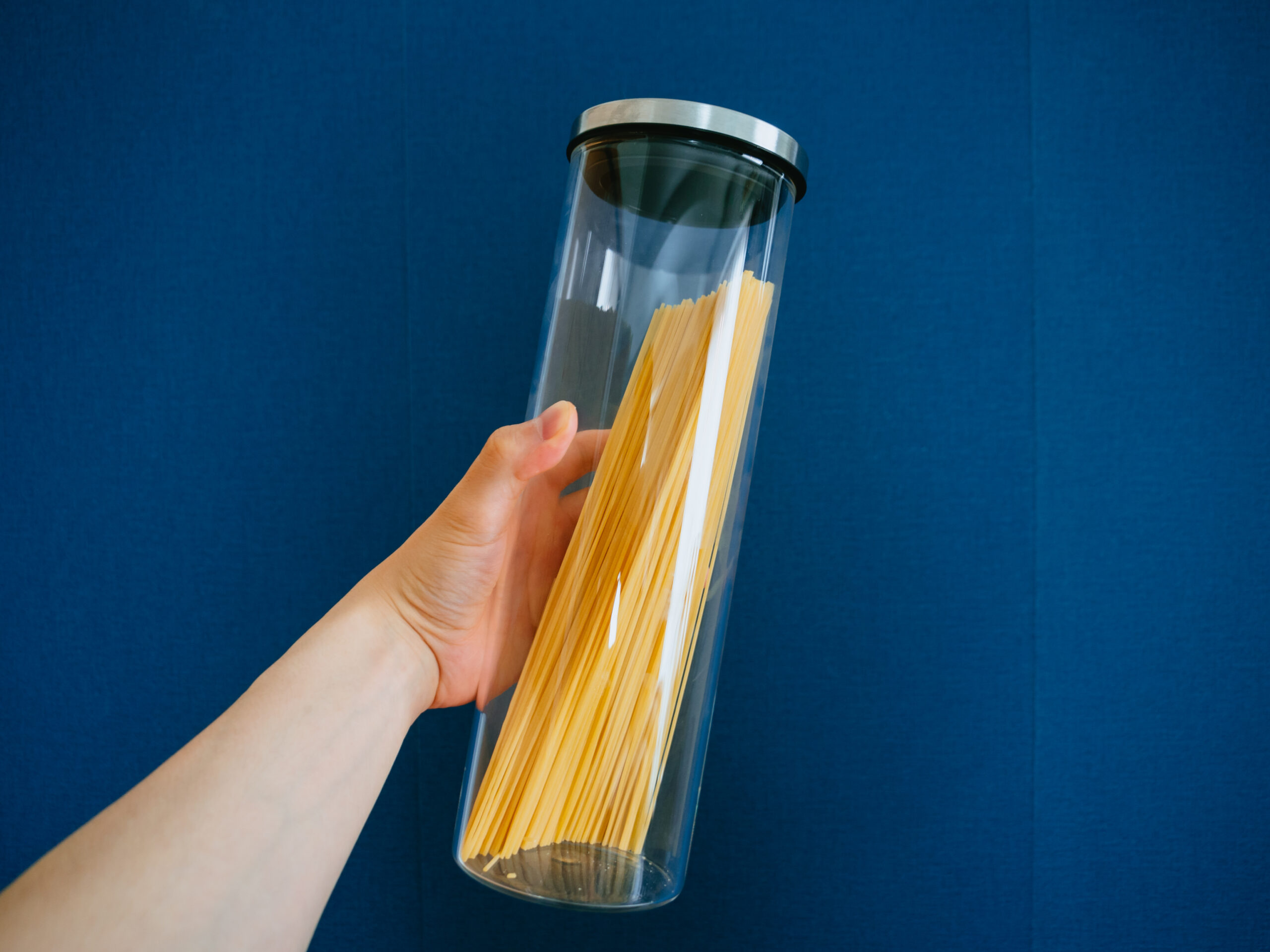 筒型のシンプルなデザインのパスタ容器。中身が見えるものが欲しかったので、透明性が高く高級感のあるガラス素材のものを選びました。