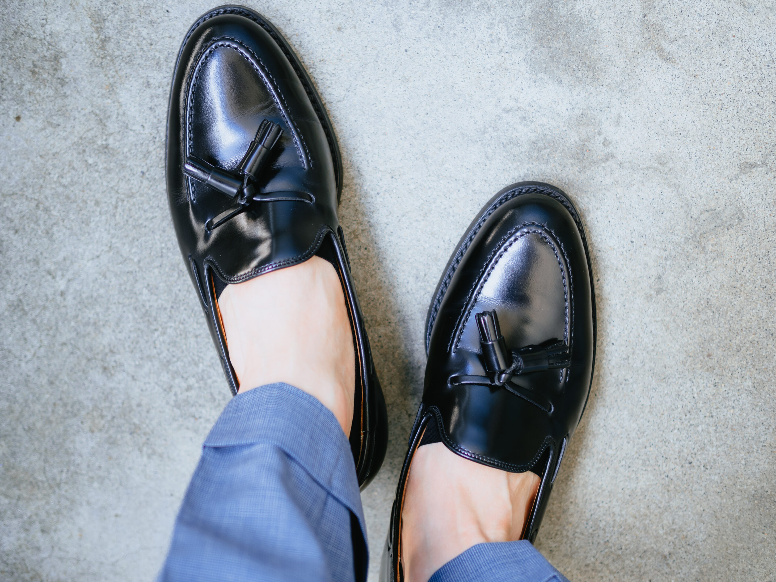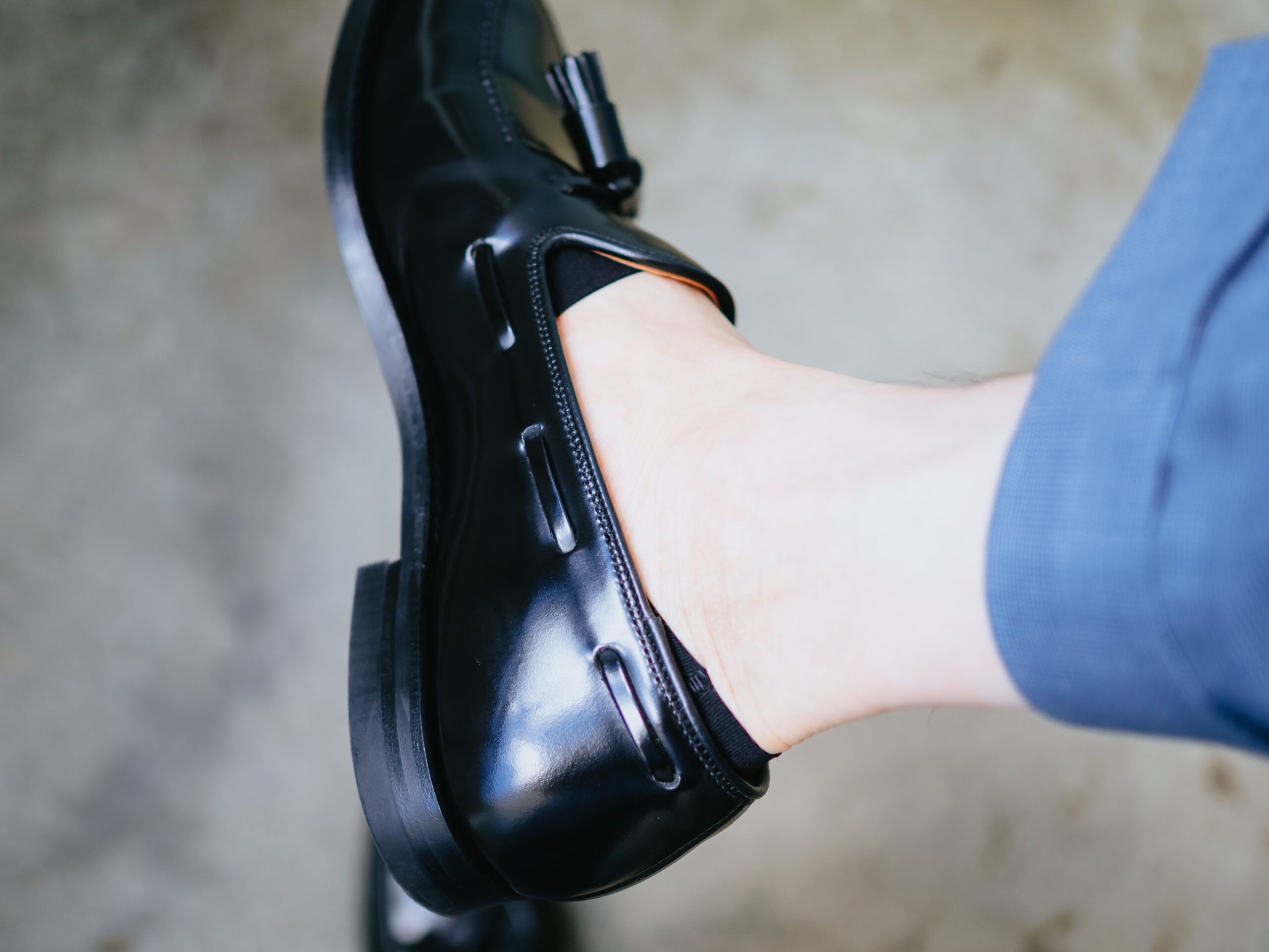 タッセルローファーに合わせてみました。深履きタイプのため、甲の部分が靴下が見えてしまっています。甲が浅い靴に合わせて靴下を見せたくないのであれば、浅履きタイプのほうが良さそうです。