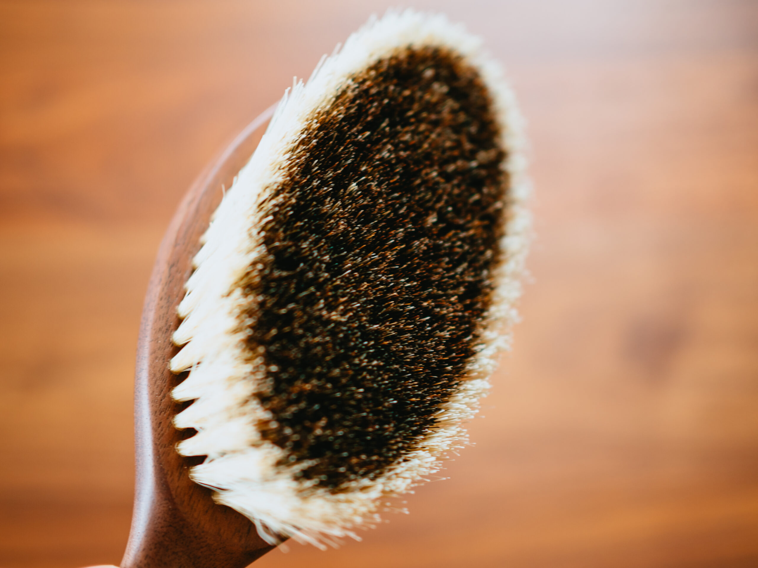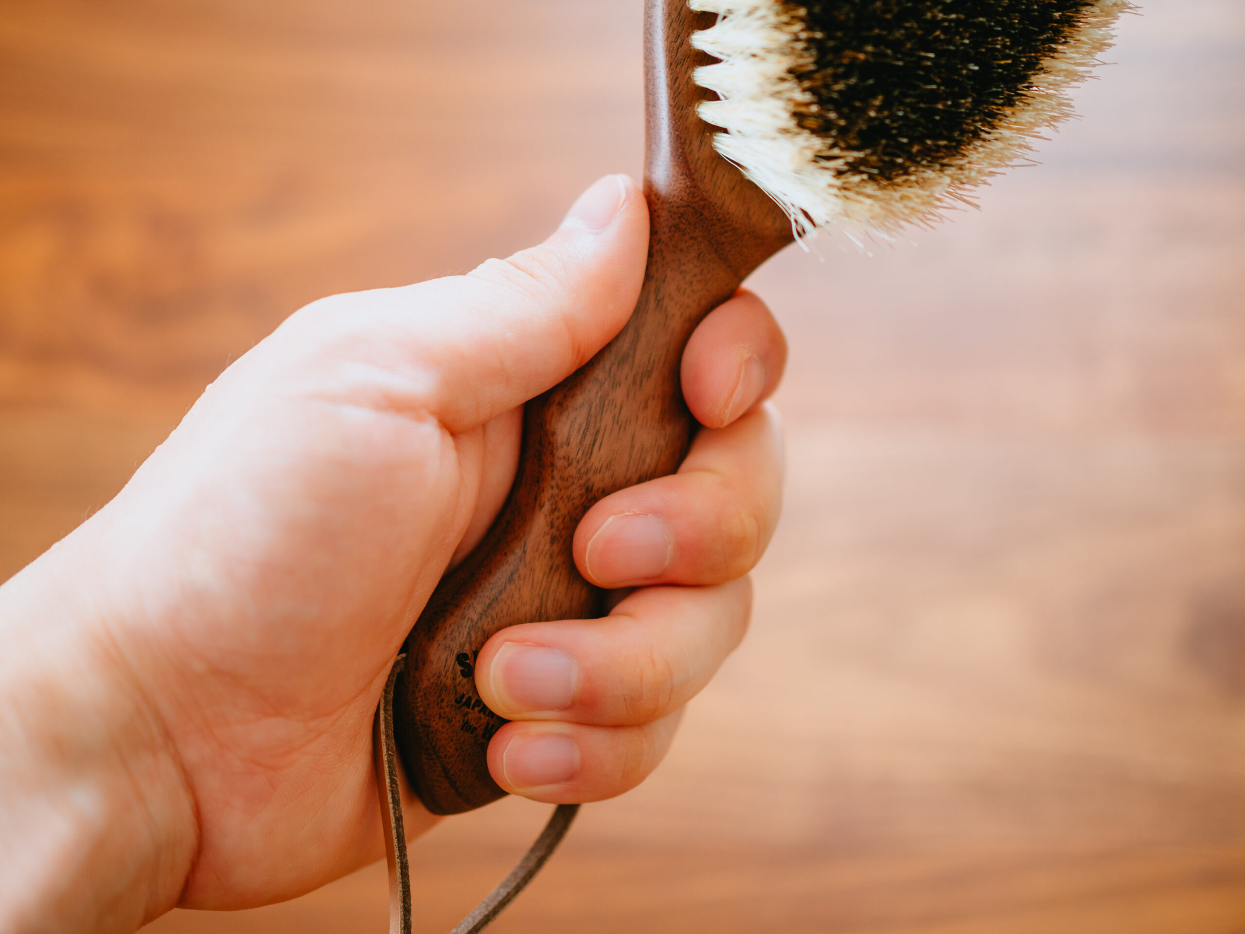 ハリやコシがある硬めの豚毛を外側に少しだけ使うことで、繊維素材を傷めることなく繊維の流れを整えて毛玉を予防します。内側に使われているしなやかで弾力のある細い馬毛はニットなどの編み目の深い部分にも届き、汚れや埃をかき出します。