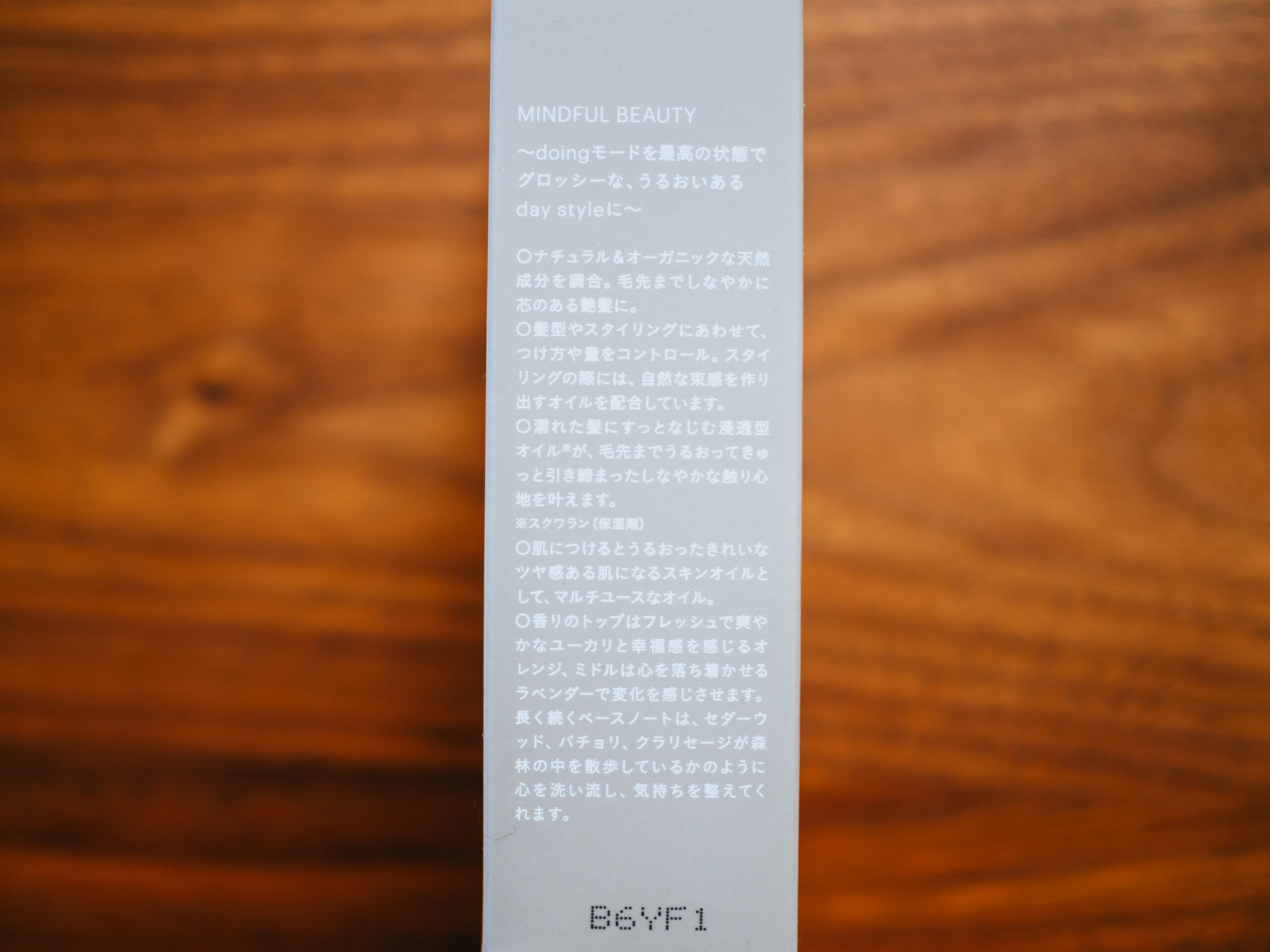 トップノートはフレッシュで爽やかなユーカリとオレンジ。ミドルノートは心を落ち着かせるラベンダー、ベースノートは、セダーウッド、パチョリ、クラリセージとハーブ系の香りに変わっていきます。付けたときは香りが広がりますが、持続時間は短めで香りも弱いので、香り重視の人には物足りないかもしれませんが、強い香りが苦手な人にはちょうど良いバランスです。