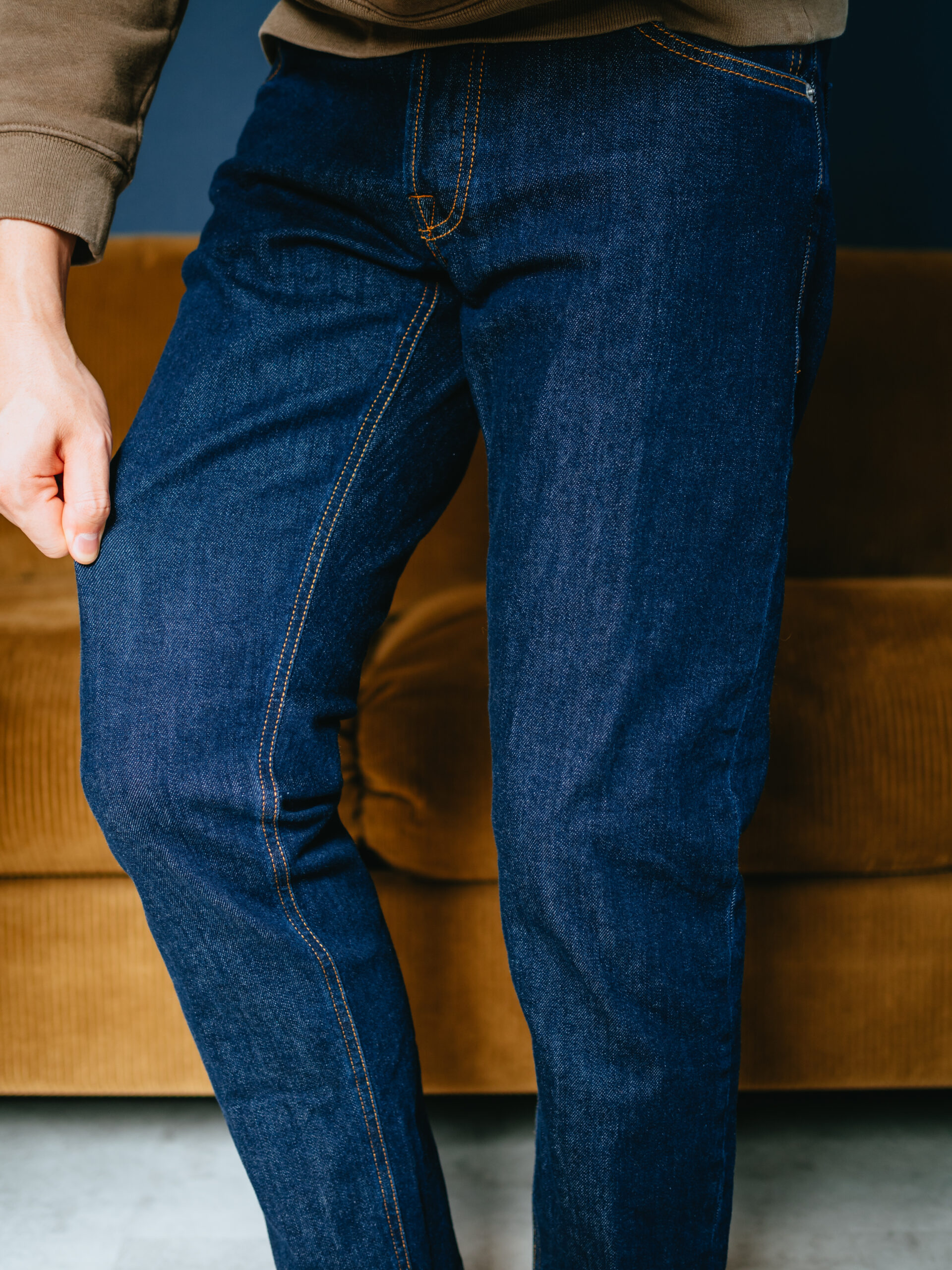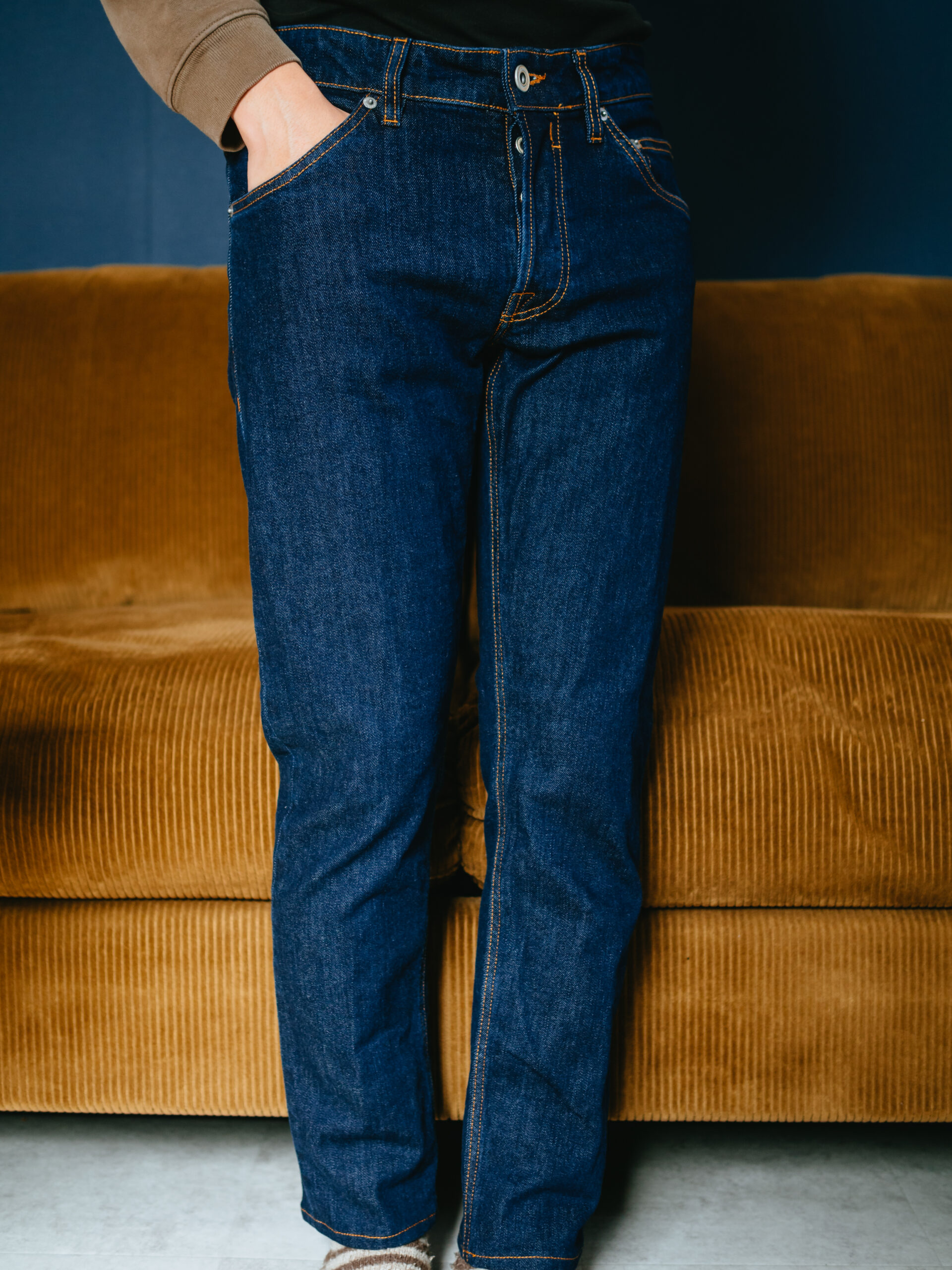 ポリウレタン混で伸縮性があるので、カジュアル使いで気軽にストレスなく履ける快適な穿き心地です。綿100%の固いデニムばかり履いていたので、全く異なる履き心地に感動。
