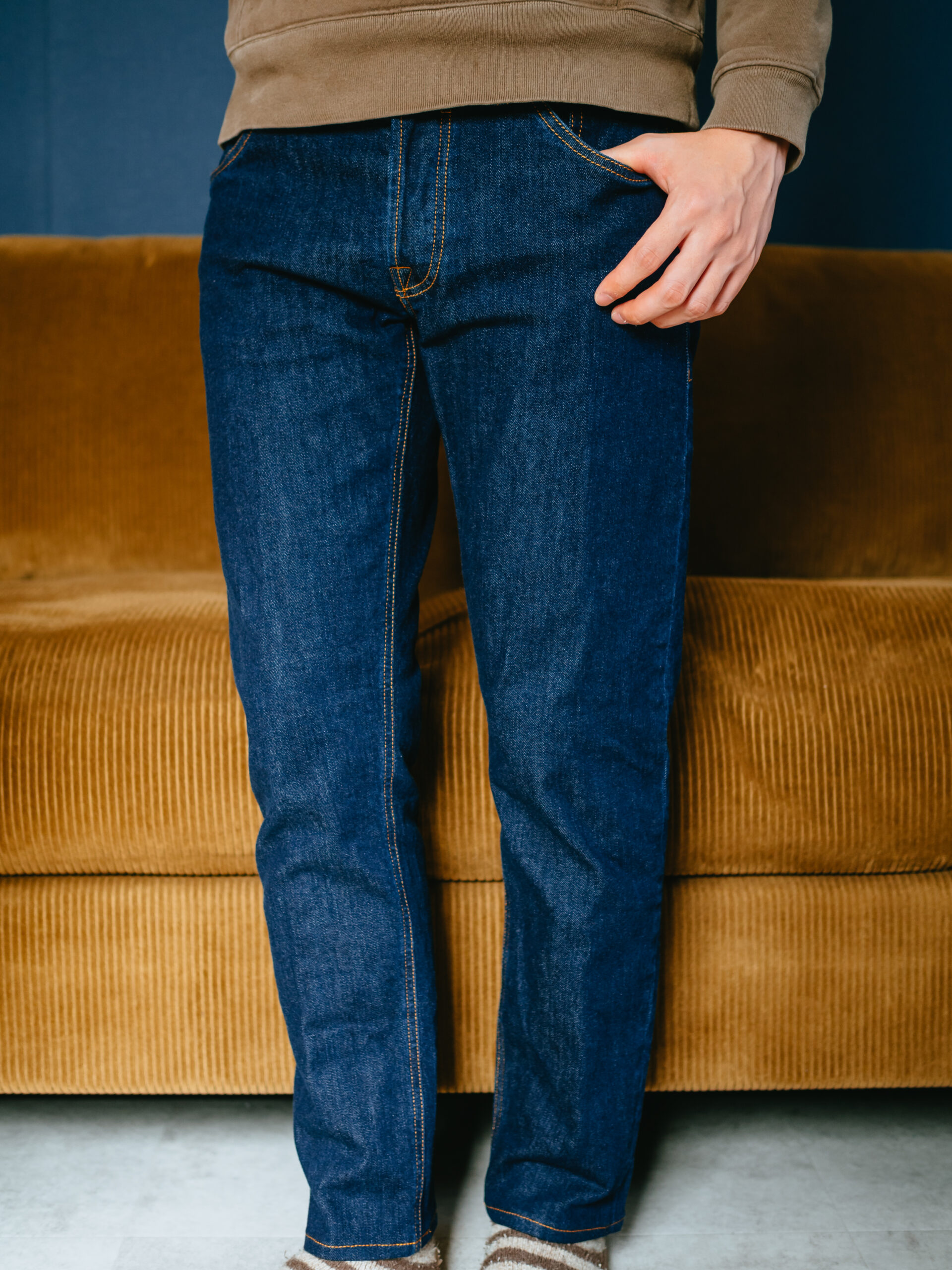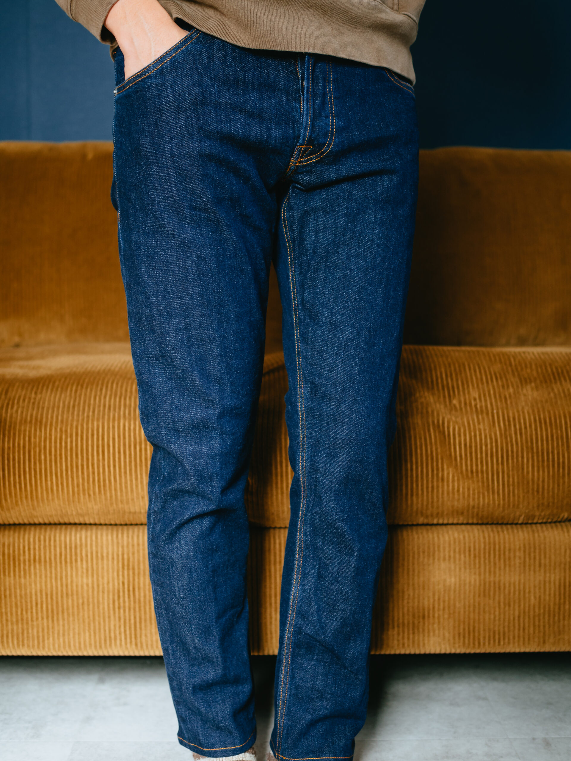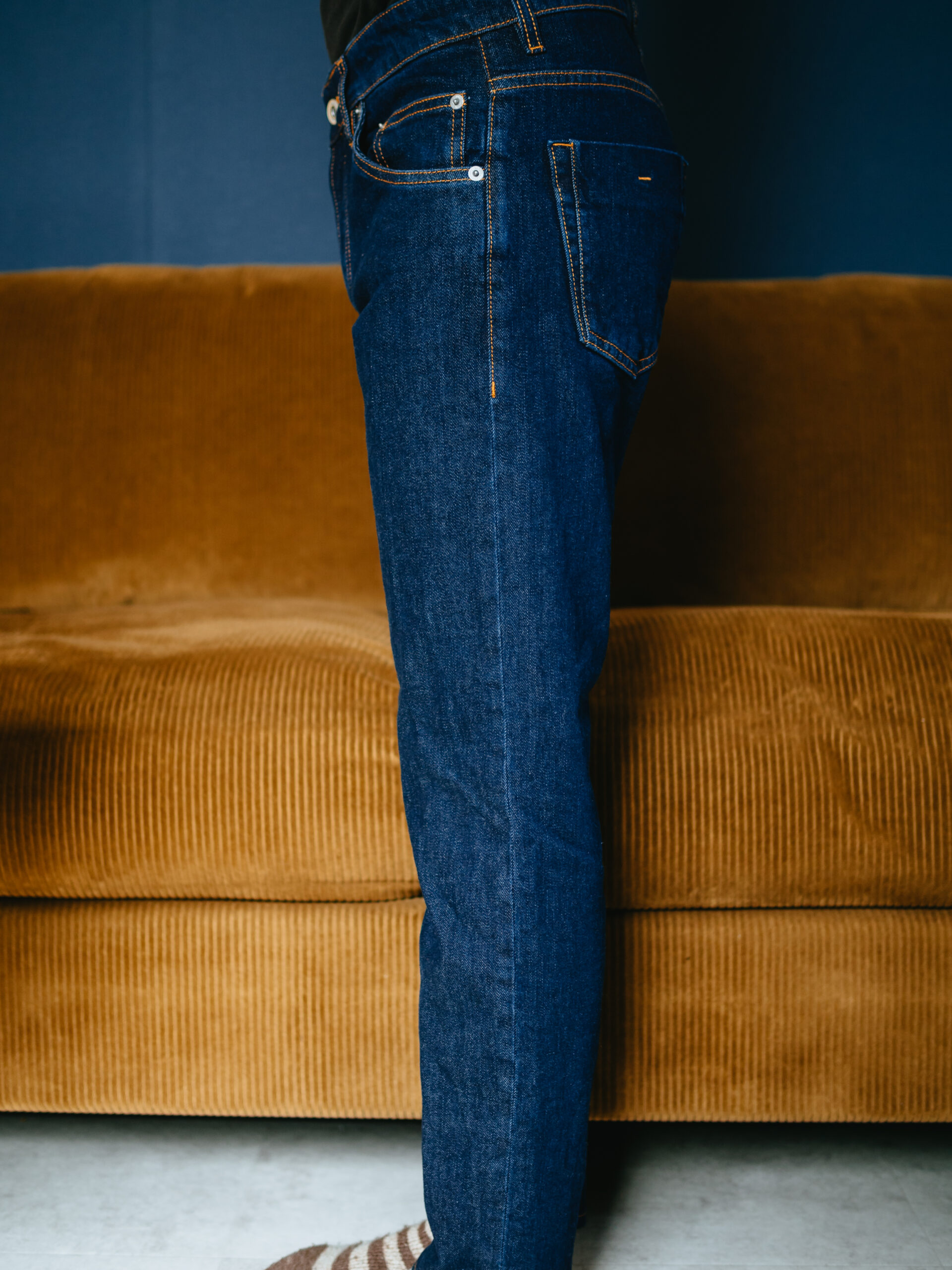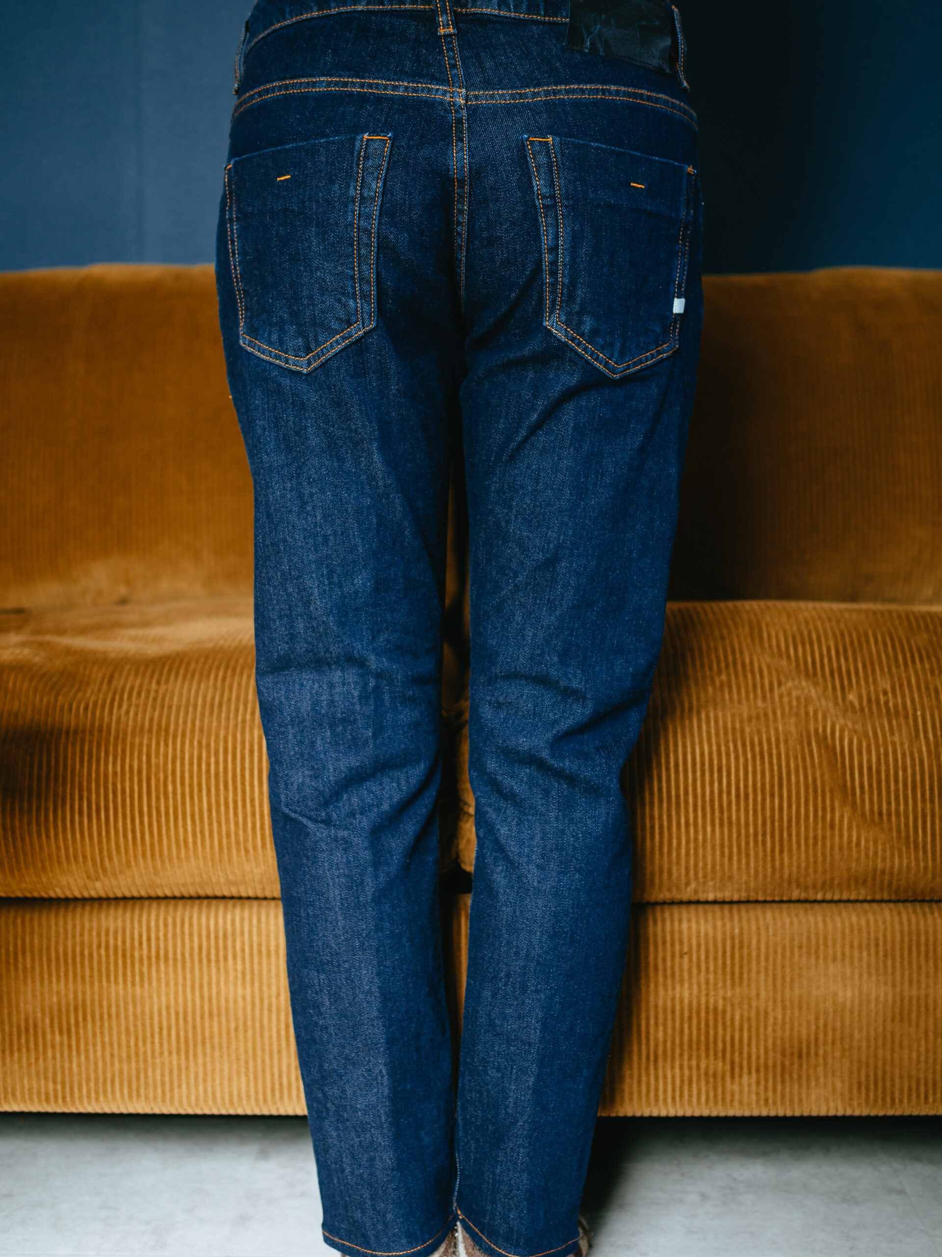 おさまりの良い深さの股上。ややテーパードのかかった細身の美脚シルエットはイタリアデニムらしいモダンなパターンです。