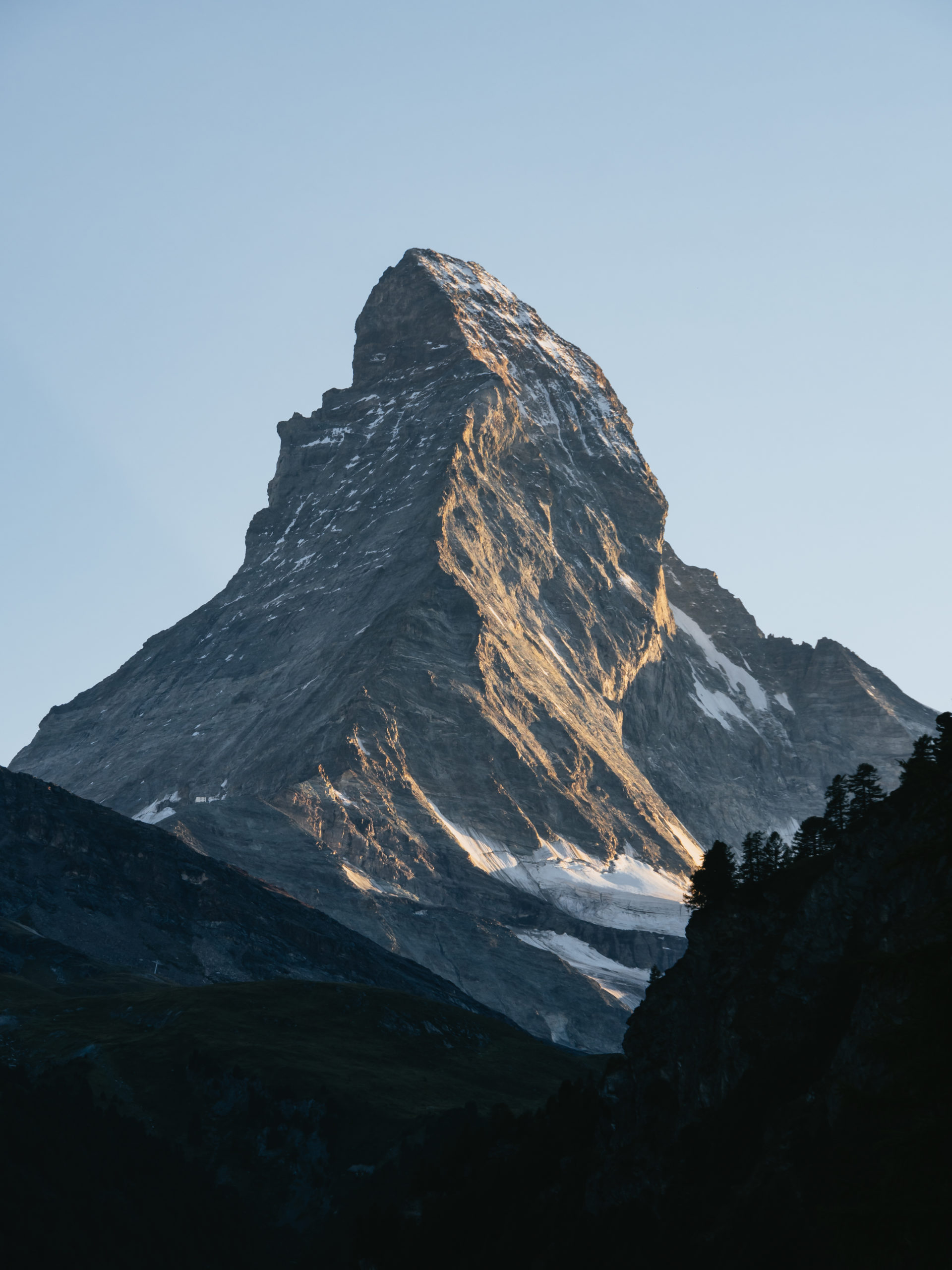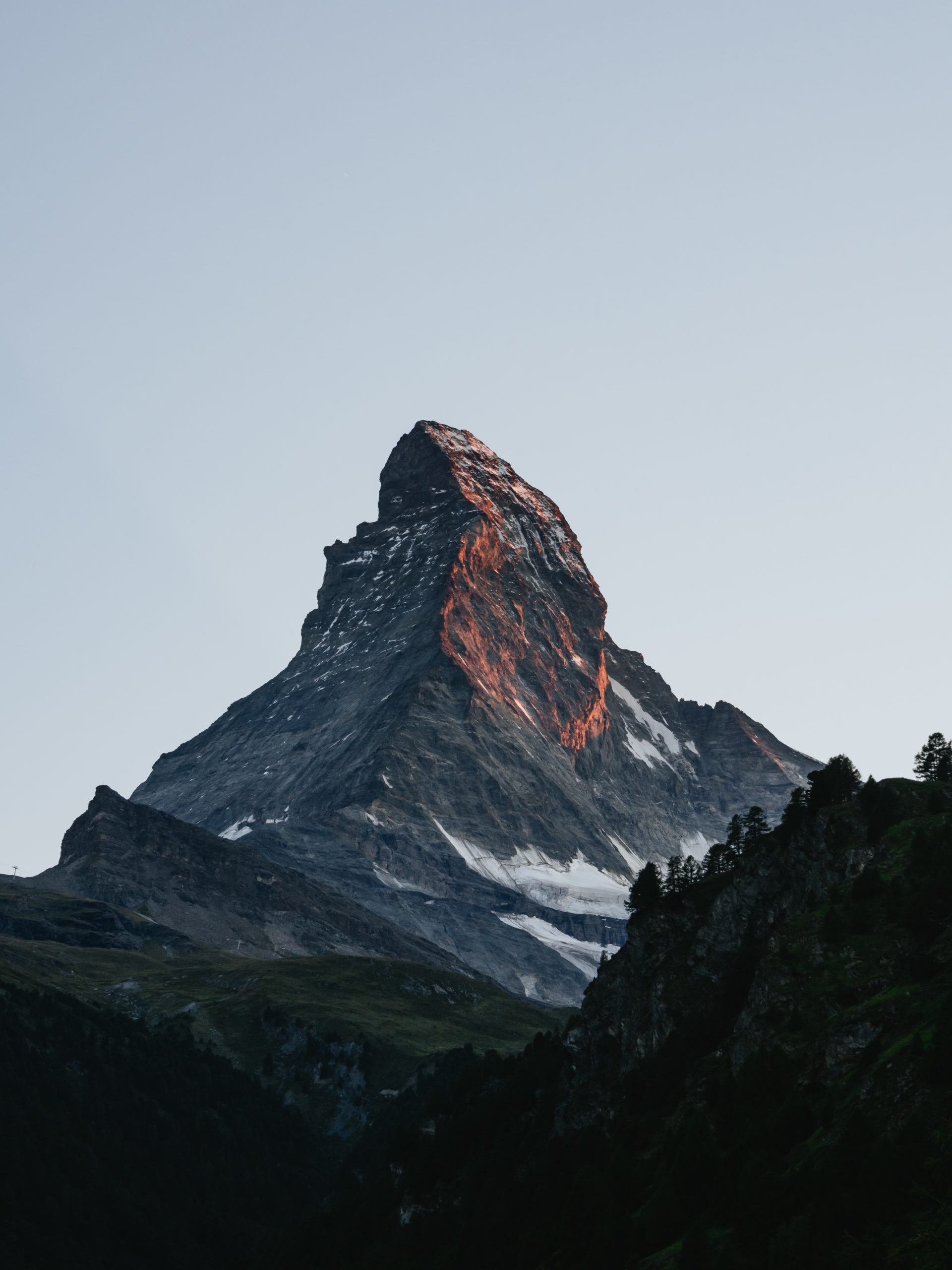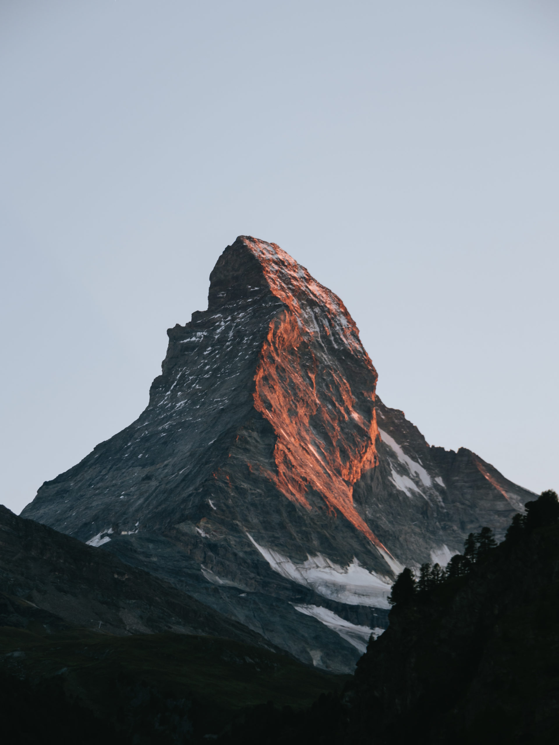 夕日に照らされるマッターホルン。ツェルマットの街からでも十分眺めることができます。
