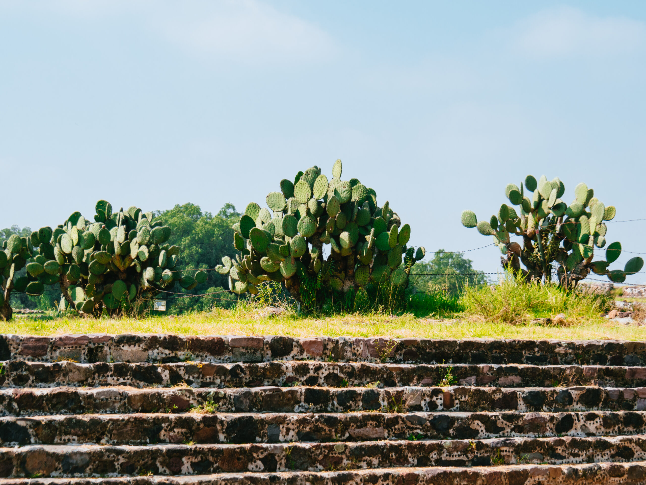 Puerta 2から入ってしまったので、南にあるケツァルコアトル神殿に行くため、20〜30分ほど歩きました。段差の高い階段を上って下ってのアップダウンばかり、たまに上り下りを避けるために左右から回り道をしたりとなかなかハードですが、道中にメキシコらしいサボテンの風景などもあるので、時間に余裕があれば休憩しながらゆっくり散歩するのも良さそうです。