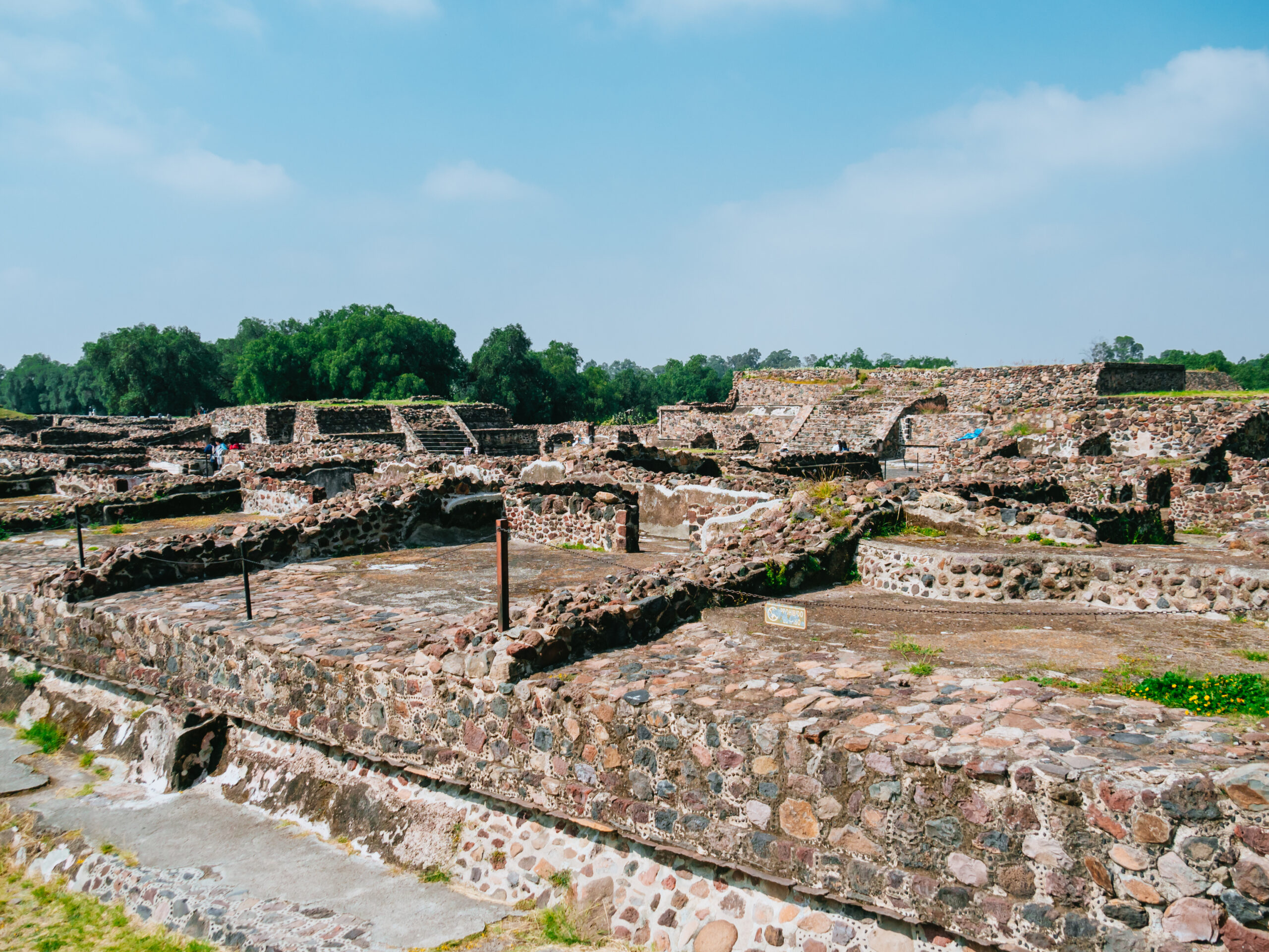 向かって左側のケツァルパパロトル宮殿付近に登れるところがあるので、そこから撮ると全体像を収めることができます。