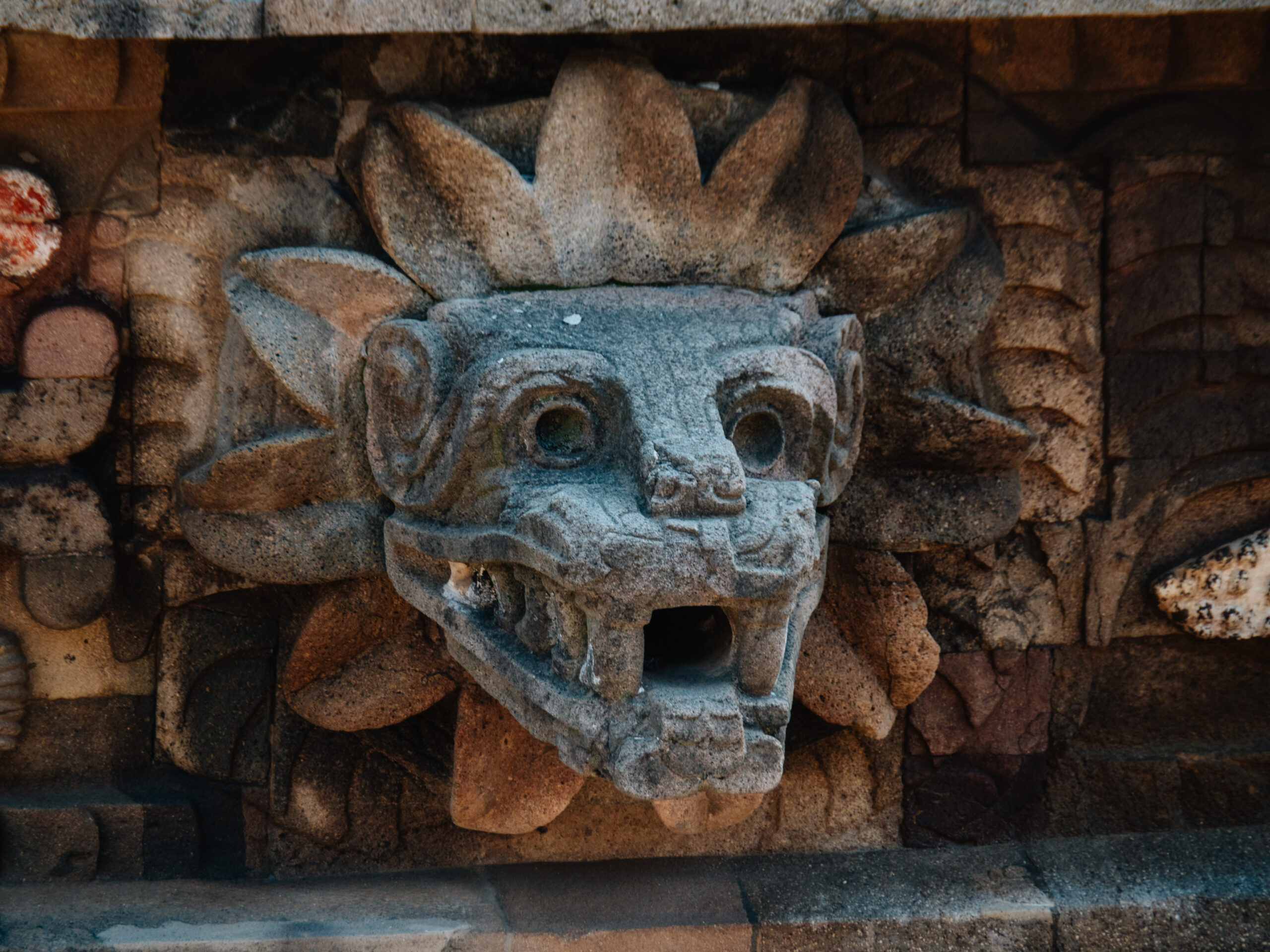階段登ってスロープを下ると、目の前にケツァルコアトルとトラロックの顔の像で装飾されたピラミッドが現れます。個人的に遺跡内で最も見どころの遺跡だと思います。かつては極彩色に彩られていたそうです。