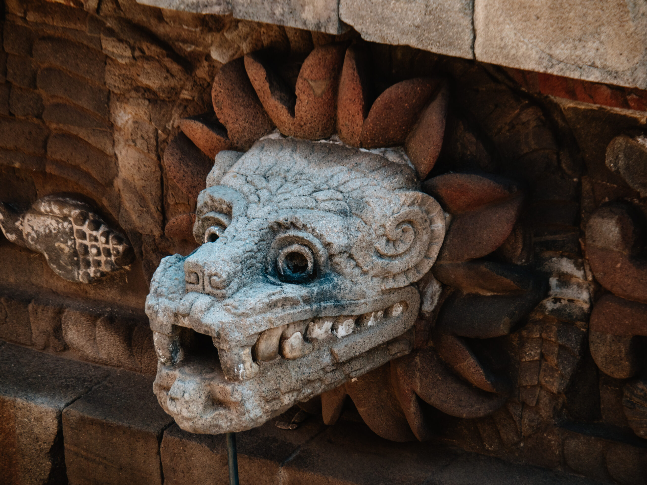 ケツァルコアトルは、古代ナワトル語で「羽毛ある蛇」(ケツァルが鳥の名前(キヌバネドリ科)、コアトルが蛇)を意味し、古代メソアメリカ諸文明で広く信仰されていた農耕神。民衆に文明を与えた文化神、風の神とも考えられています。