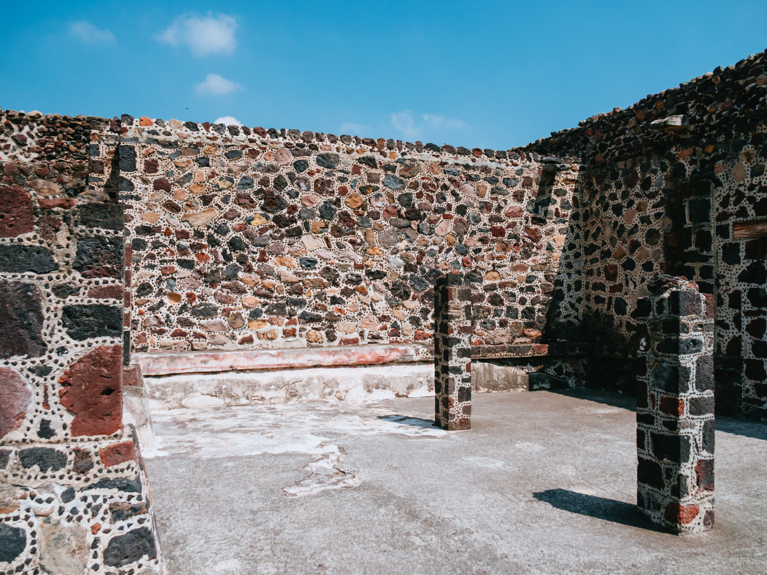 「ケツァルパパロトル宮殿(Palacio de Quetzalpapálotl)」は、当時のテオティワカン建造物の姿を最も完全に近い状態で復元した遺跡です。