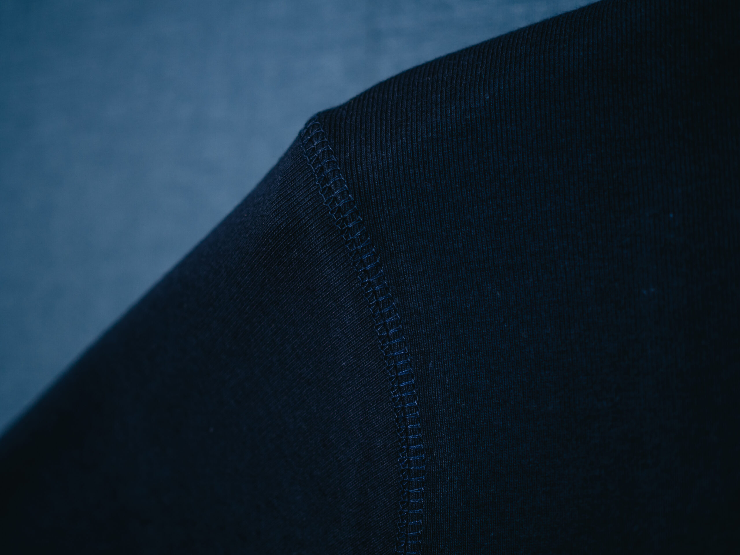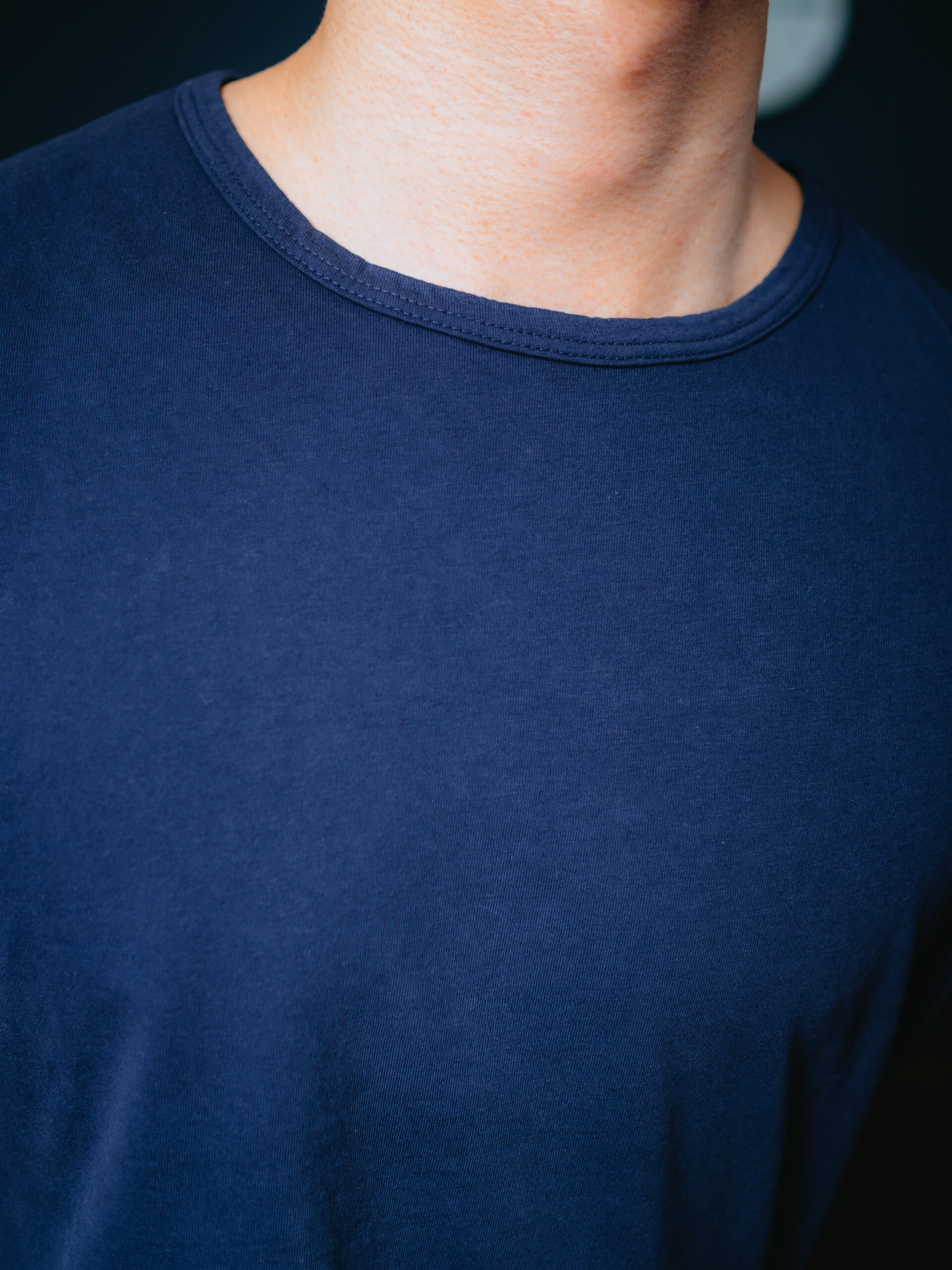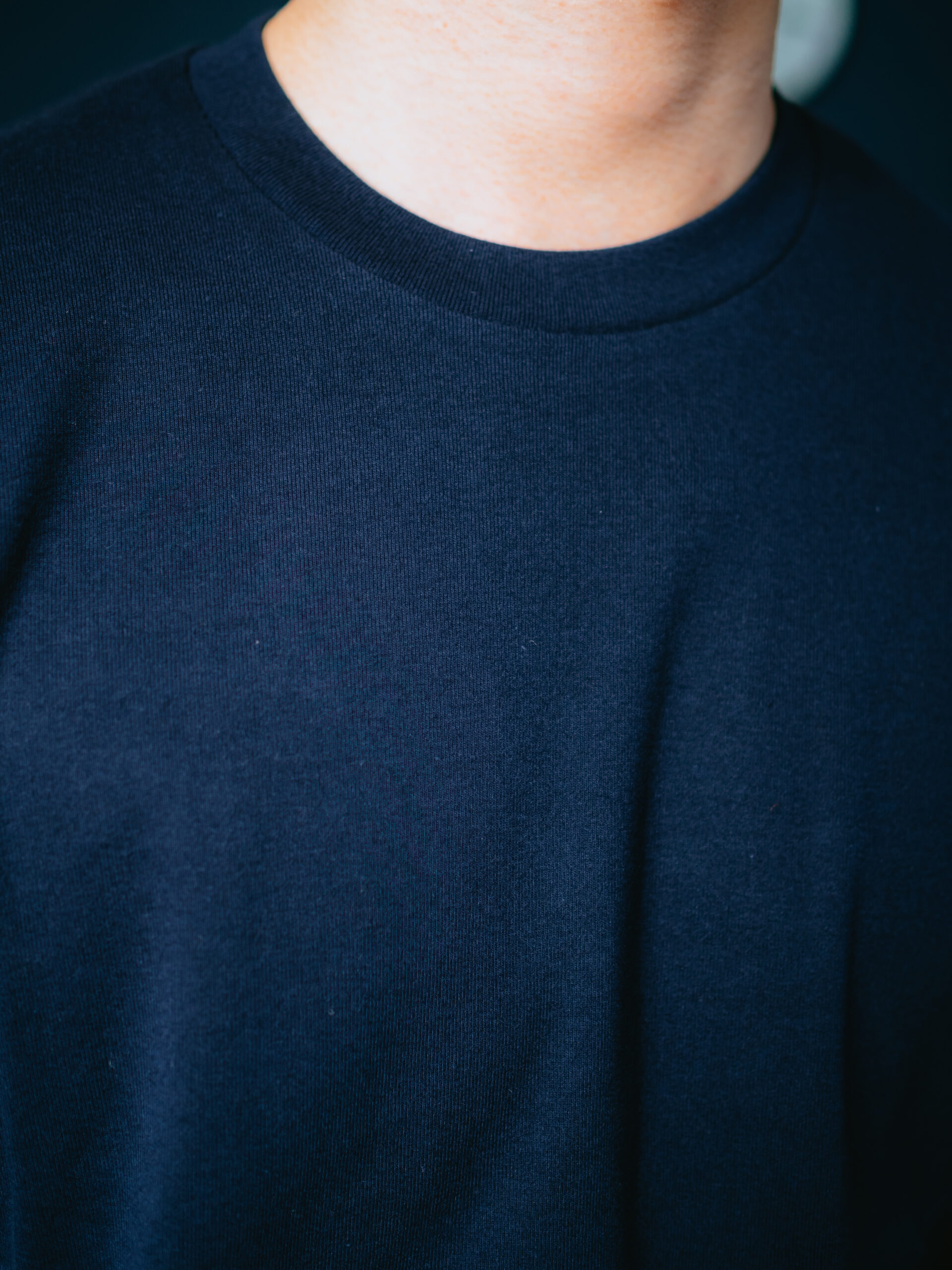 どちらもクルーネック。Jamesのほうが首の開口部が広く、襟幅は短め。ダブルステッチで縫われており、首元がよれるのを防止します。