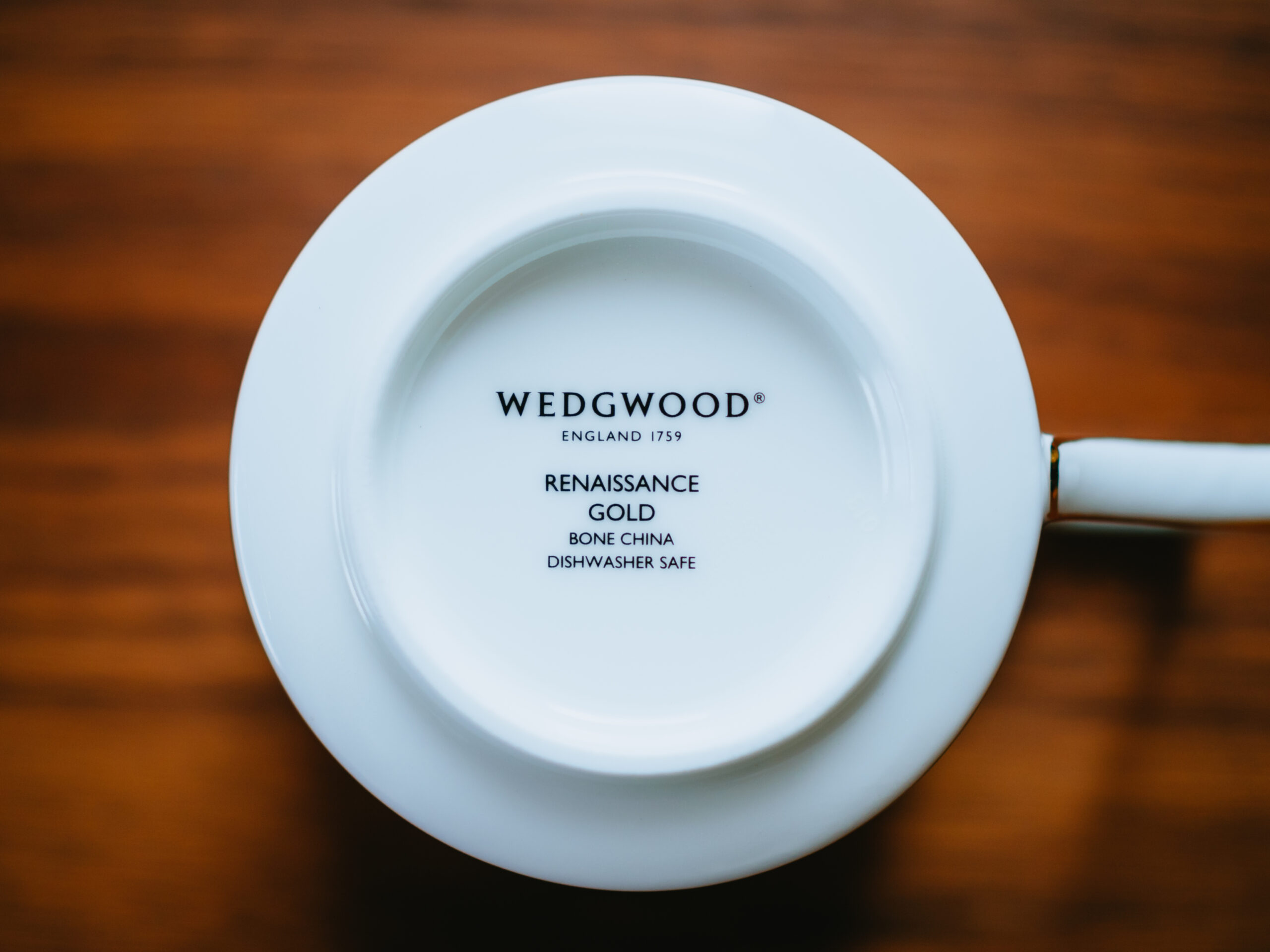 カップとソーサーの裏底にロゴの刻印があります。上述した通り強度が高い素材なので、食器洗い機も使用OK